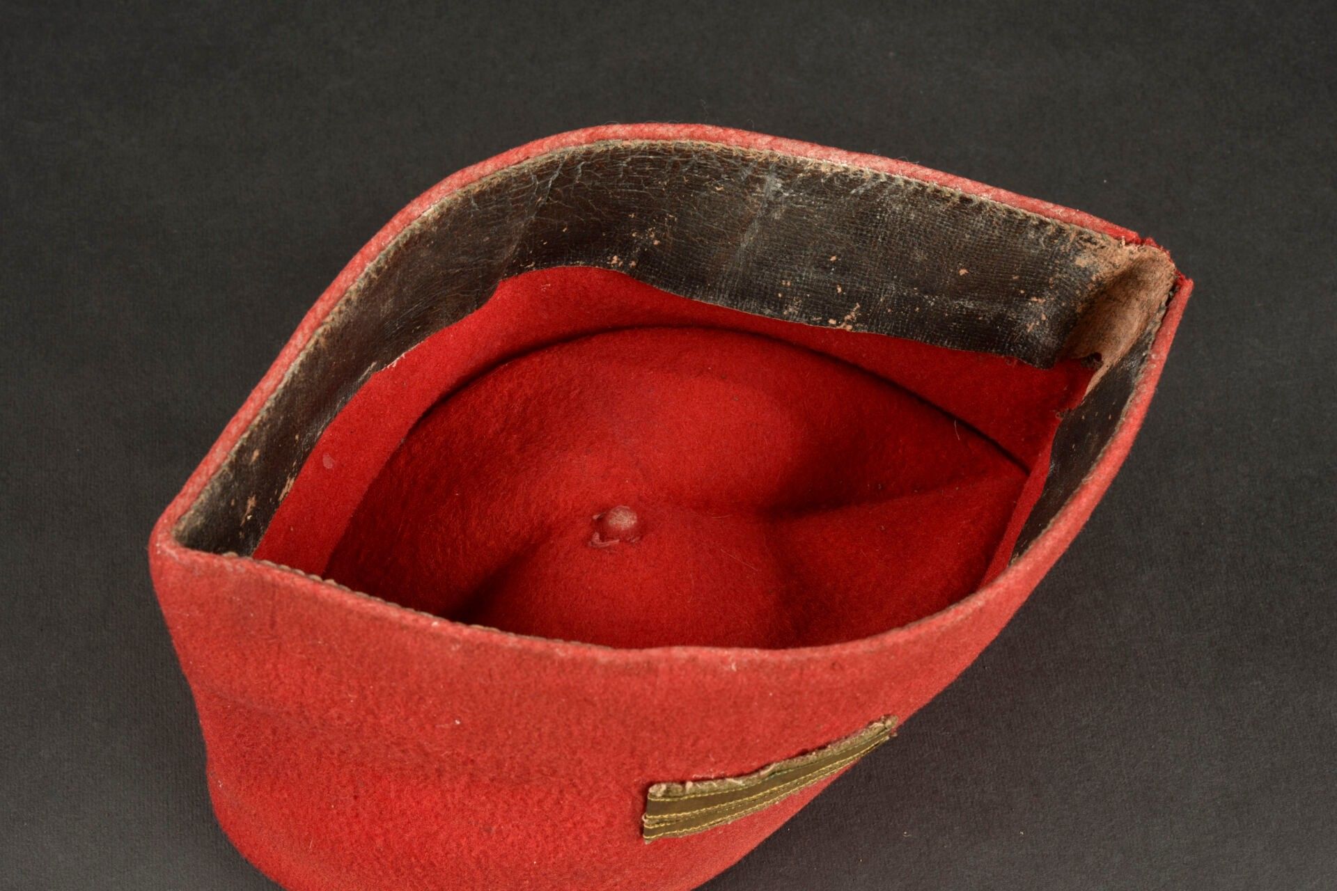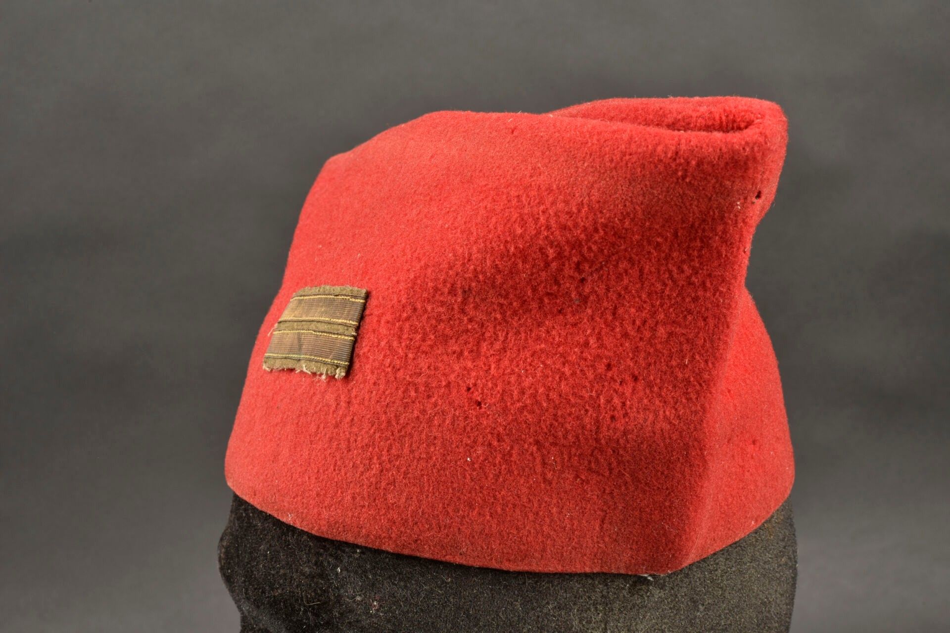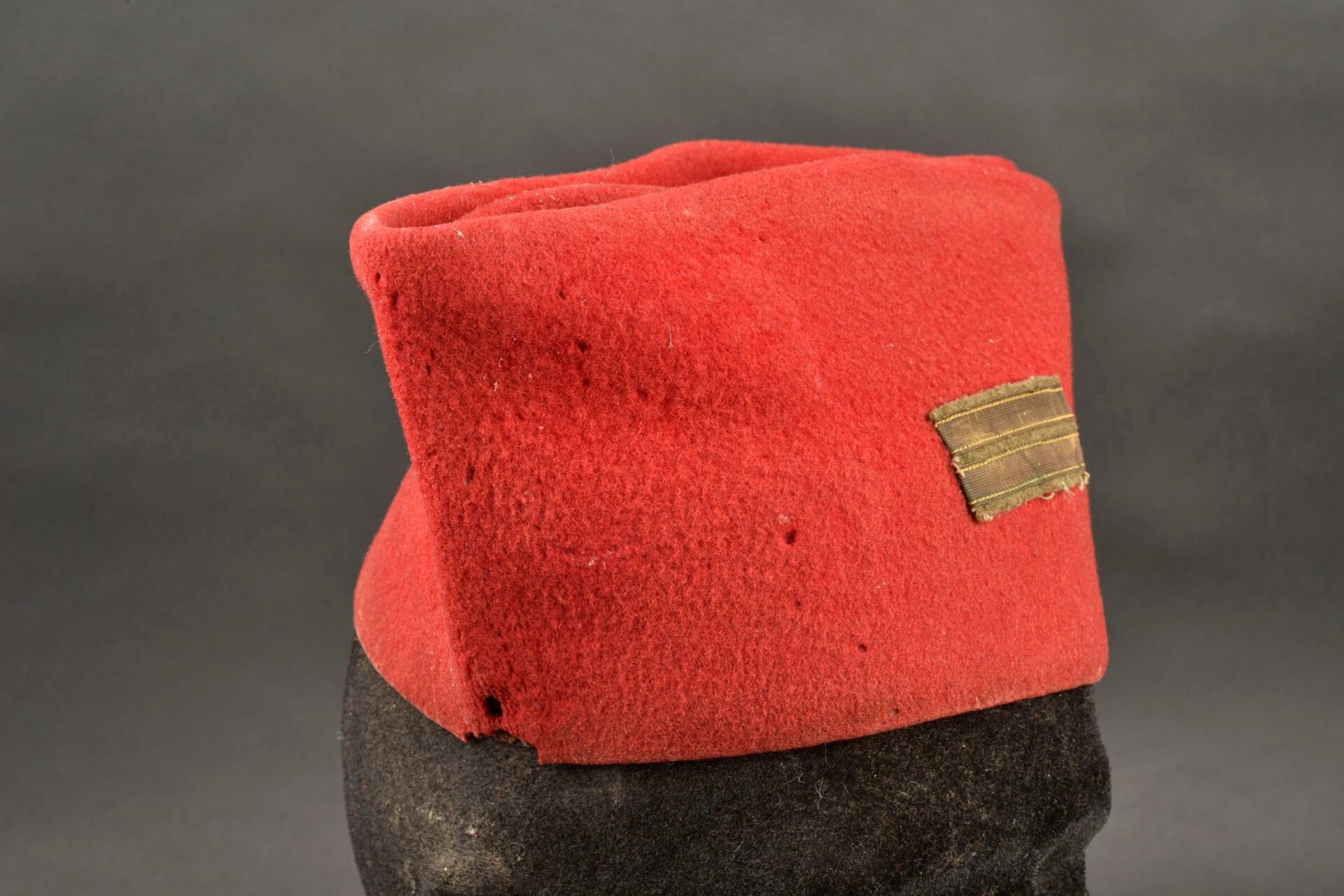 Chechia of a Tirailleurs lieutenant. Scarlet cloth with black basane sweatband. Lieutenant's rank gilt on mustard cloth background. Some moth holes, wear, patina II.