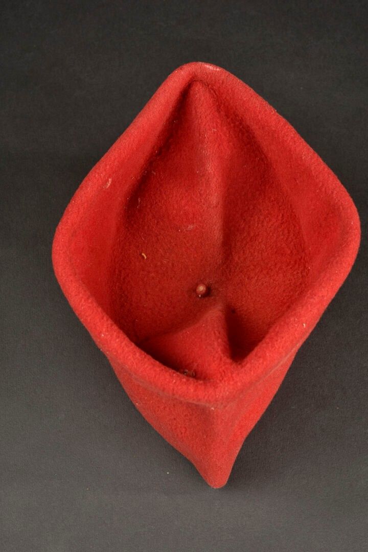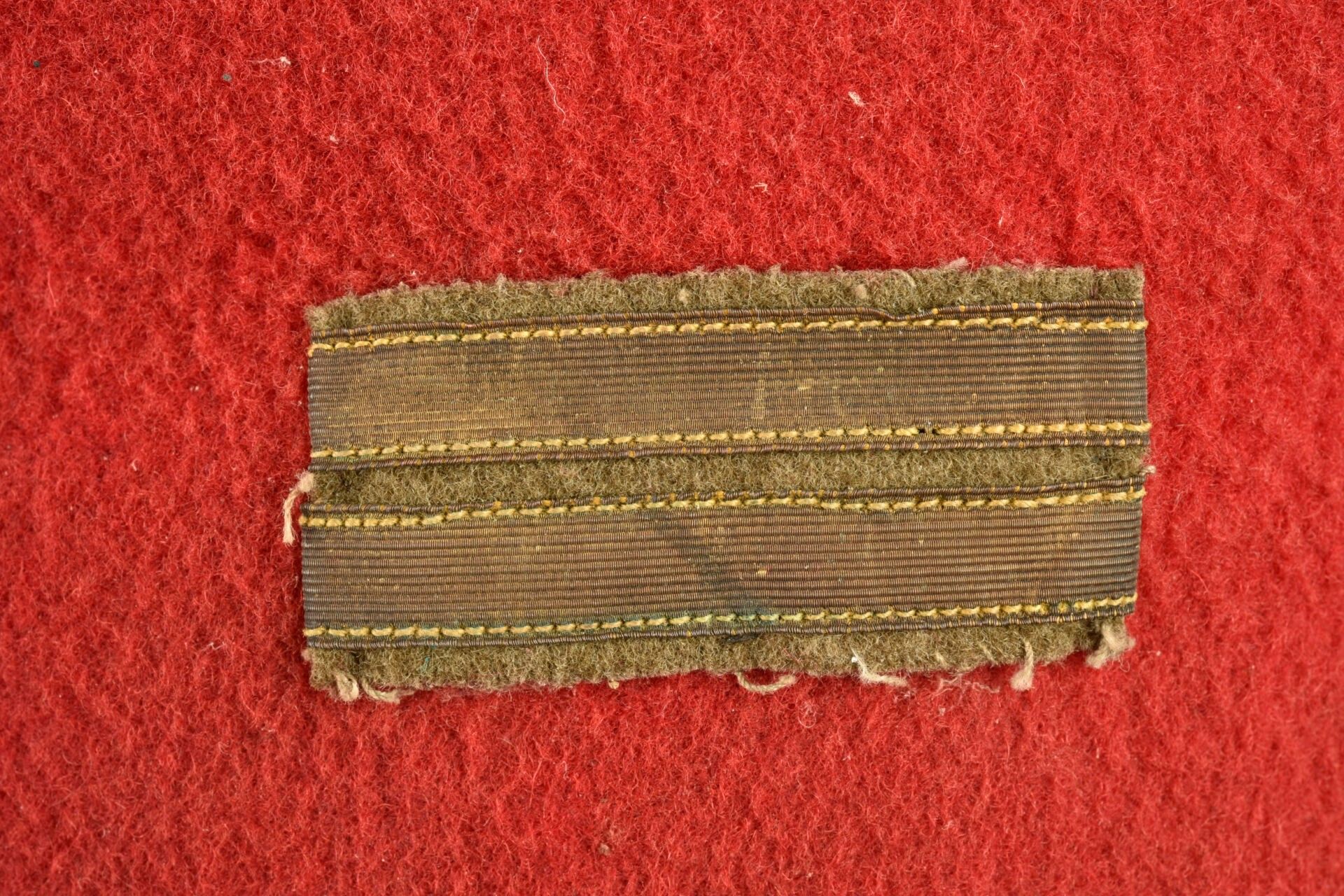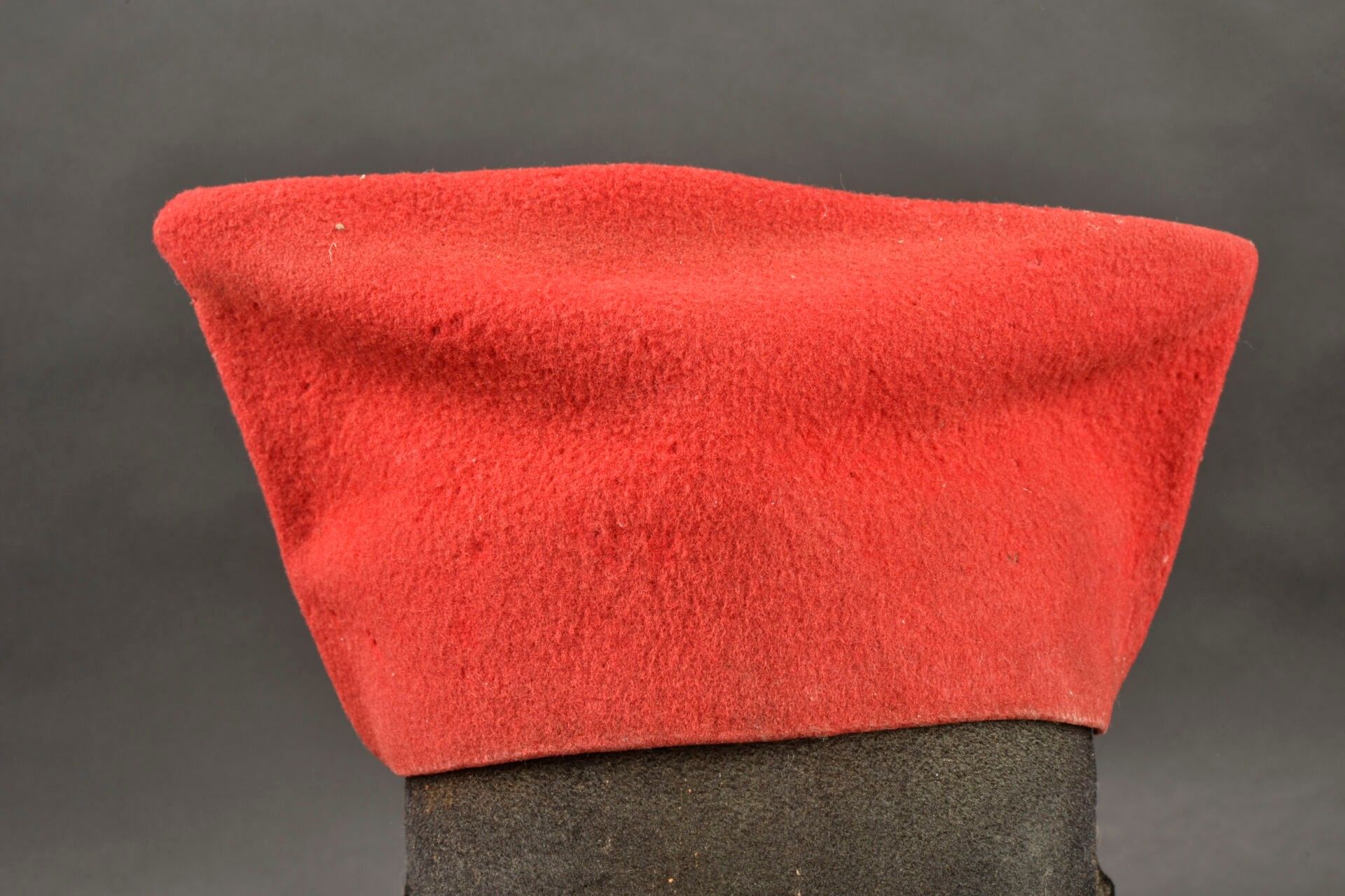Chechia of a Tirailleurs lieutenant. Scarlet cloth with black basane sweatband. Lieutenant's rank gilt on mustard cloth background. Some moth holes, wear, patina II.