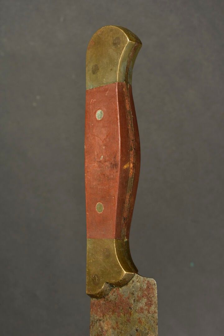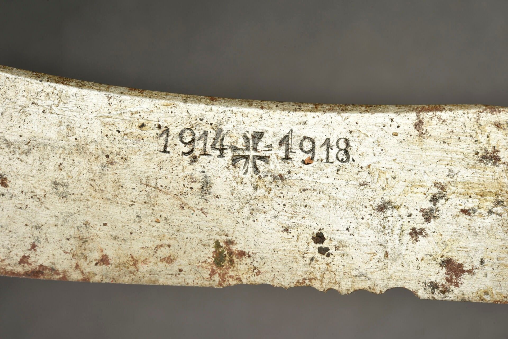 Set of 3 trench knives. 2 with wood plates, one with fibre plates. Brass fittings. One large Bowie-type blade engraved with an iron cross and dates 1914 1918, blunt, total length 32 cm, without scabbard. A medium 31.2 cm, with a wooden scabbard, a third 26.5 cm, without scabbard. Wear, patina, rust, needs cleaning II