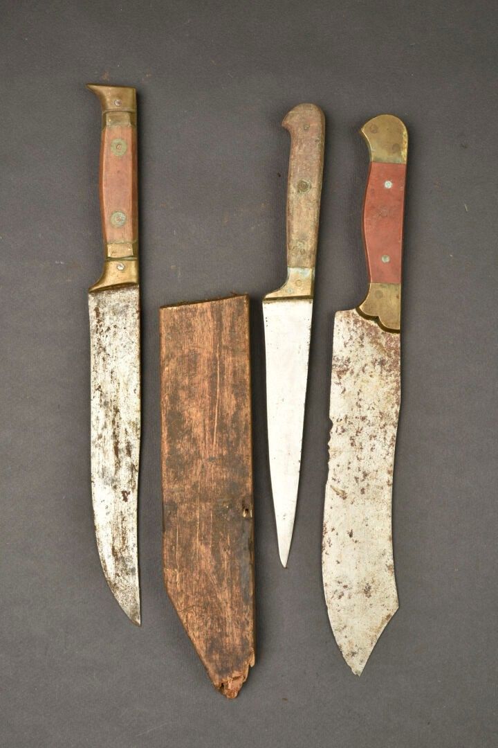 Set of 3 trench knives. 2 with wood plates, one with fibre p…