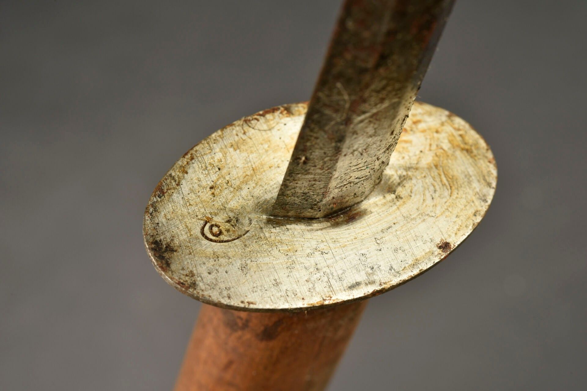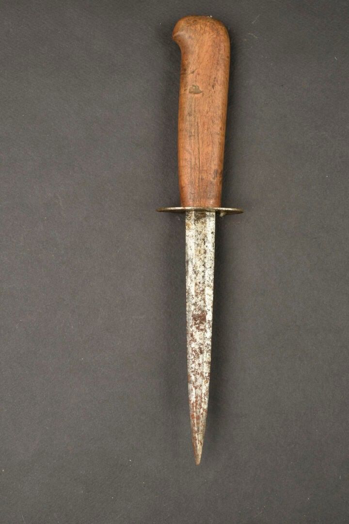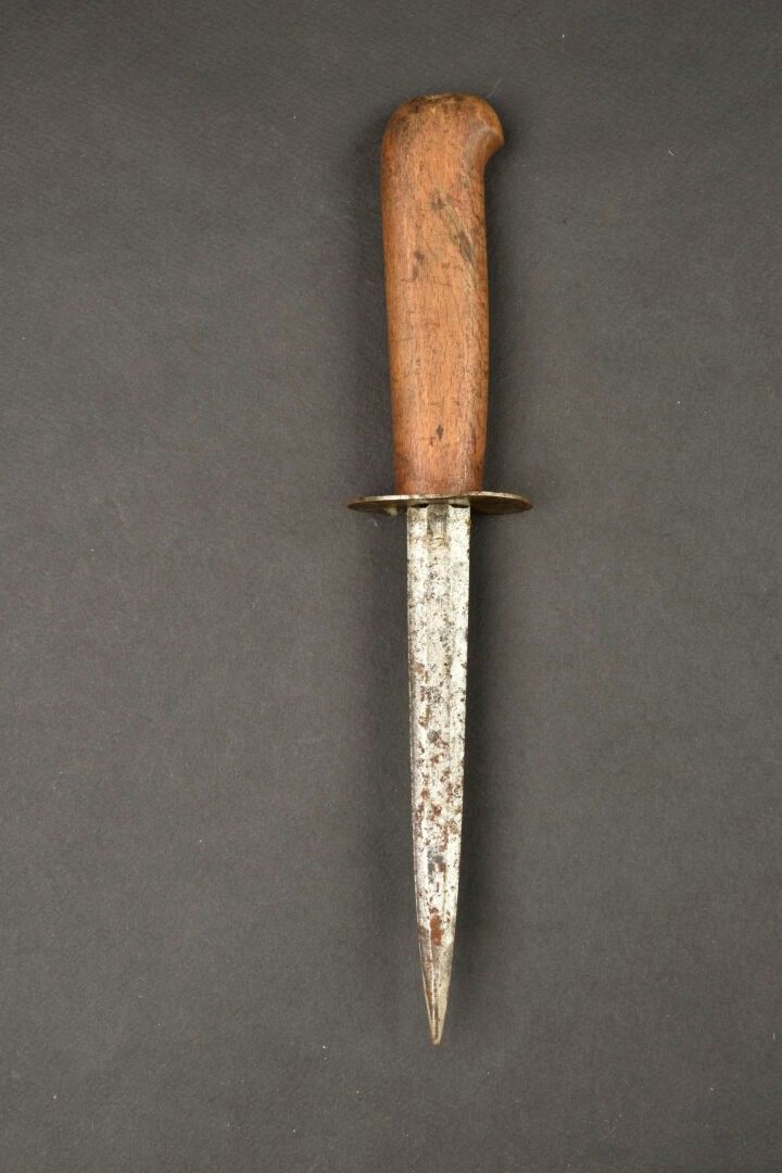 Coutrot number 6 combat dagger. Wooden handle, rusty 15.3 cm blade. Oval hilt marked GP corresponding to the maker Georges Page. No scabbard. For adults only.