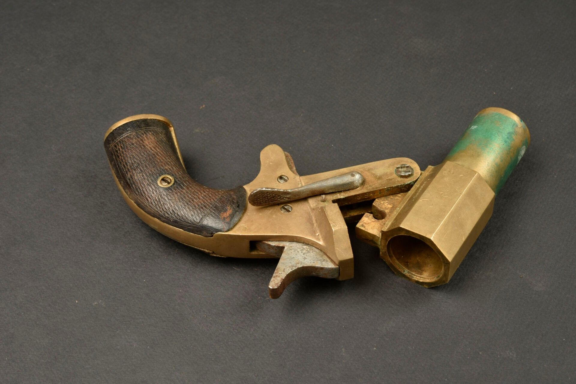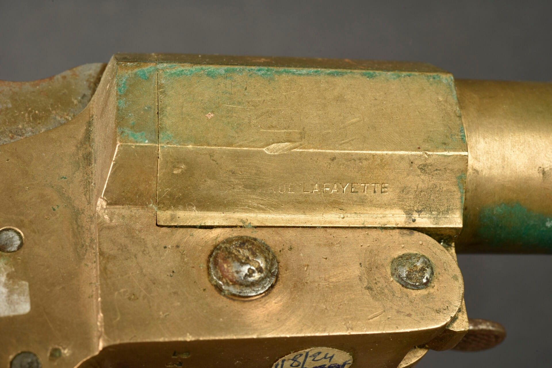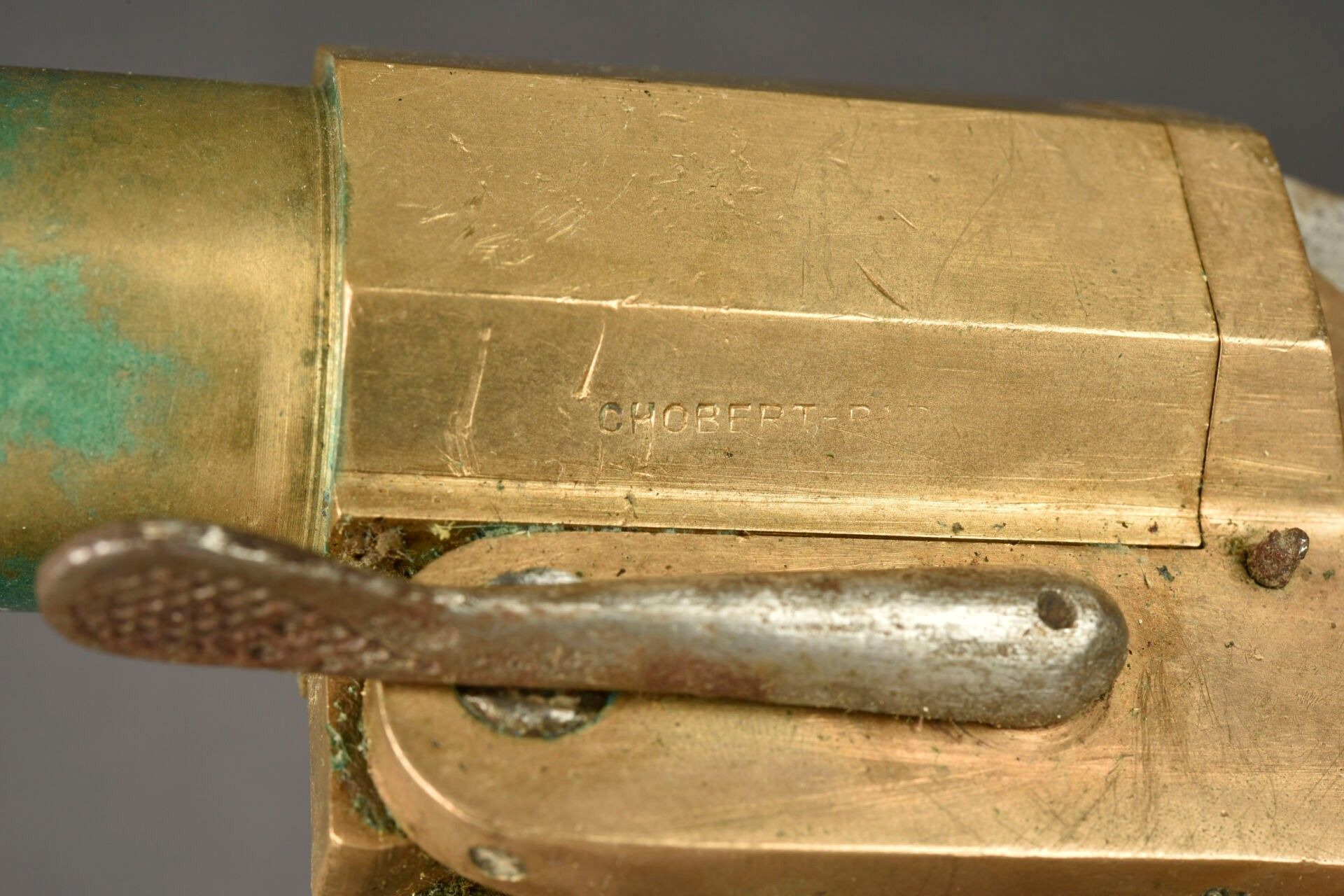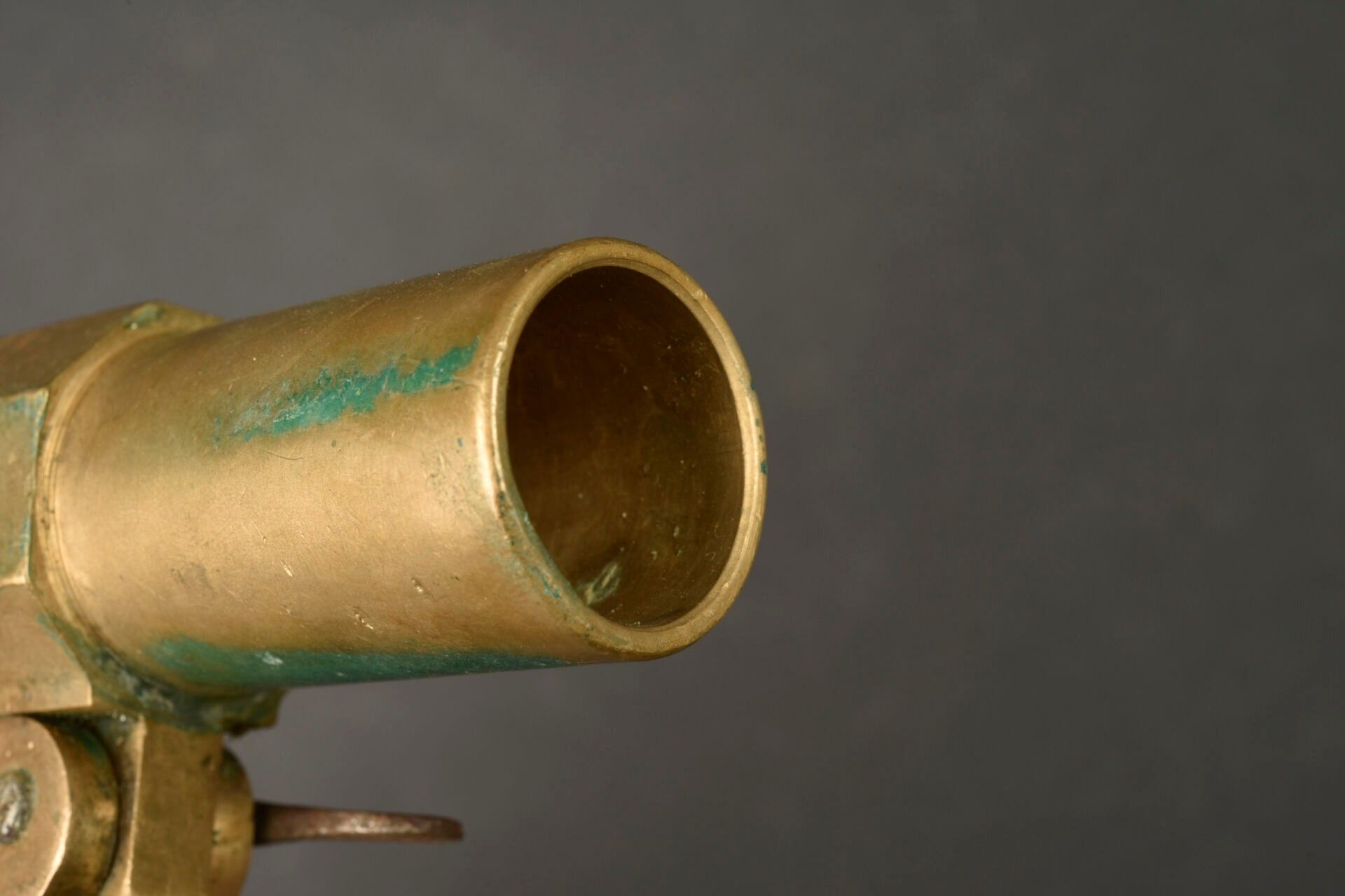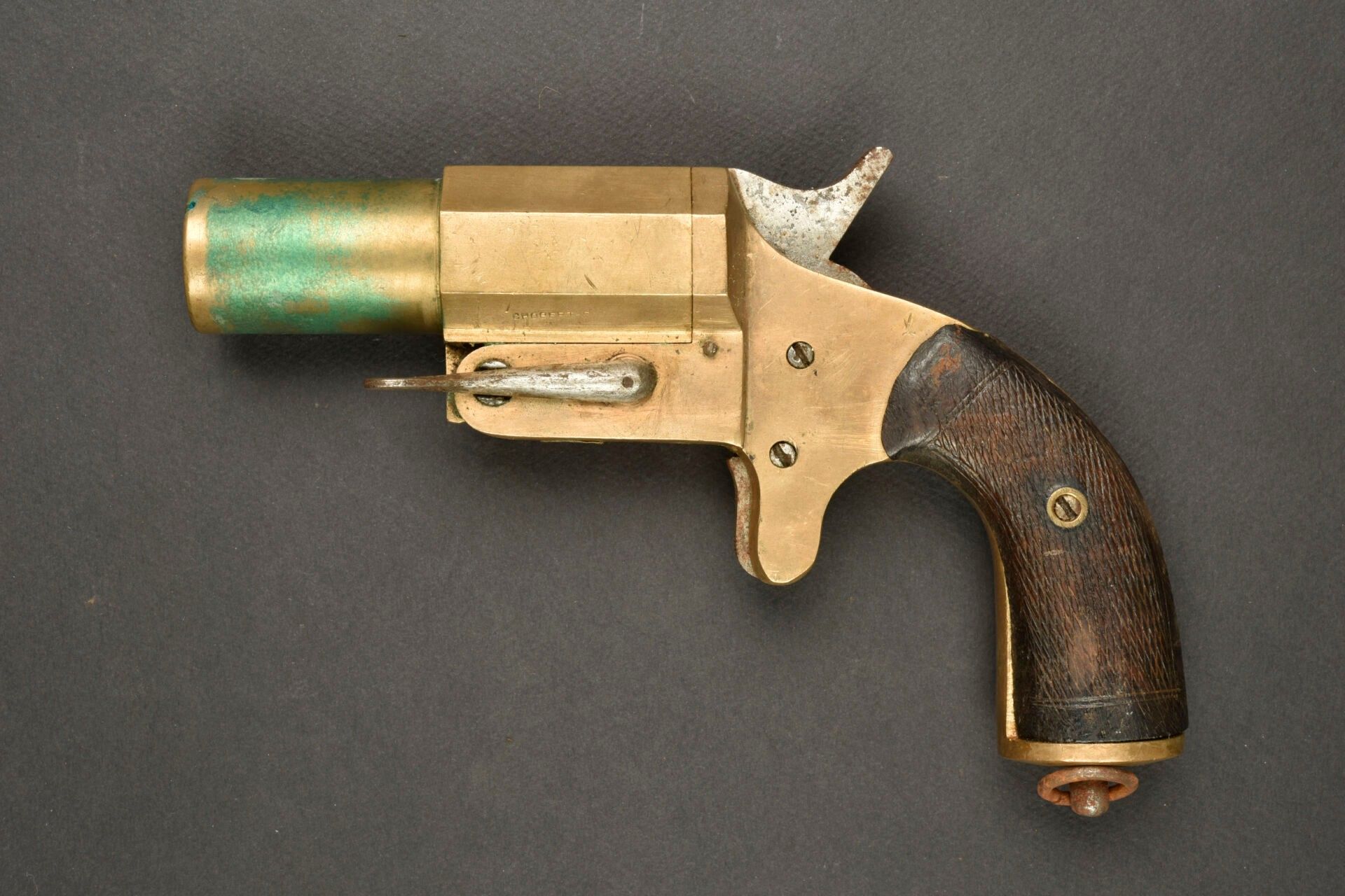1917 Chobert short rocket pistol. Bronze, squared wooden plates. Marking on the sides of the barrel of the manufacturer Chobert and Lafayette street, this last partially erased. Serial number on bottom 23392. Functional bolt, toggle, cocking and percussion mechanisms. Grenadière ring present. Slight oxidation, needs cleaning. Free of acquisition and of detention for person major II