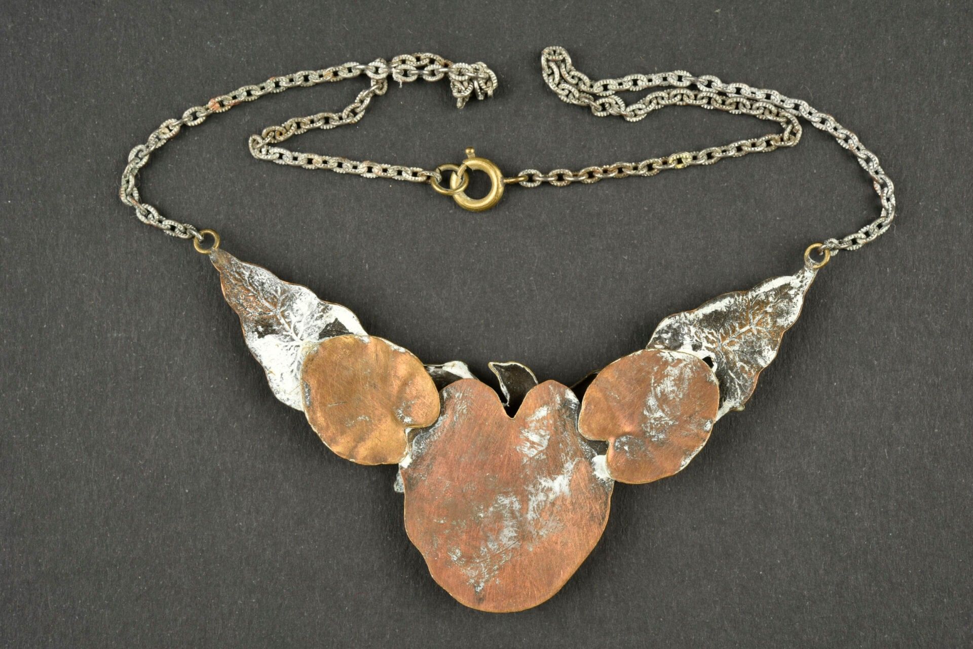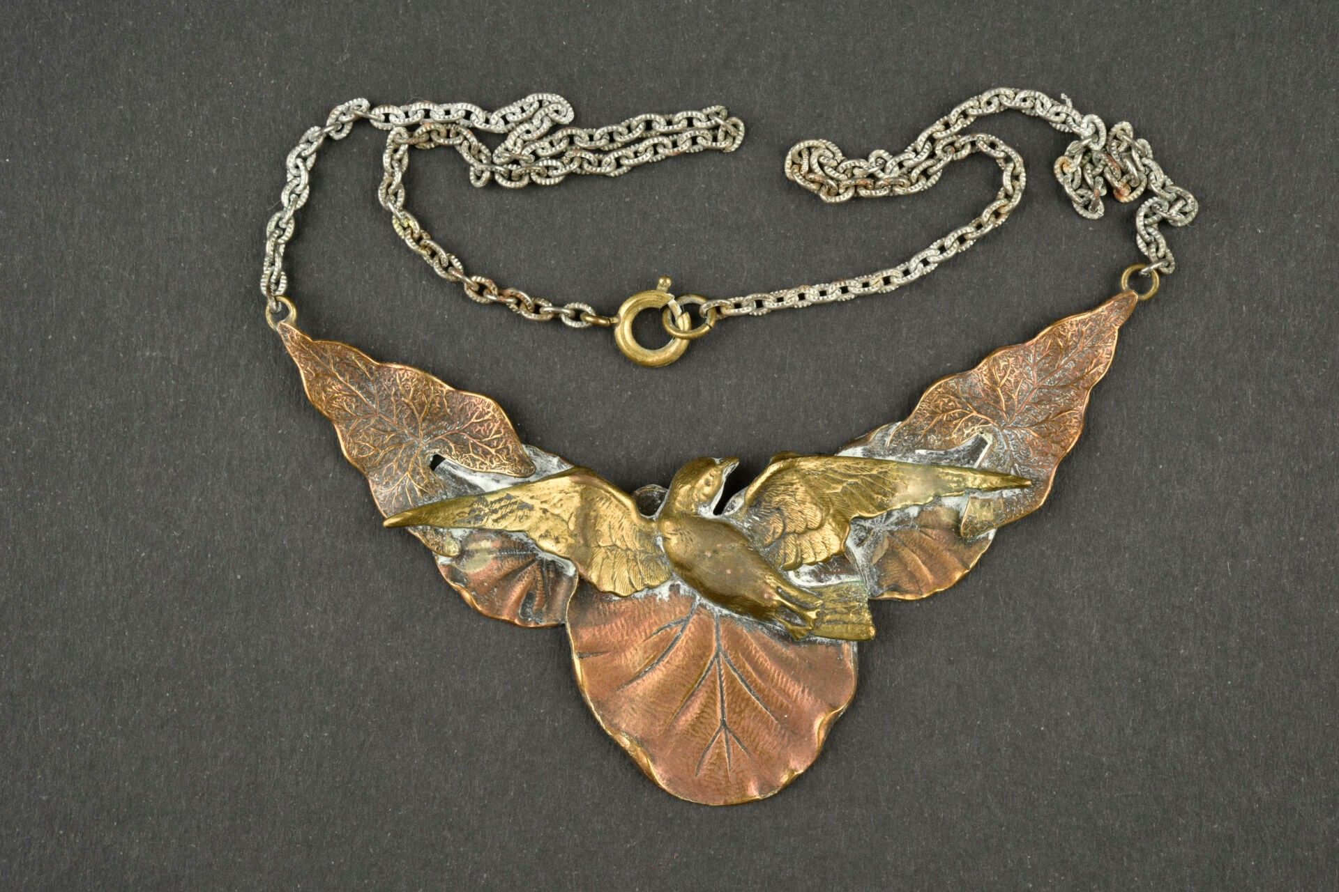 Necklace made from trench craftwork. In copper and brass representing a bird on leaves. White metal chain. Needs cleaning II