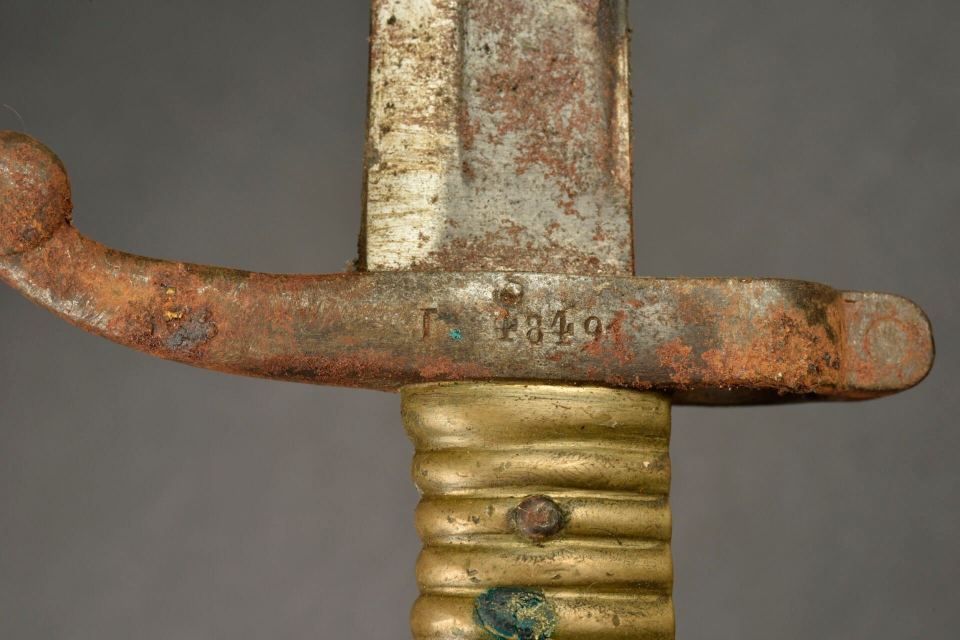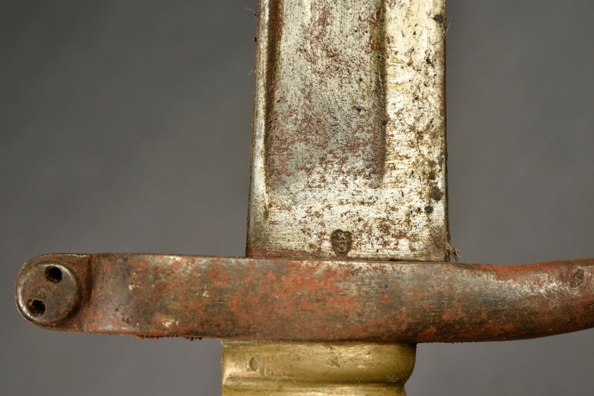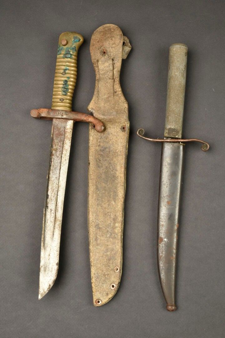 Set of 2 handmade trench daggers. One dagger made from a shortened Chassepot M1866 bayonet, in a leather sheath. A dagger whose blade is the terminal part of a sabre, white metal handle with a shortened bayonet scabbard. Copper guard not integral with the dagger. Wear, patina, slight corrosion, needs cleaning II-.For adults only.