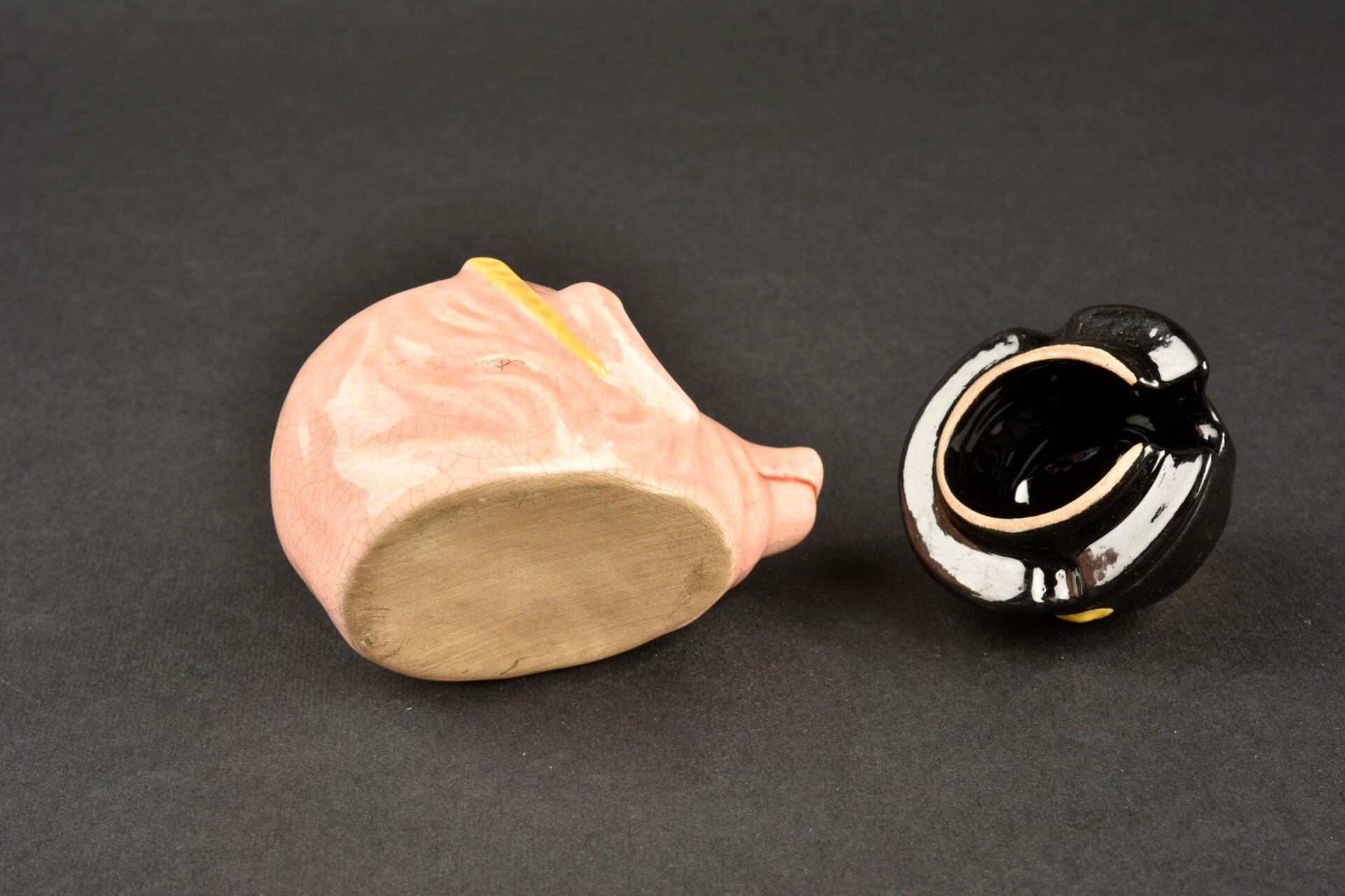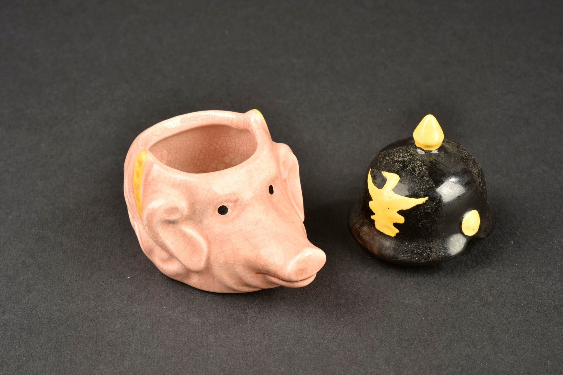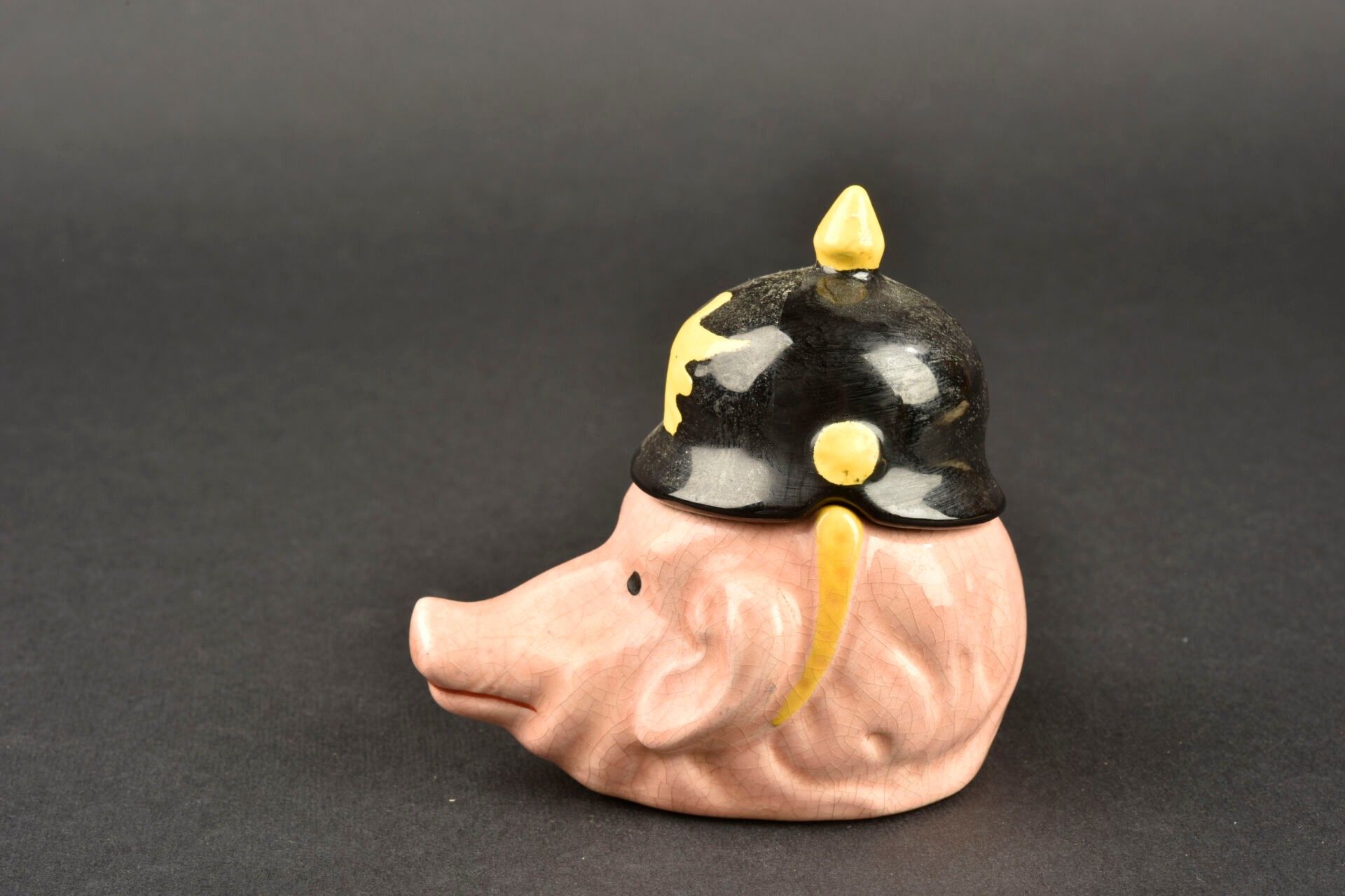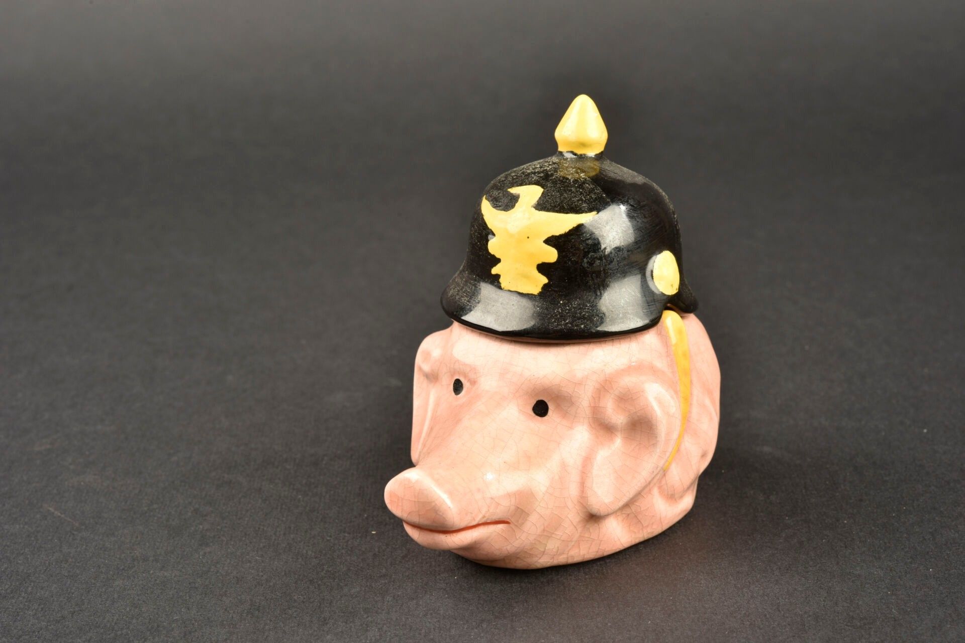Pig's head mustard pot with pointed helmet. Earthenware satirical object depicting a pig's head wearing a pointed helmet. In good condition, no visible damage. I-