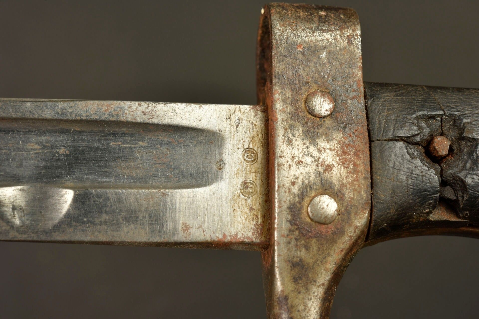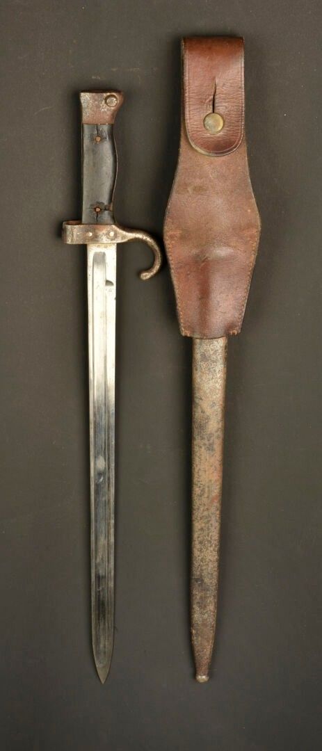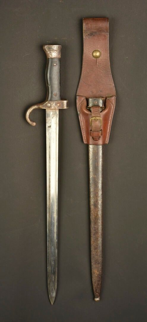 Berthier Model 1892 bayonet with scabbard holder. Model 1892 bayonet sword for Berthier snap hook. Fibre plates. Functional pusher. Nice flat backed blade, unmarked, serial number on the quillon, different from the one on the scabbard. Slight surface oxidation requiring cleaning. With brown leather Gendarmerie II scabbard holder.