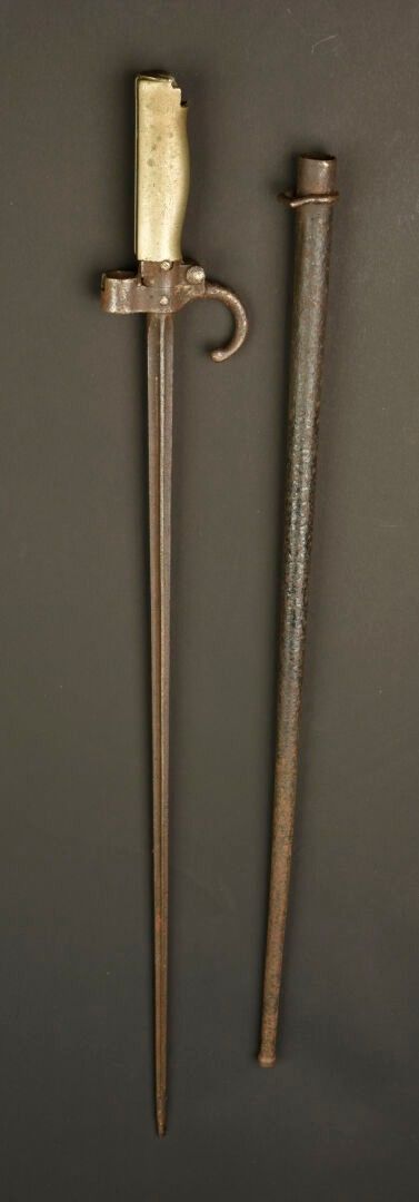 Rosalie model 1886 bayonet with quillon and impact. Nickel silver grip with quillon, impact having torn off part of the pommel. Oxidation. Cruciform blade, oxidised. Oxidised iron scabbard III.