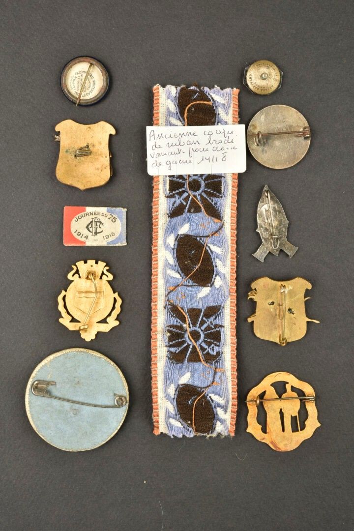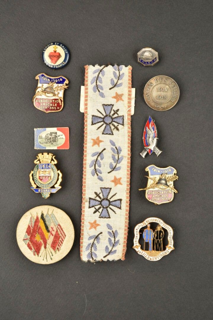 Set of brooches and patriotic objects and veterans of the 1st World War. Two badges from the amicale des anciens des 165e et 365e RI, one unattached. One from the veterans of Bohain in the Aisne, one from the union of the disabled, discharged and war widows of Lille and surrounding areas, one from the union of the poilus, various badges and a ribbon with embroidered war cross motifs. 11 items. II