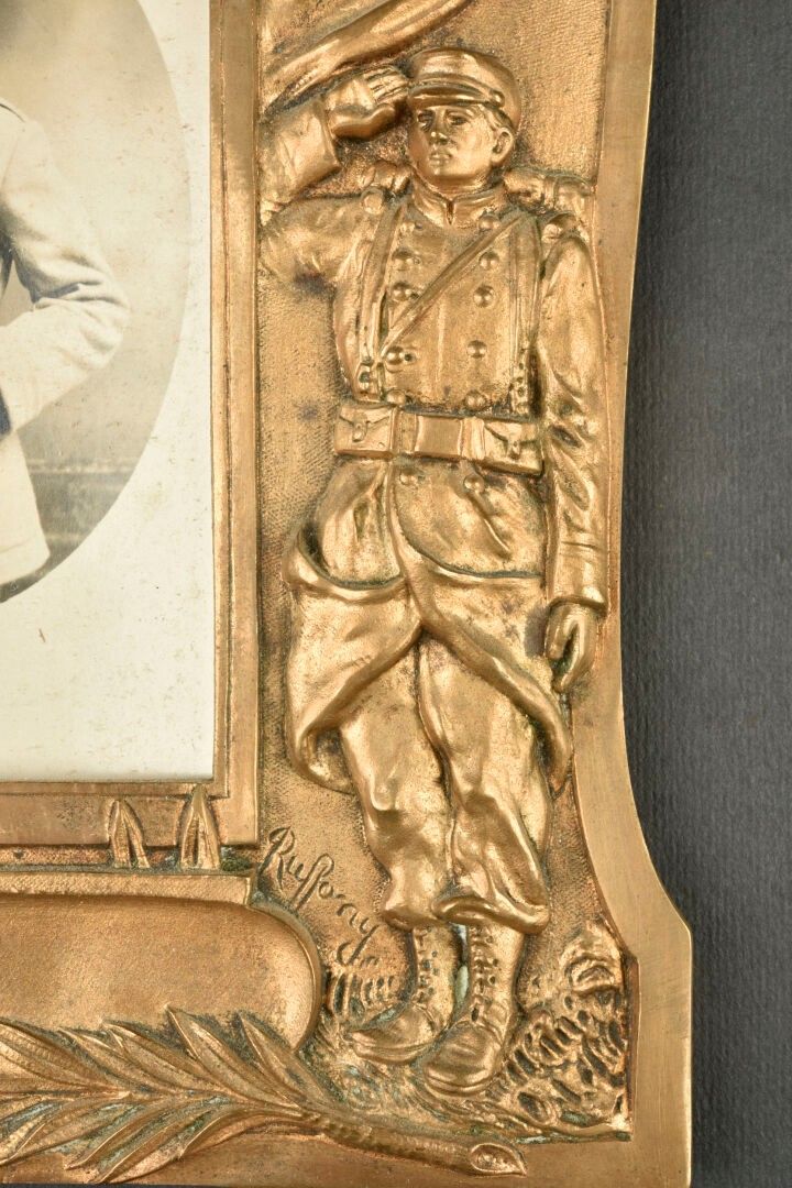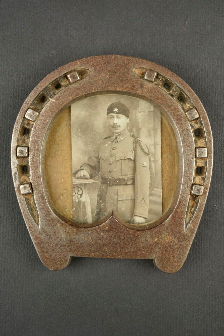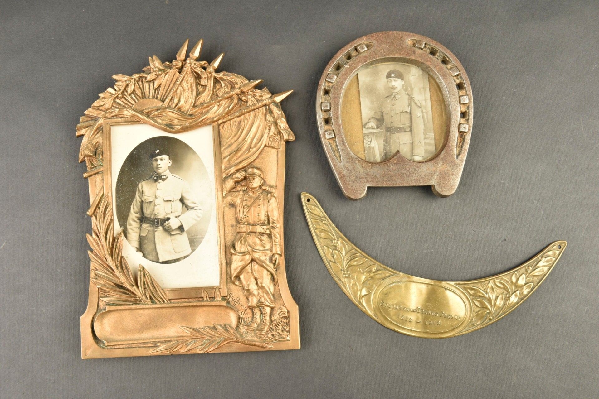 Set of 2 Combat Tank soldier photo holders. A brass photo holder with a photo of a soldier from the 551st RAS or RCC, a stirrup-shaped photo holder of a soldier from the 509th, and a Great War II soldier plaque.
