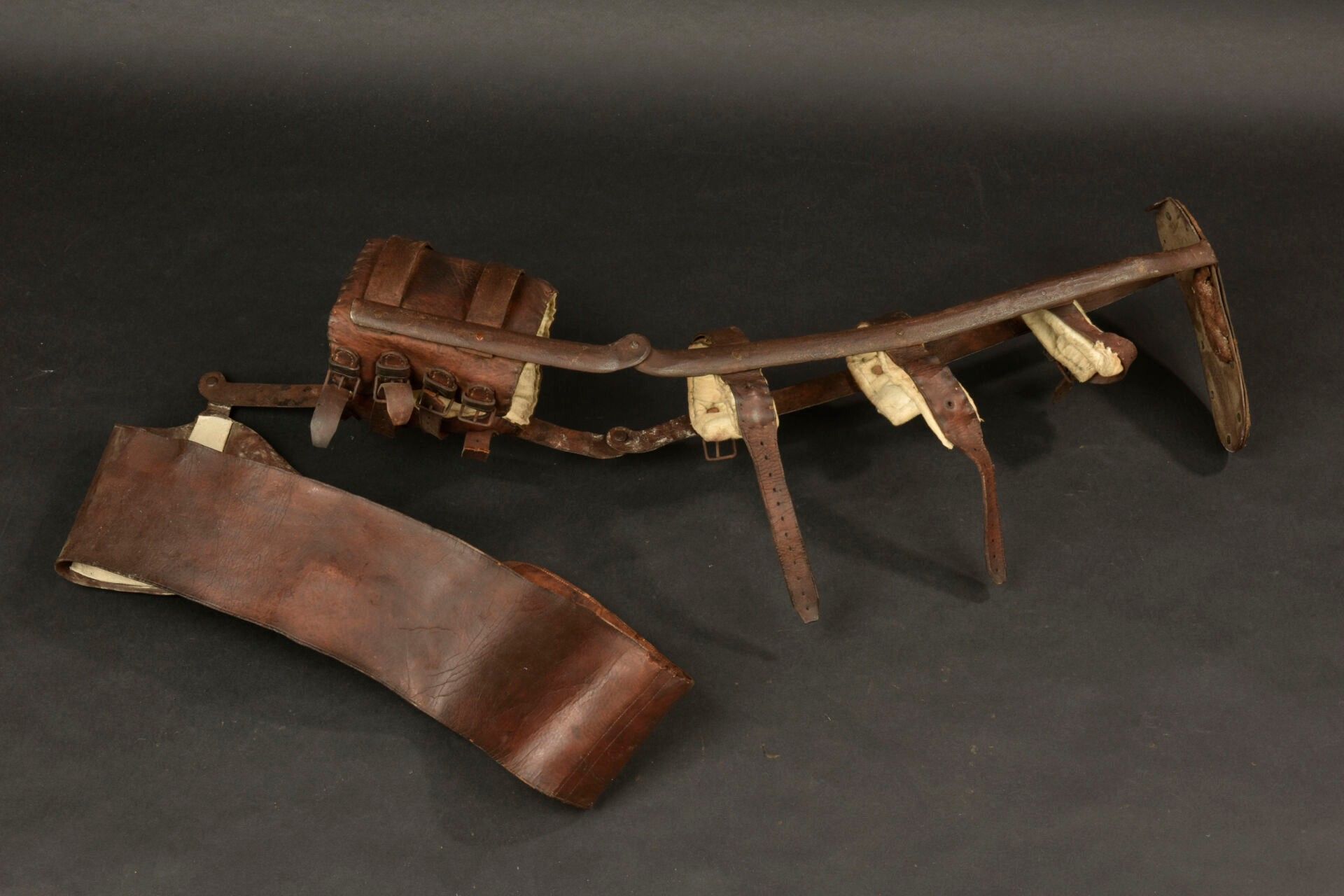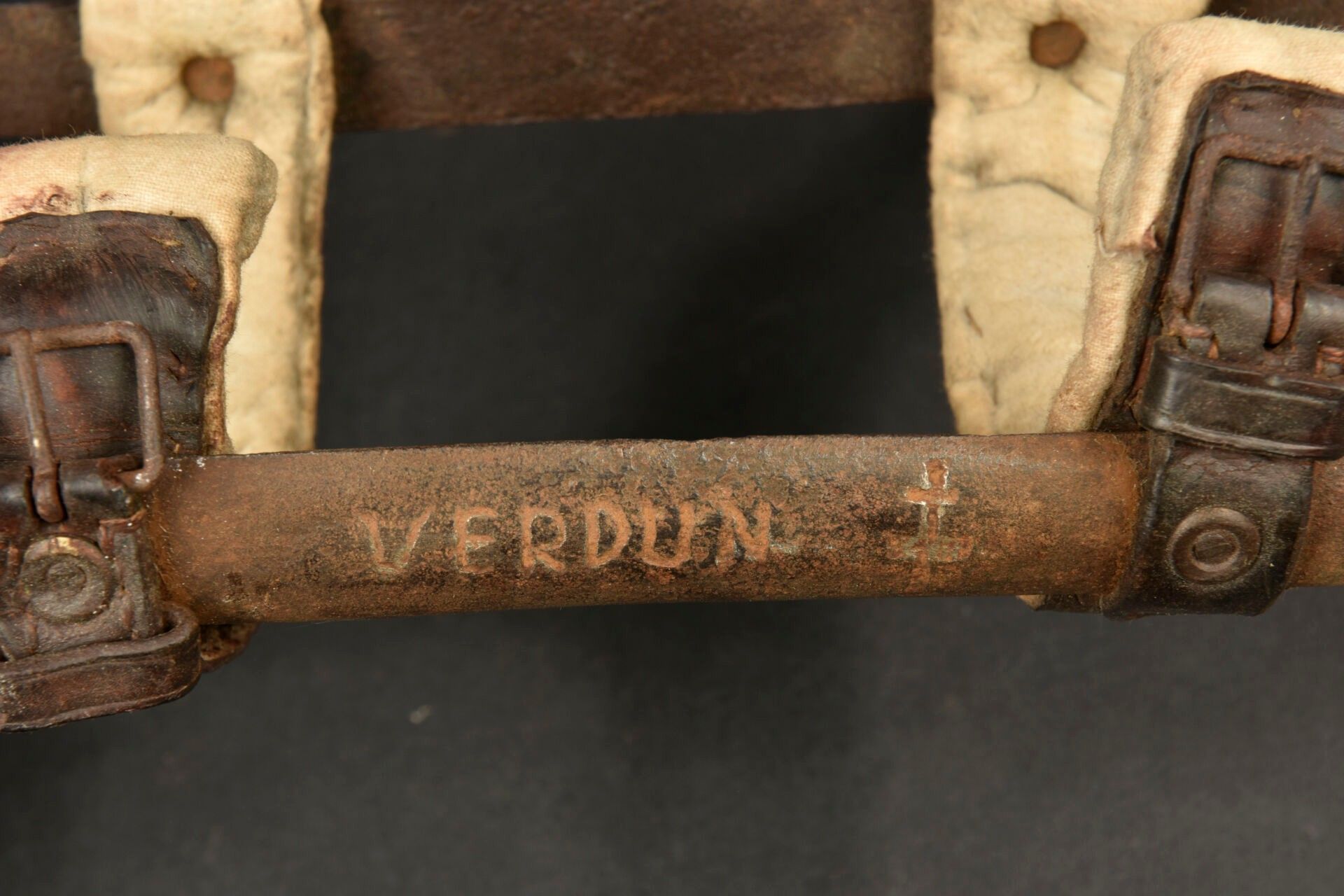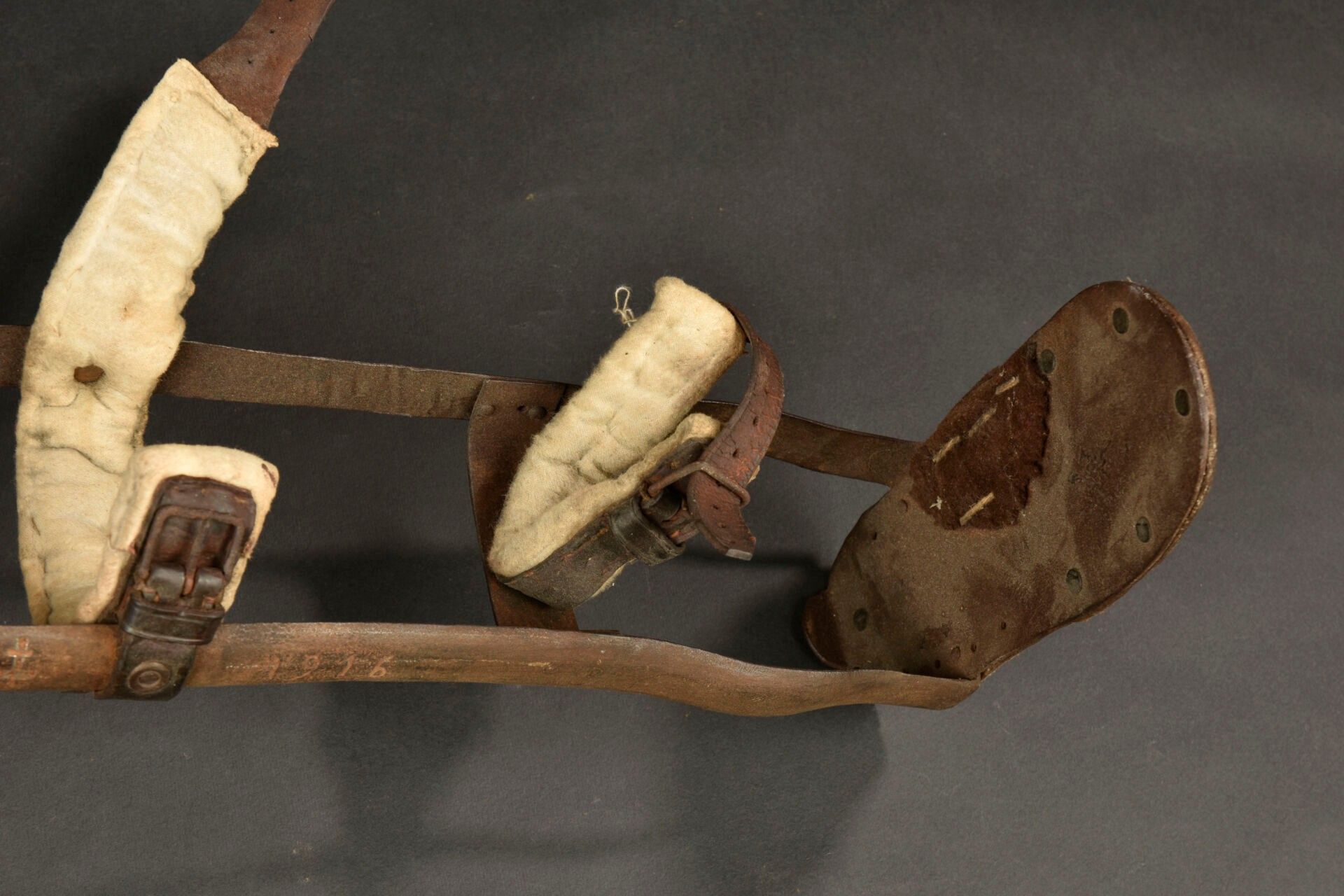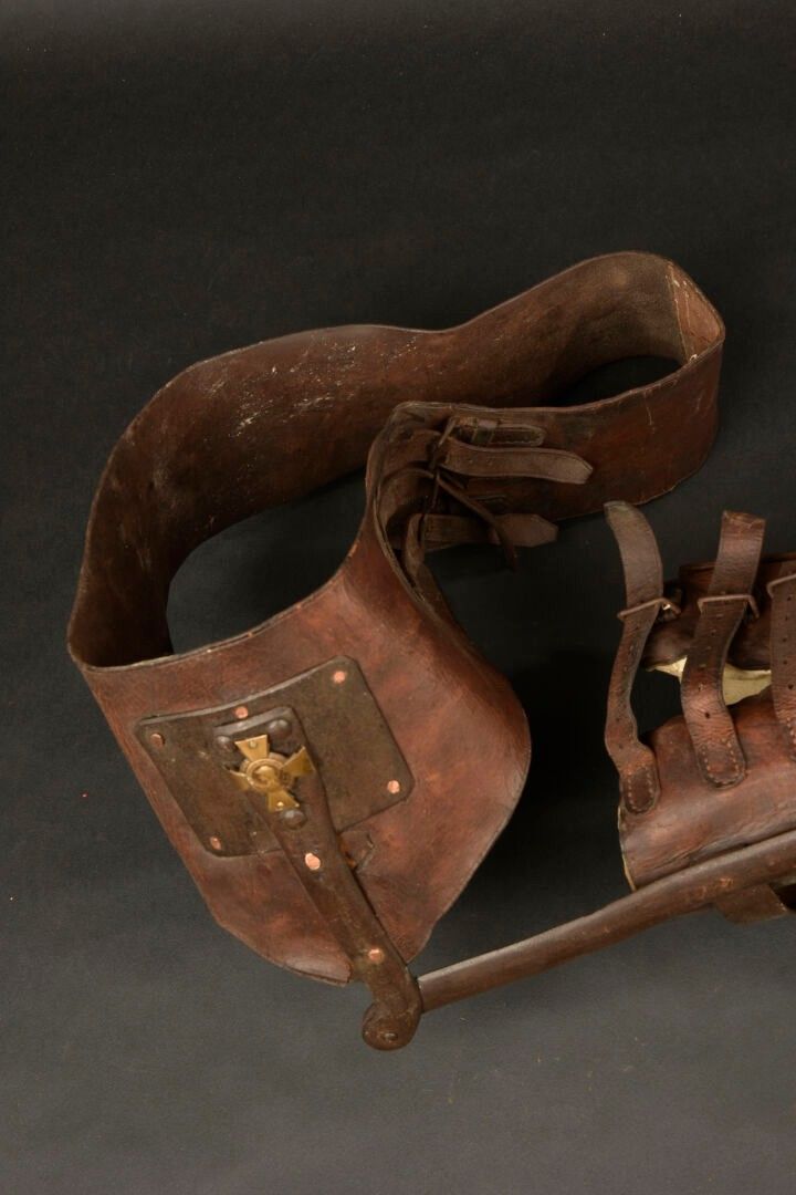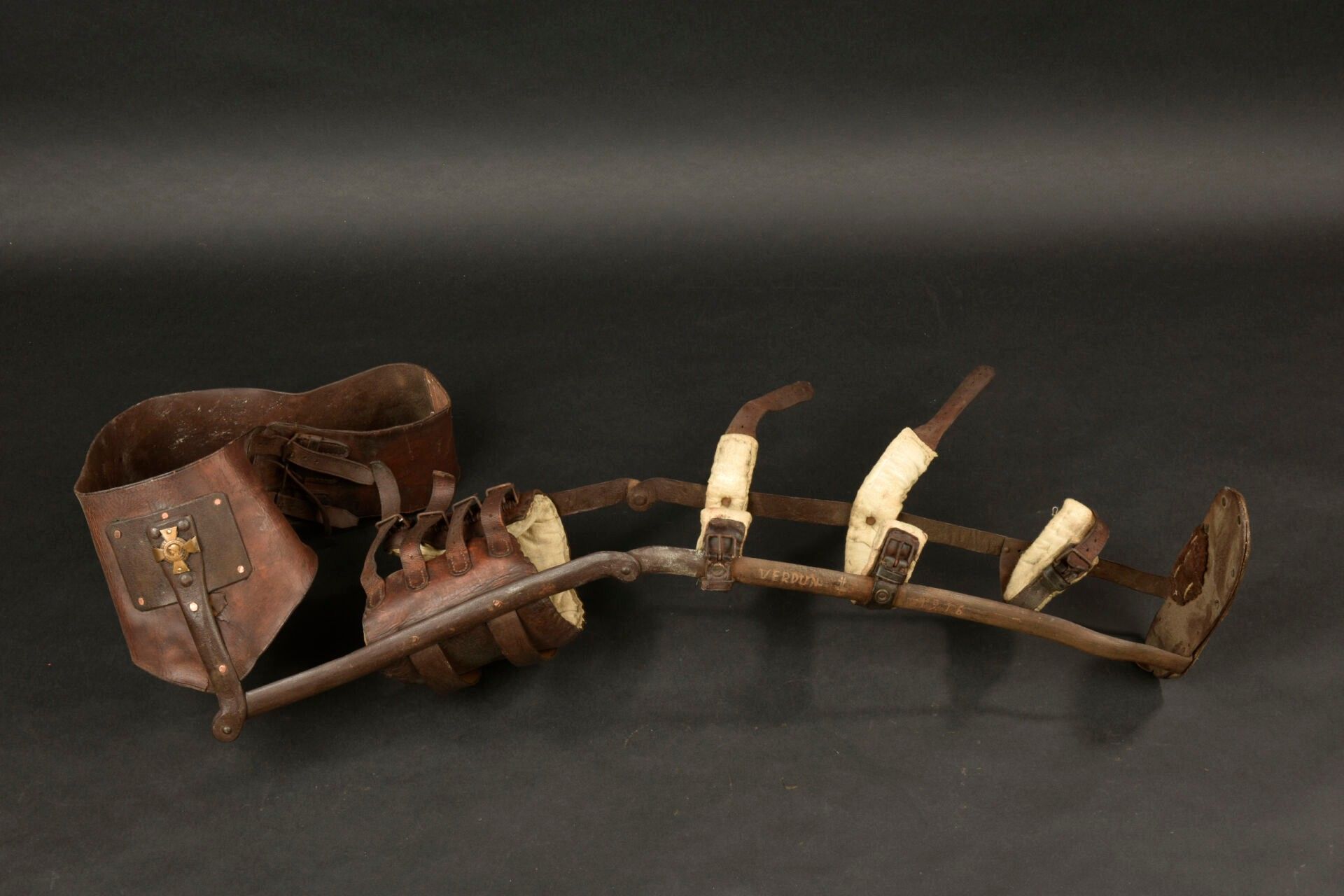 Prosthesis personalised by a war casualty. Right leg prosthesis made of metal and sheathed in leather with padded parts made of horsehair. The soldier engraved the lower part with Verdun 1916 and a Lorraine cross. On the hip belt, the soldier has nailed his servicemen's cross. A moving relic of the fighting at Verdun. Condition II+