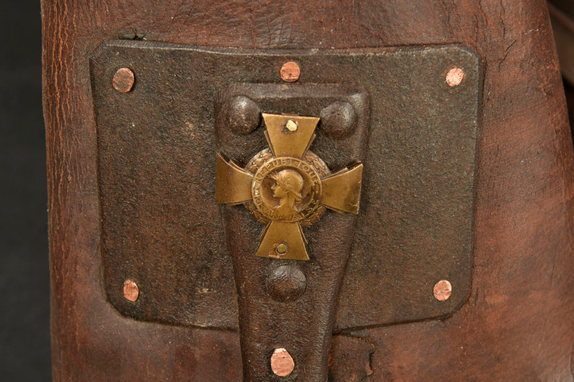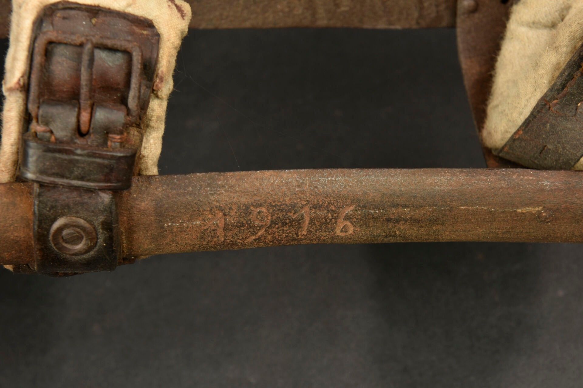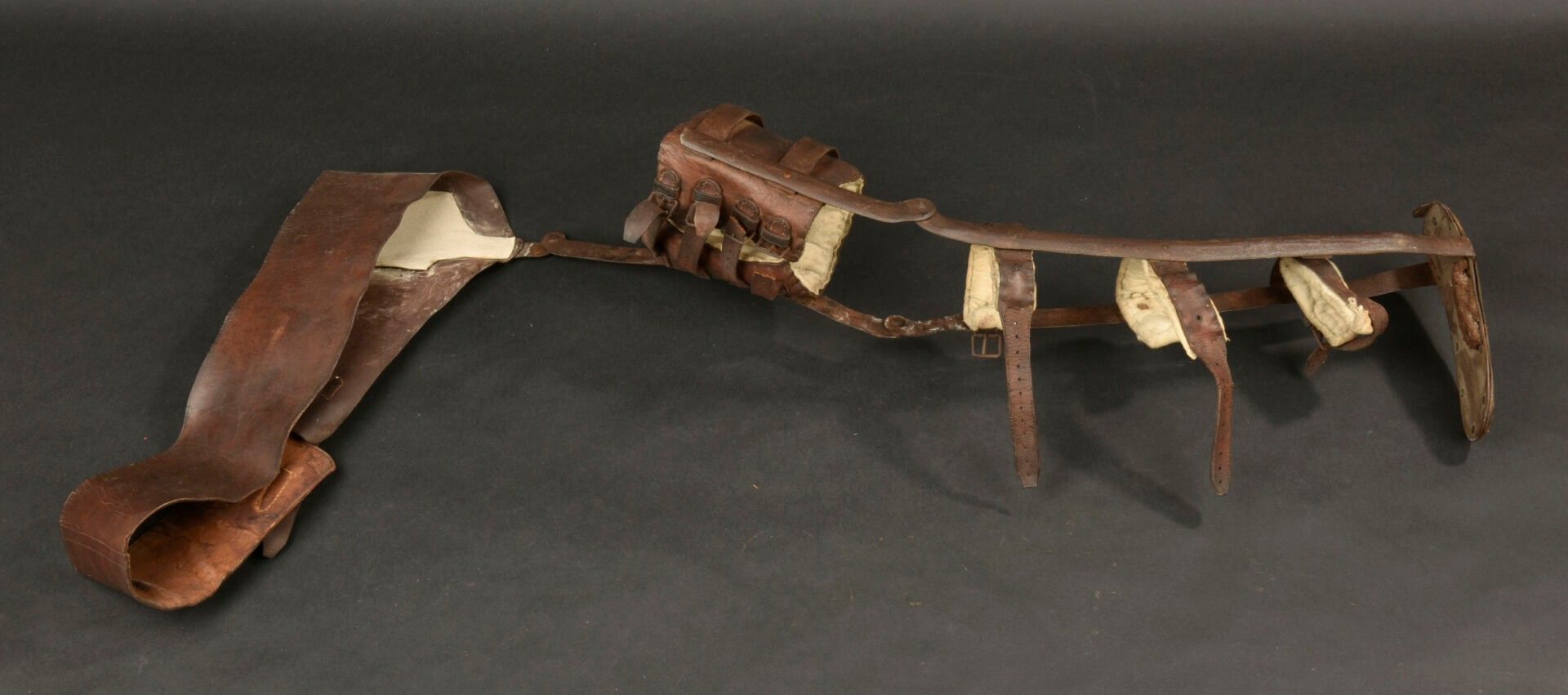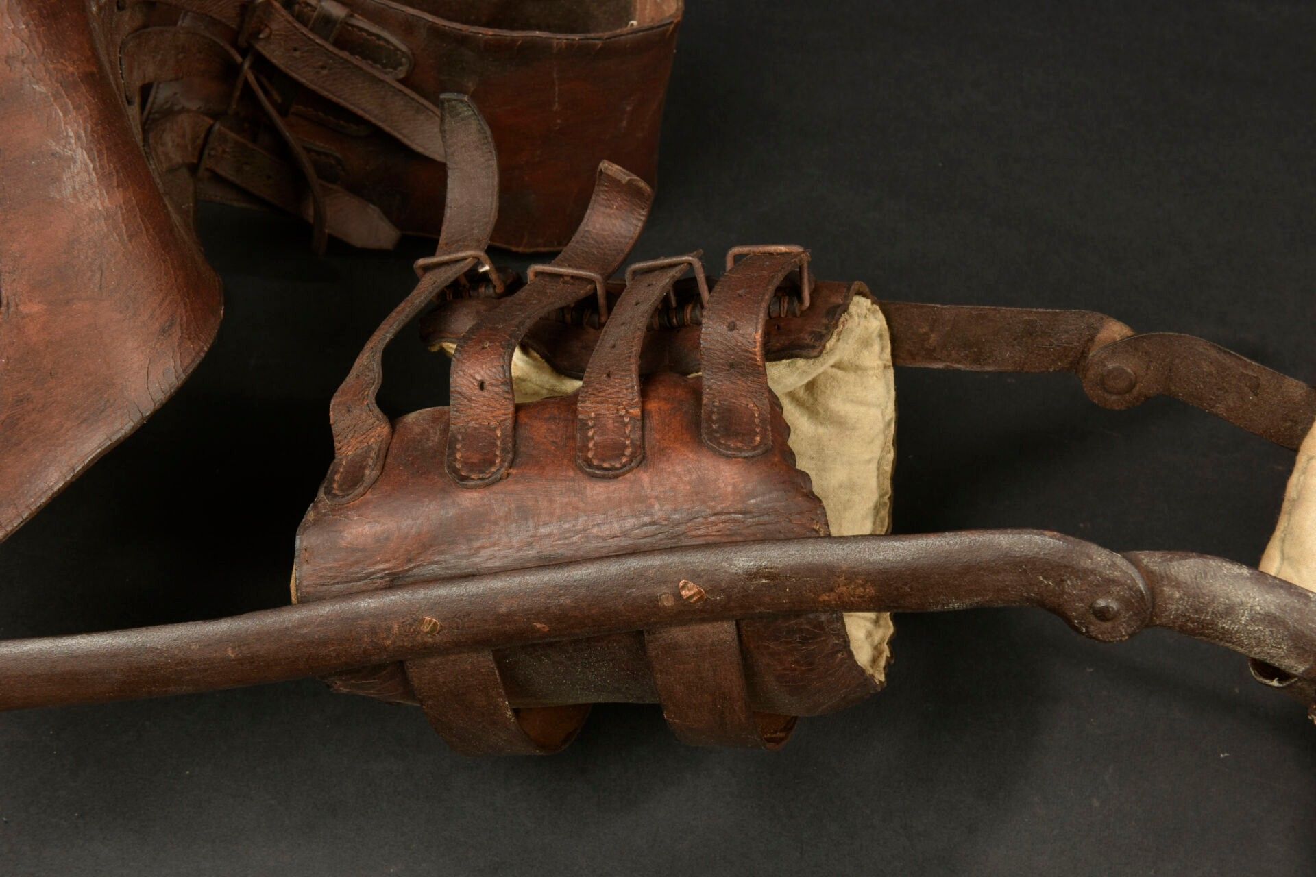 Prosthesis personalised by a war casualty. Right leg prosthesis made of metal and sheathed in leather with padded parts made of horsehair. The soldier engraved the lower part with Verdun 1916 and a Lorraine cross. On the hip belt, the soldier has nailed his servicemen's cross. A moving relic of the fighting at Verdun. Condition II+