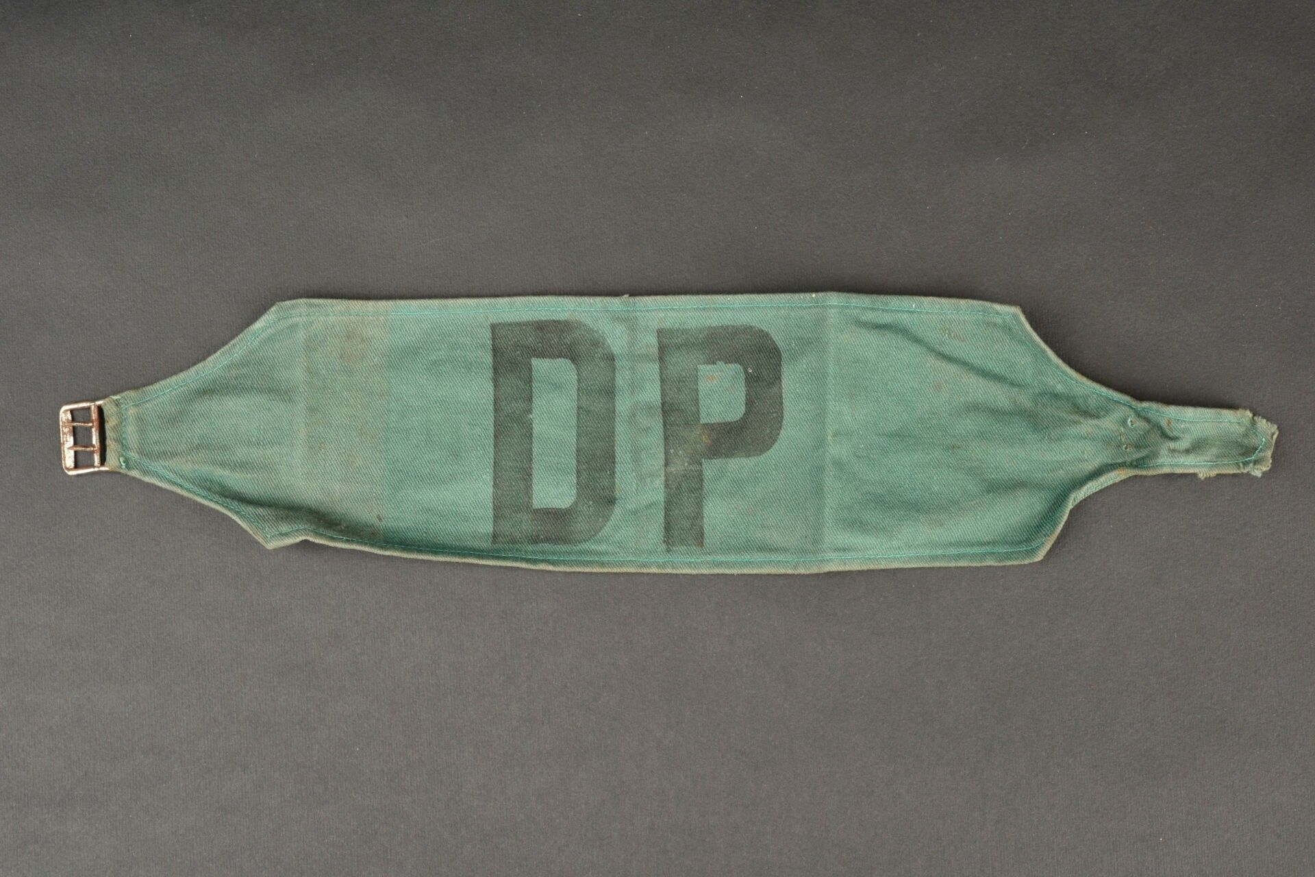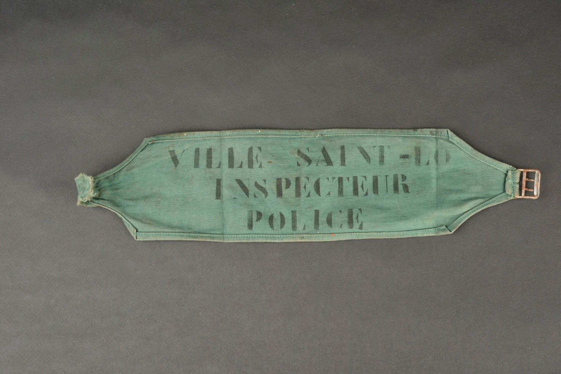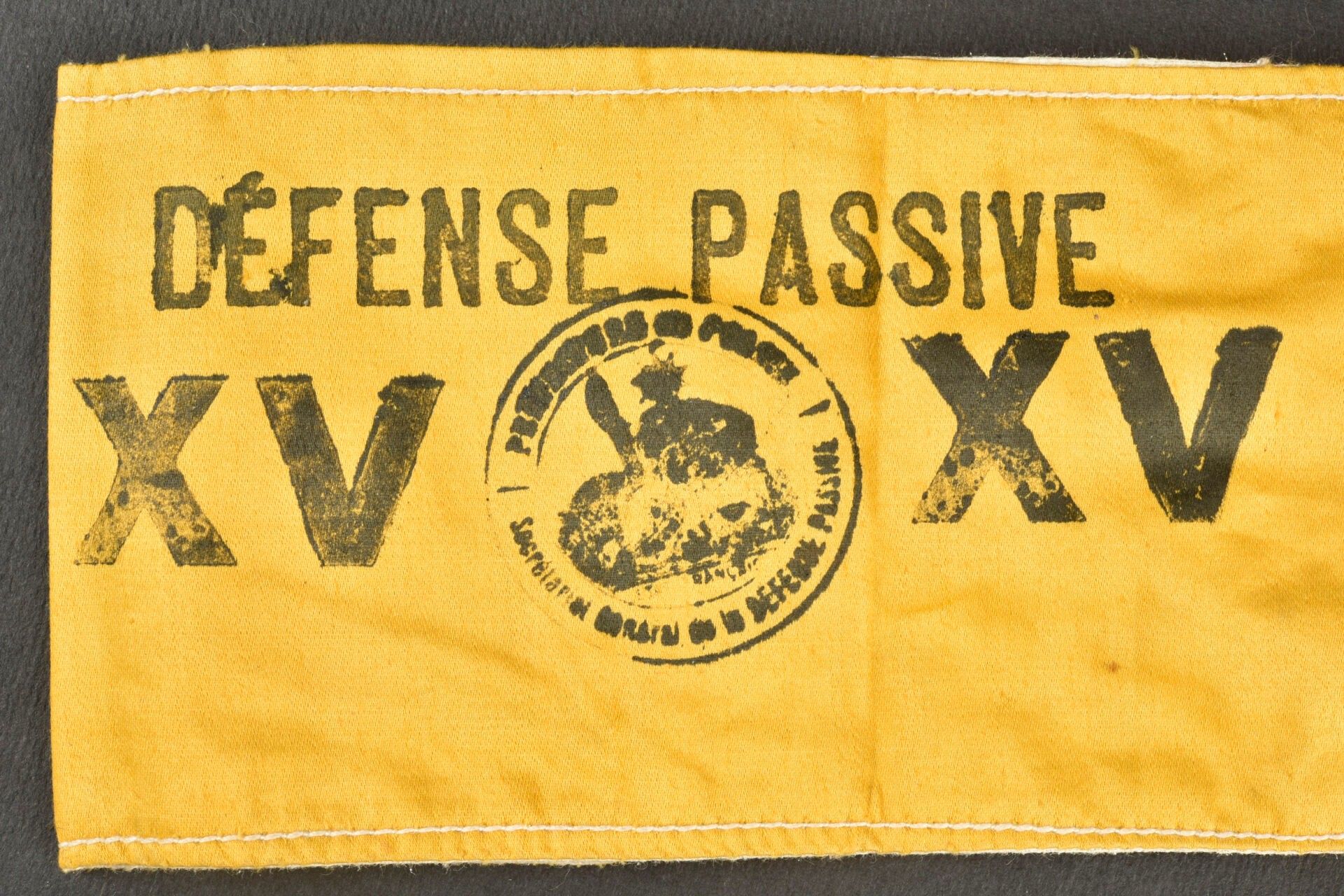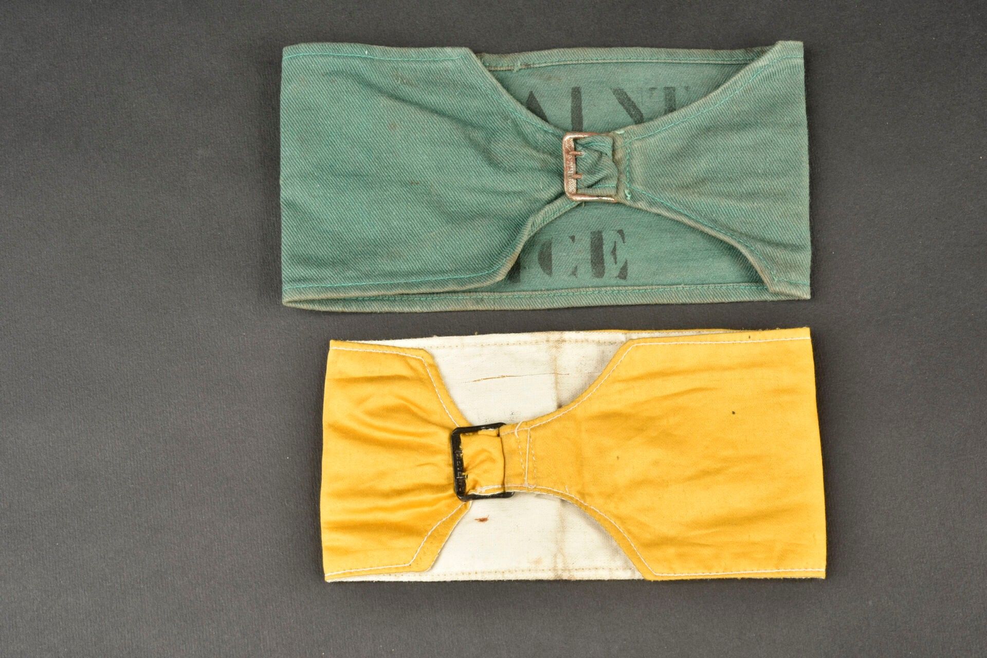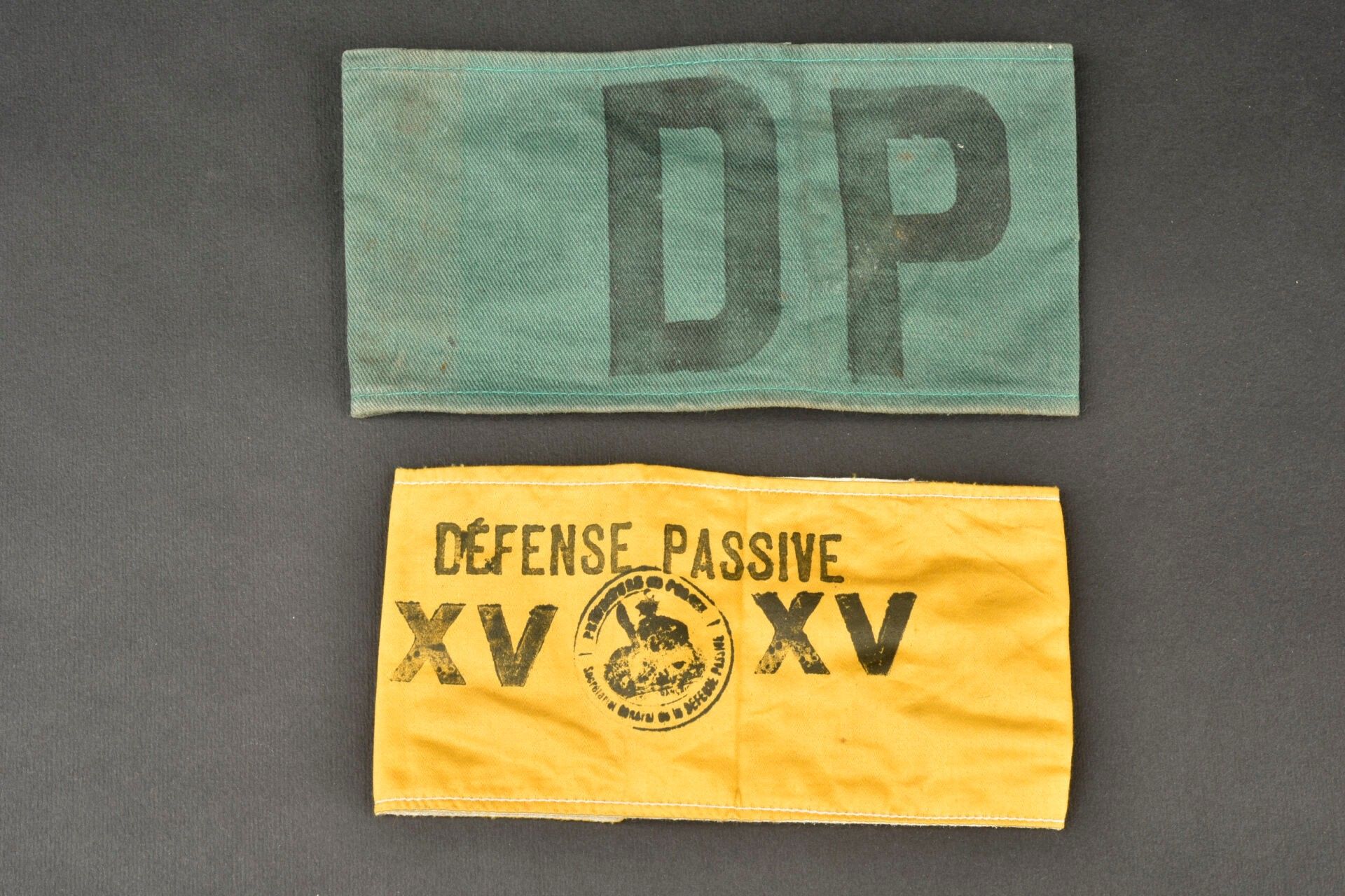 Passive defence armbands. Comprising an armband in green cotton fabric, lettering printed DP. The back bears the stencilled inscription Le Saint L Inspecteur Police. Oxidised metal fastening. One yellow cotton cloth armband, stamped Passive Defence XV, town stamp illegible. Complete fastening. Some wear and patina. Condition II+. 2+