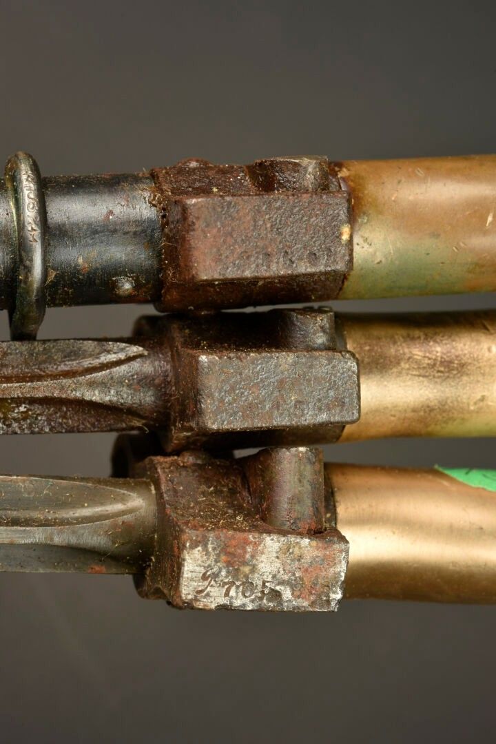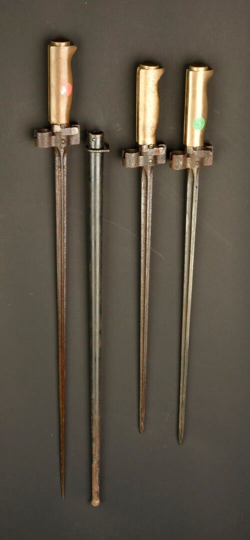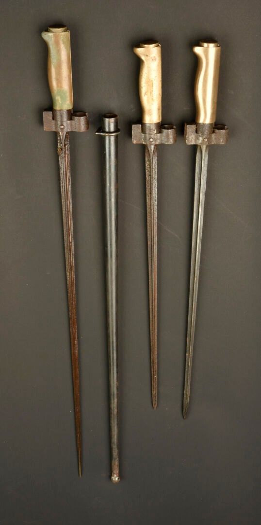 Set of 3 Lebel 1886 bayonets. All with brass grip without quillon. One full length with scabbard. Two others without scabbard, blades shortened respectively to 400 and 383 mm. Oxidation, wear, grease II-.For adults only.