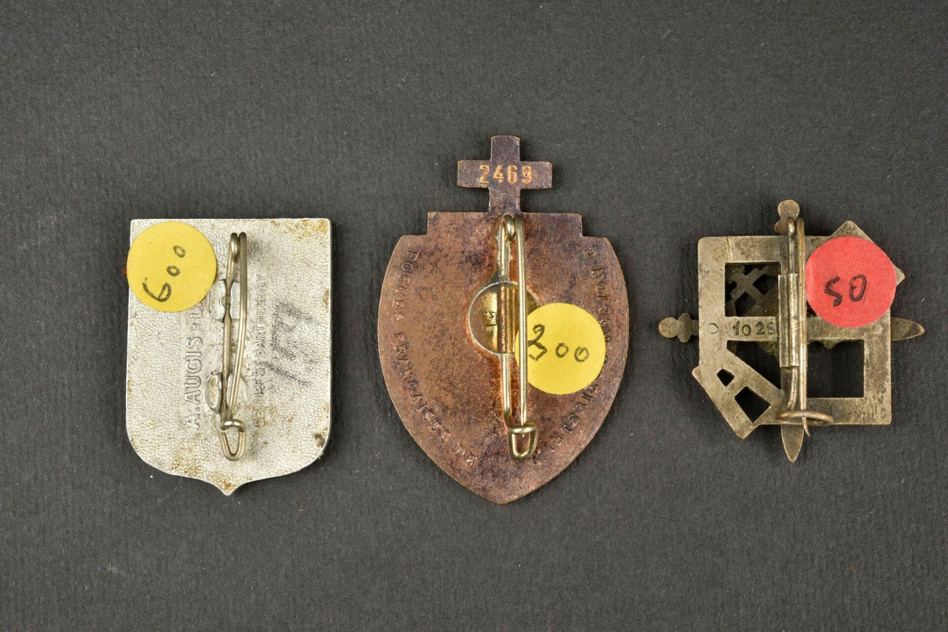 Lot of FFI badges. Comprising the 1st Jura Battalion badge in painted aluminium of Augis manufacture. An enamelled metal badge of the organisation resistante armée, damaged and numbered 1029. A Region C FFI badge, 1944 in enamelled metal with attribution number 2469 on reverse. Condition II+.