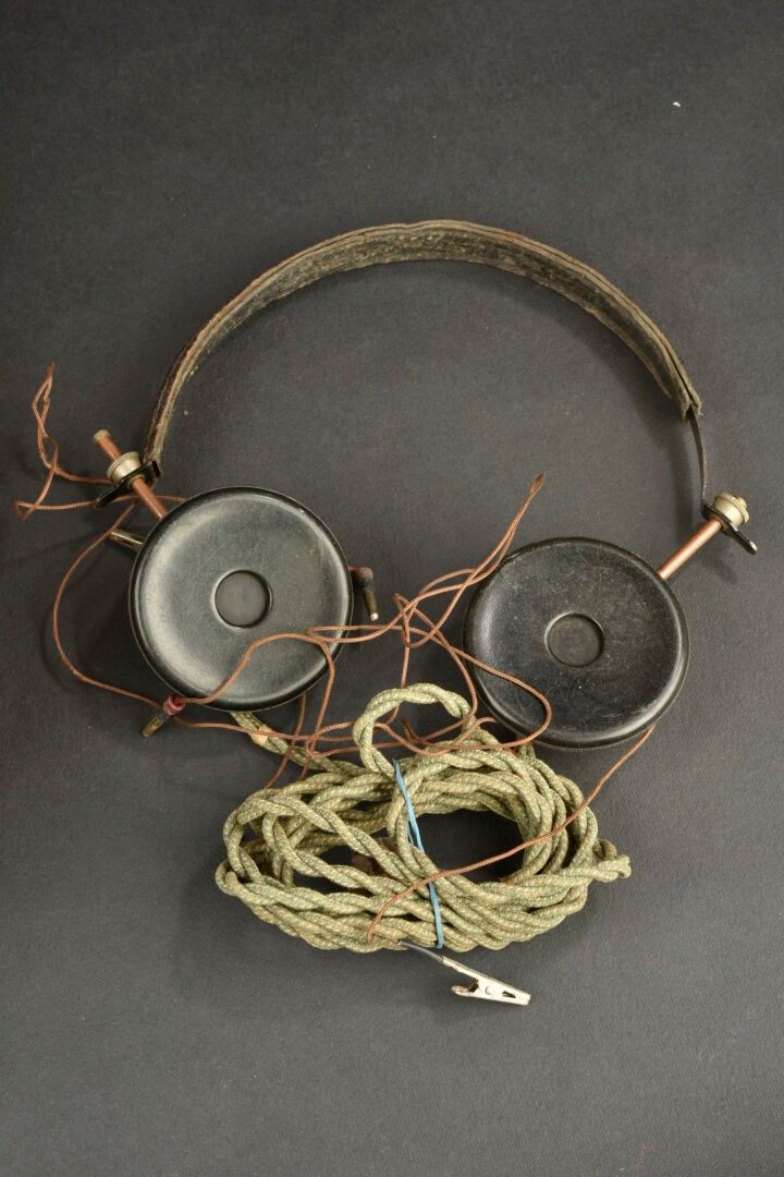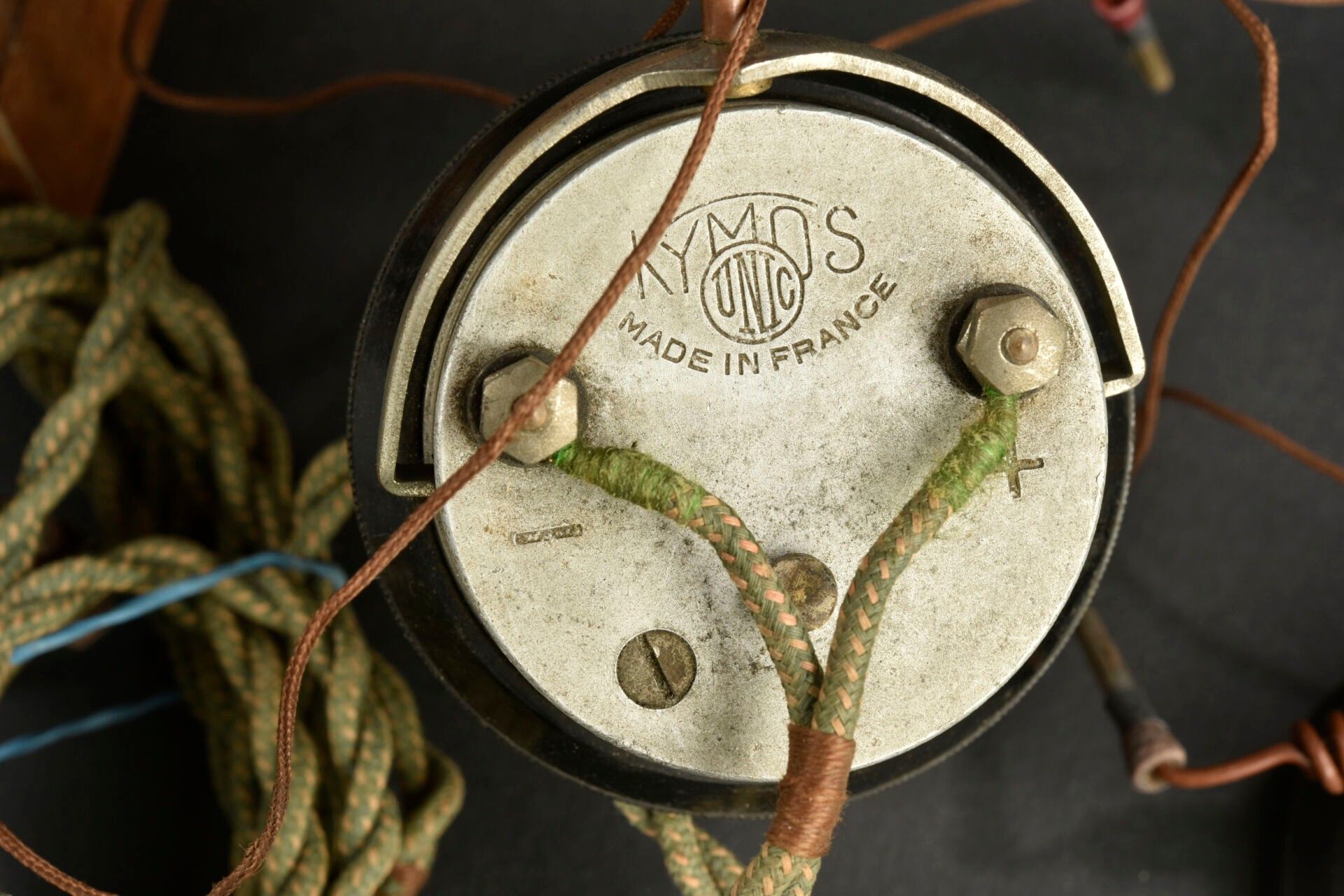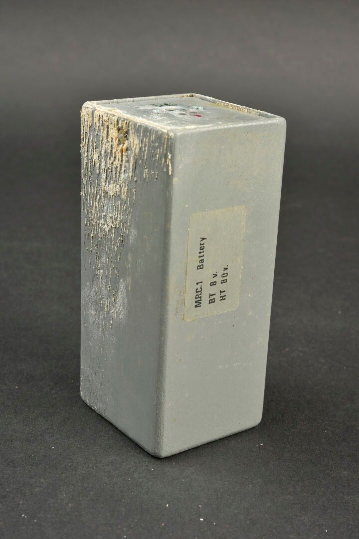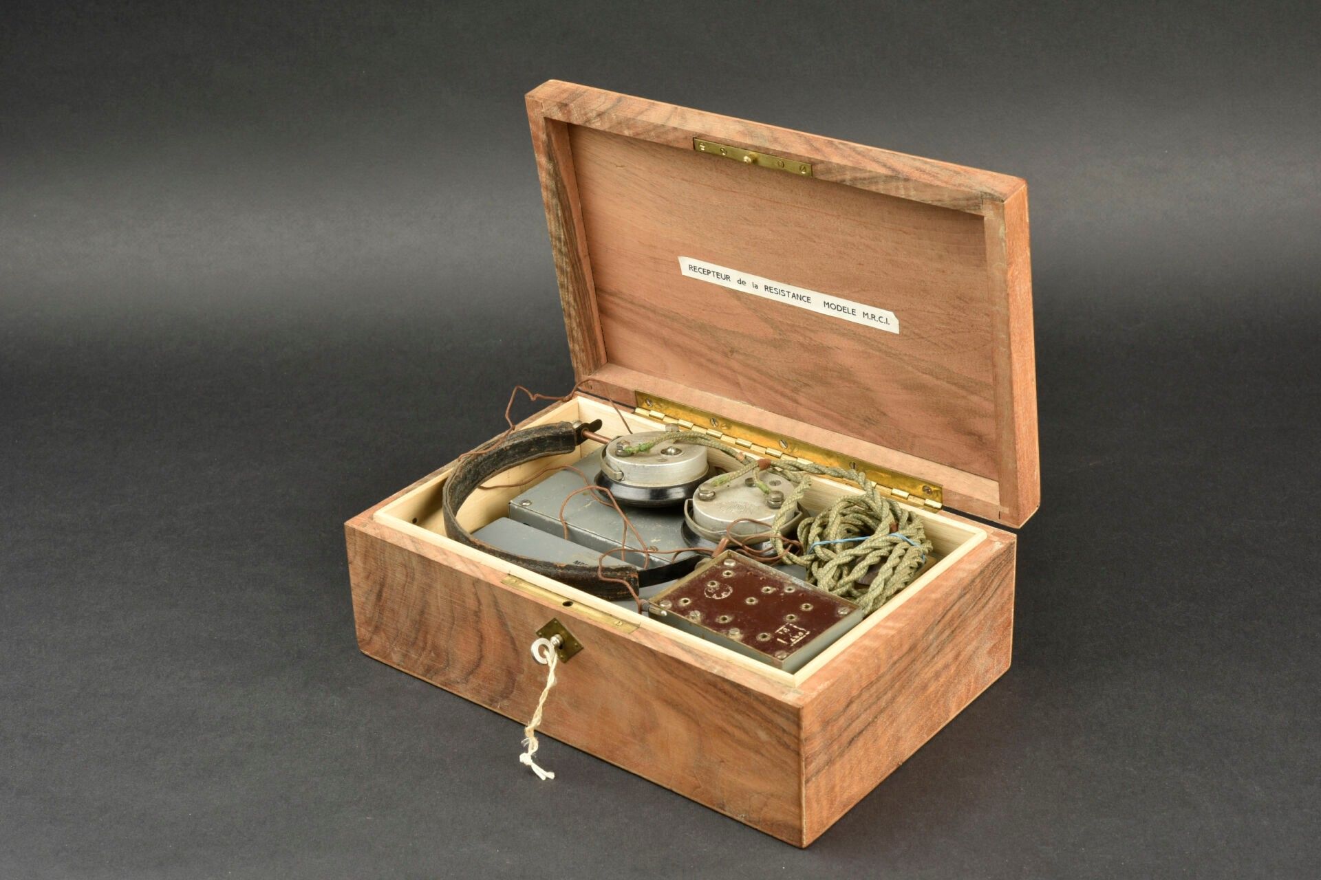 MCRI Biscuit radio receiver. In original blue-grey paint, still with its plug, small metal plate with MCRI inscription, number 20479. On the top is the large range and the three small interchangeable ranges, each range has its original label. MCRI battery with its original label, traces of rubbing on one side. French-made headphones, Kimos. In a small later wooden case. Condition II+