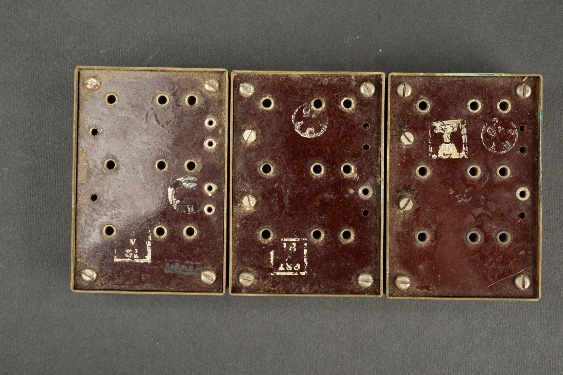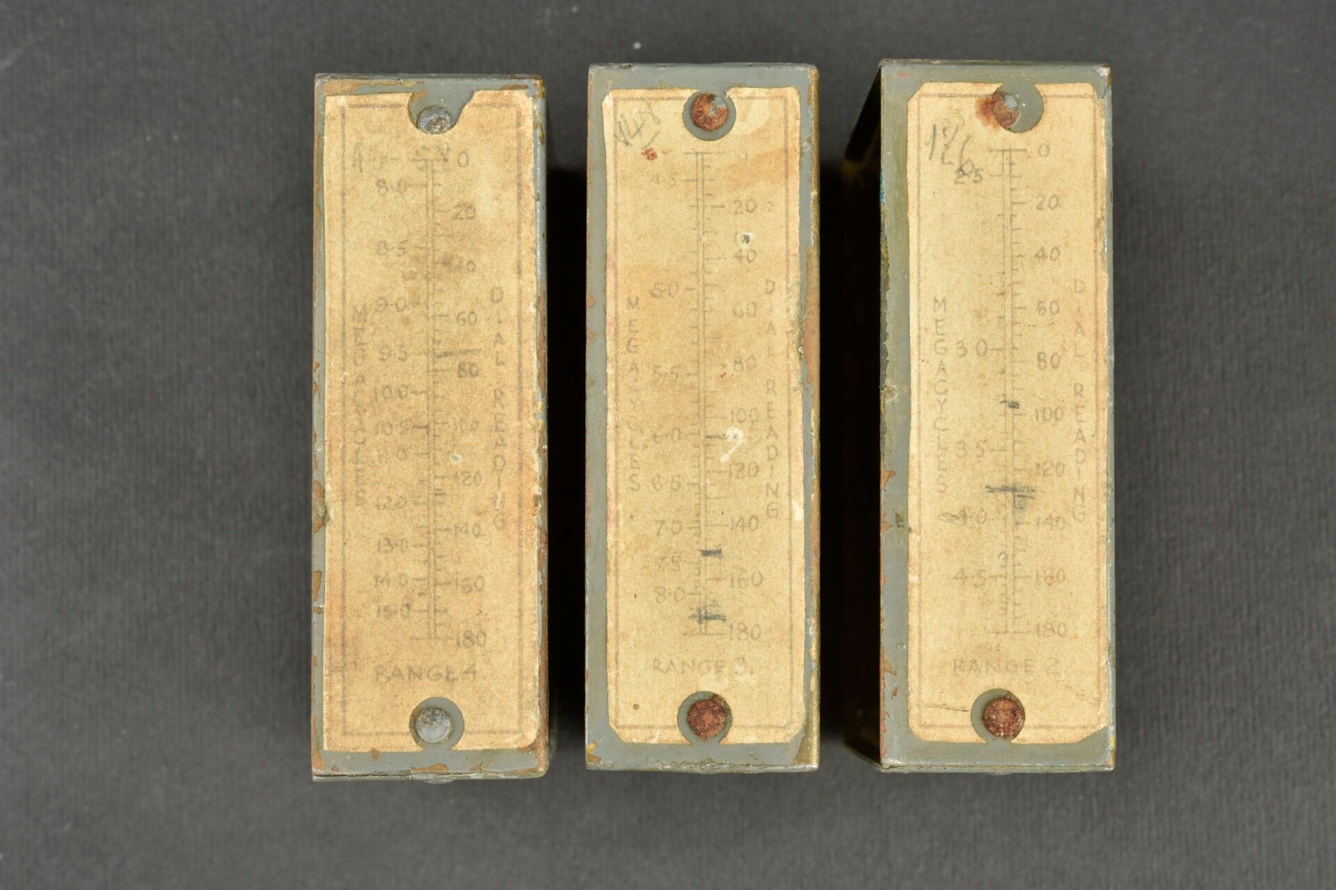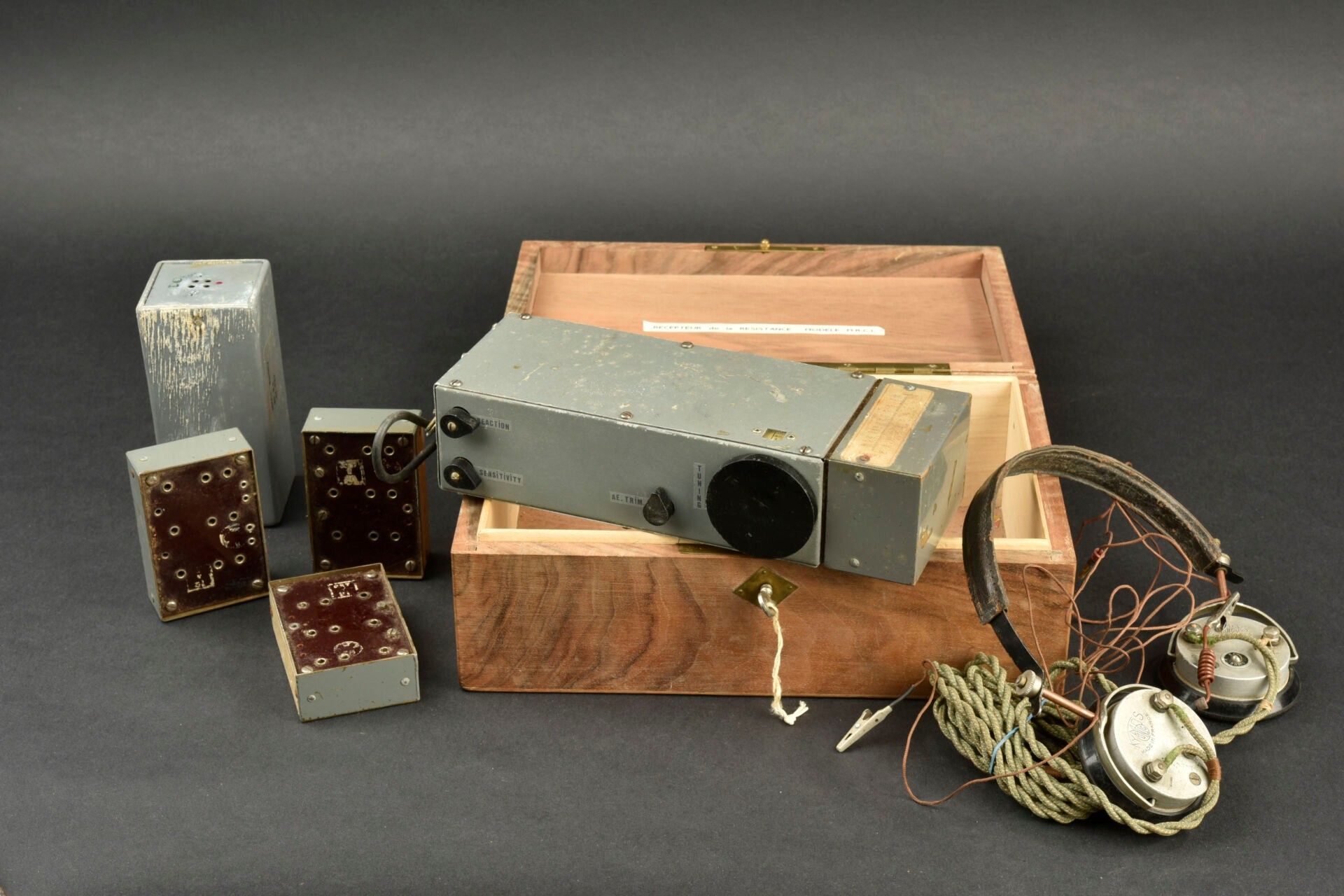 MCRI Biscuit radio receiver. In original blue-grey paint, still with its plug, small metal plate with MCRI inscription, number 20479. On the top is the large range and the three small interchangeable ranges, each range has its original label. MCRI battery with its original label, traces of rubbing on one side. French-made headphones, Kimos. In a small later wooden case. Condition II+