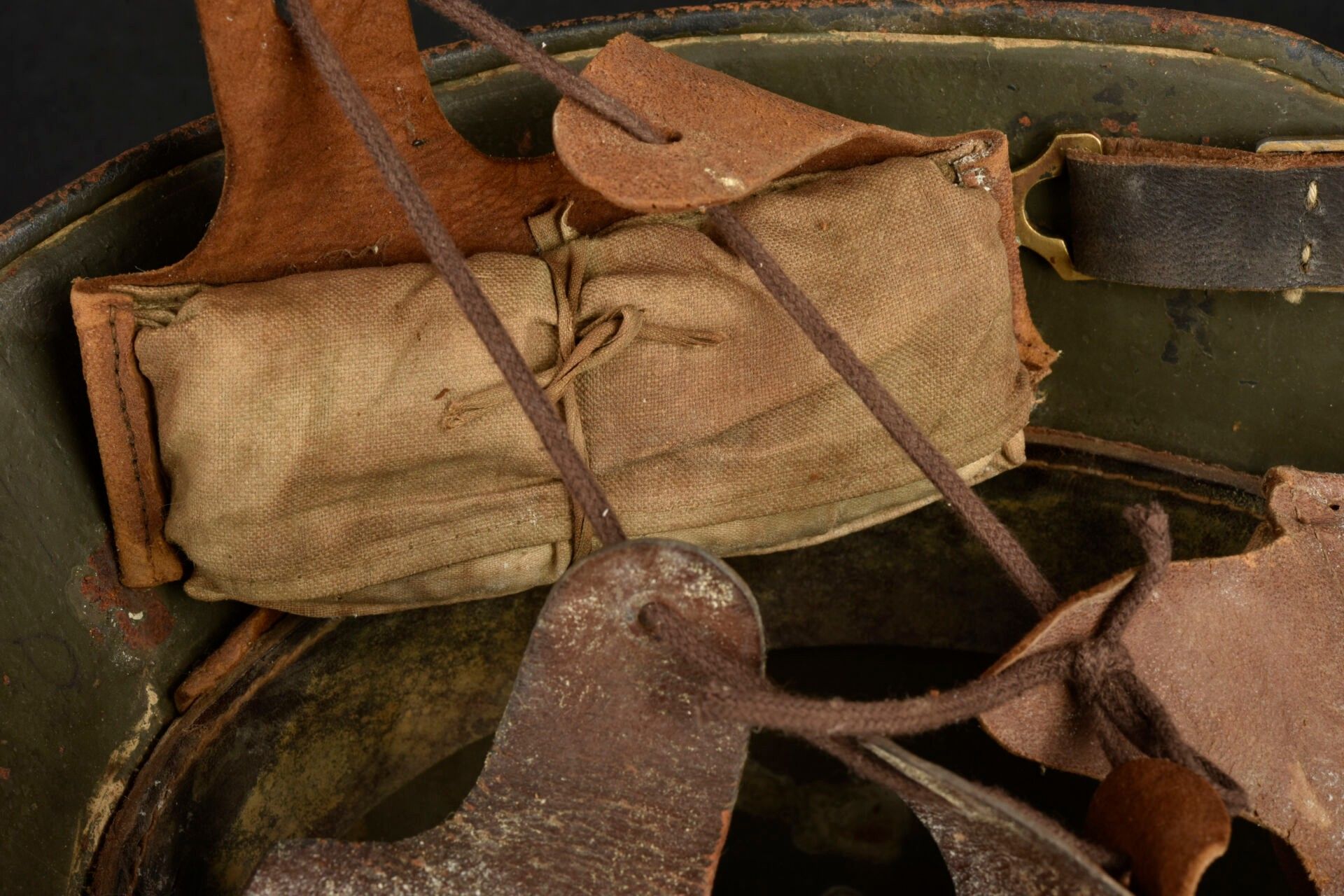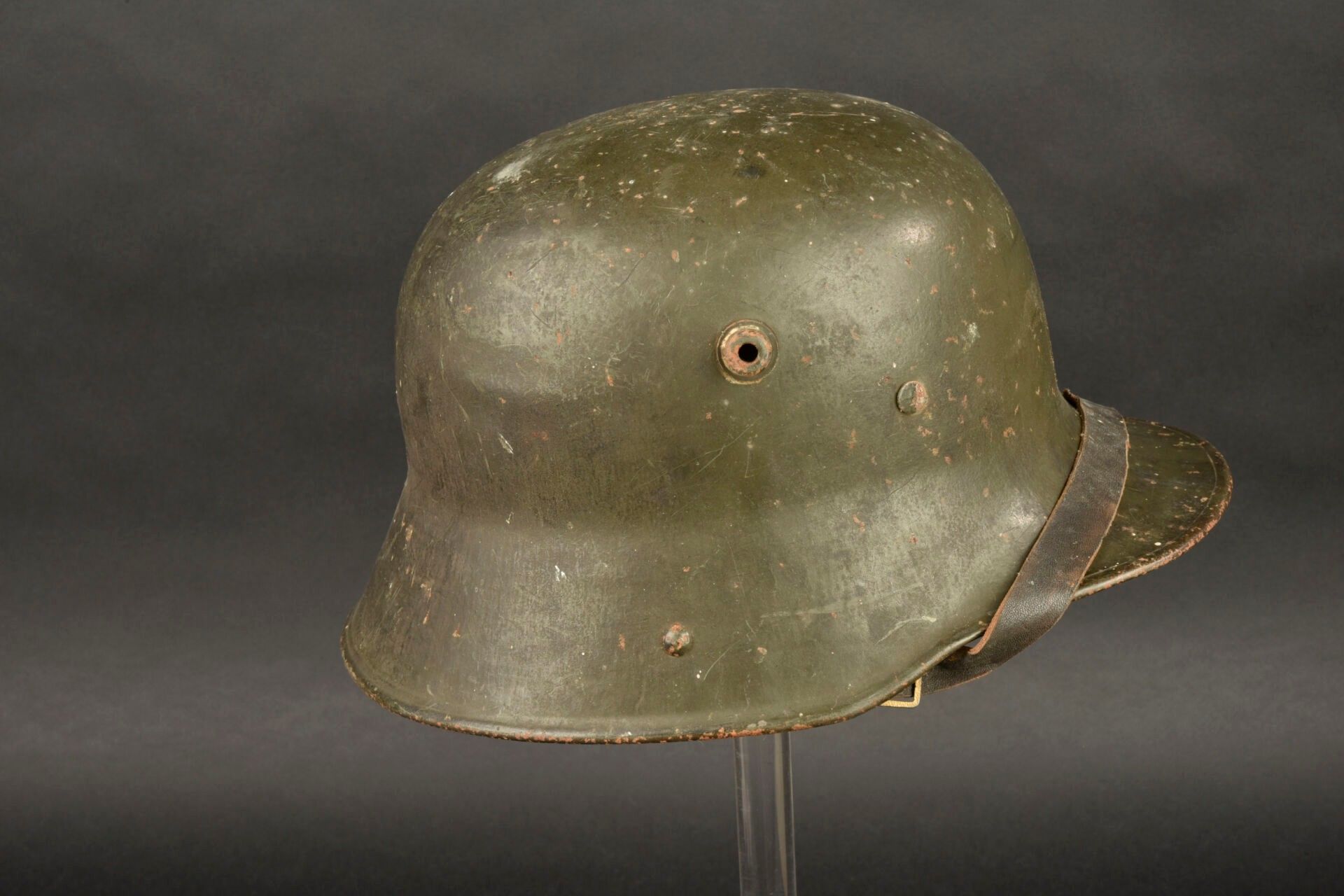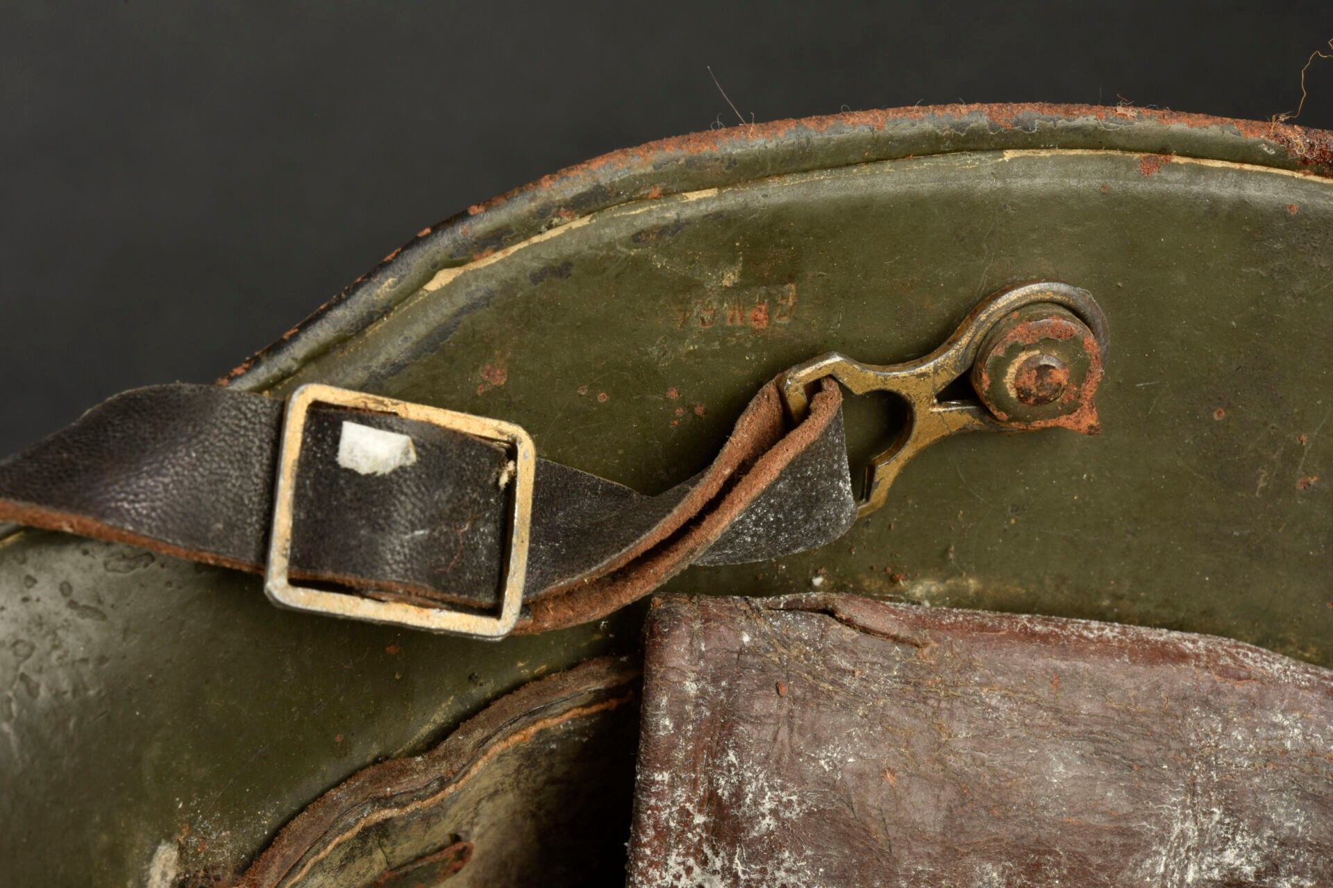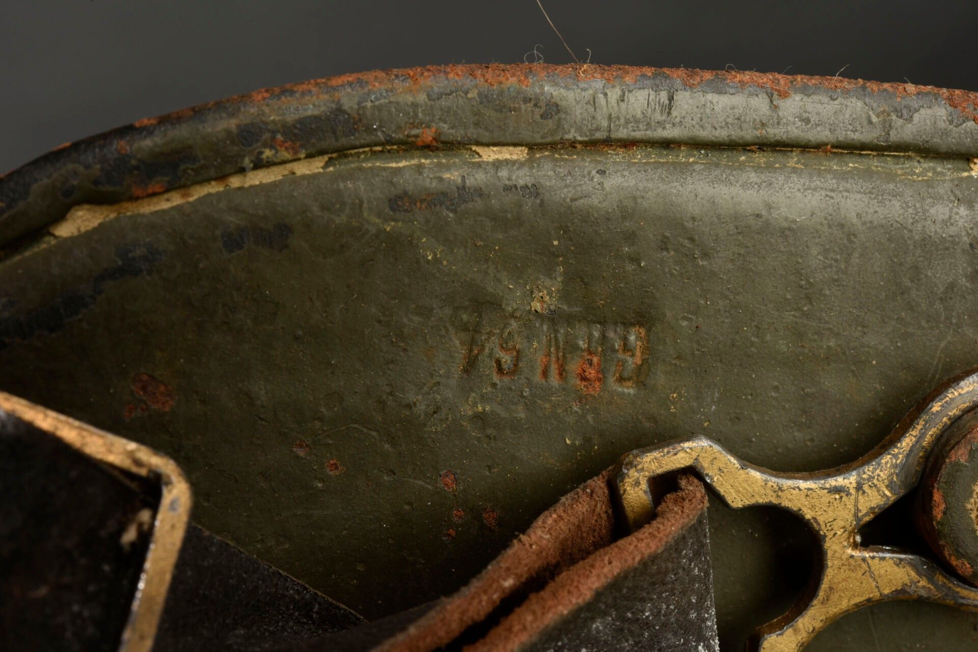 Stahlhelm M16 Feldgrau hull. Nice hull marked GBN for Gebrüder Bing Nürnberg size 64. Beautiful Feldgrau paint. Leather headband. 3 leather panels, 2 appear to be replacements. A reproduction chinstrap. II