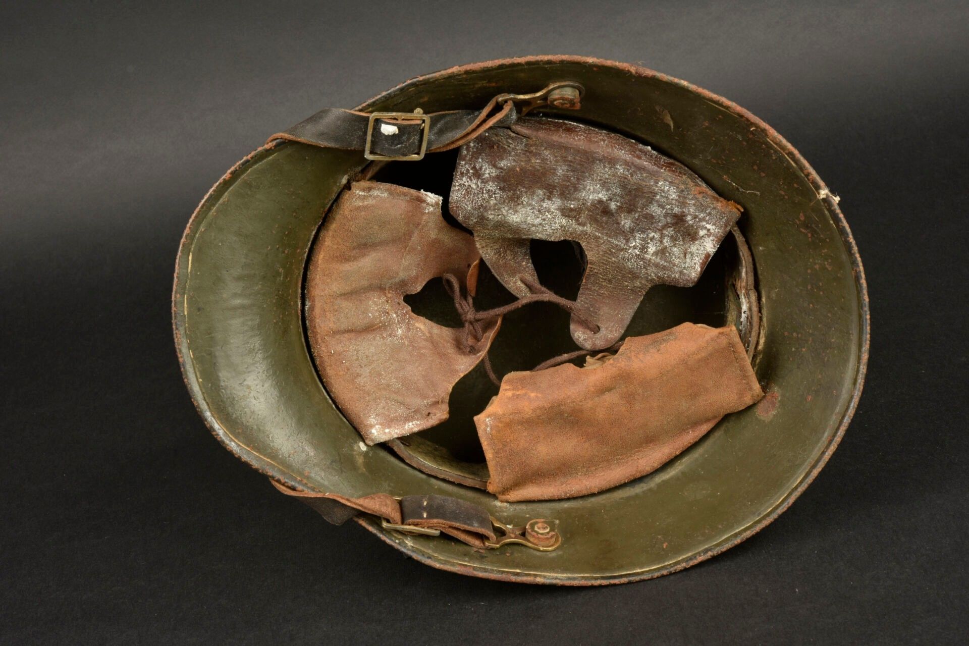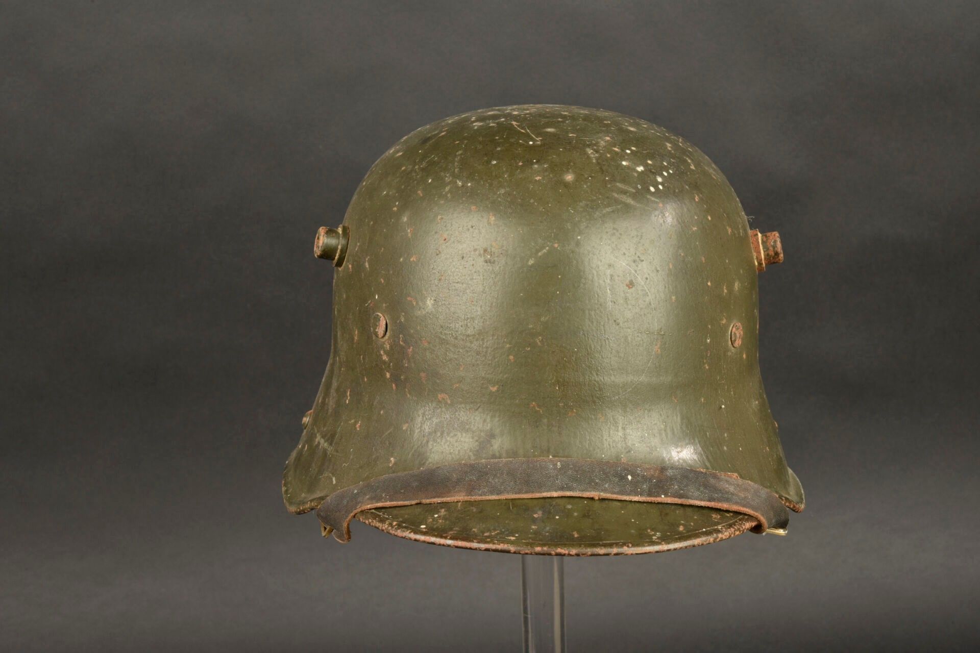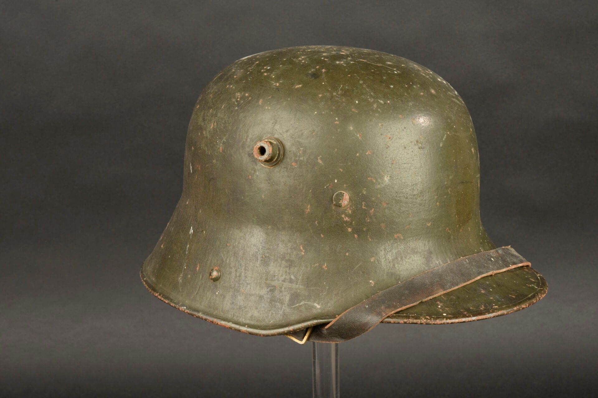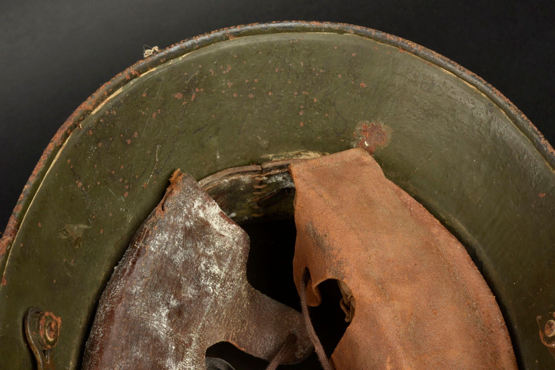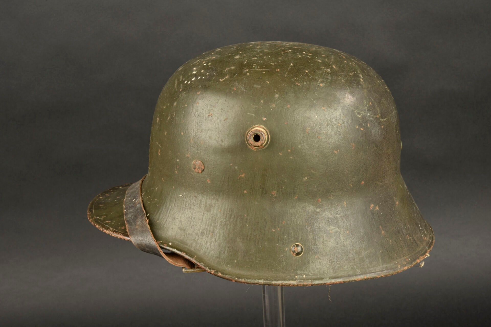 Stahlhelm M16 Feldgrau hull. Nice hull marked GBN for Gebrüder Bing Nürnberg size 64. Beautiful Feldgrau paint. Leather headband. 3 leather panels, 2 appear to be replacements. A reproduction chinstrap. II