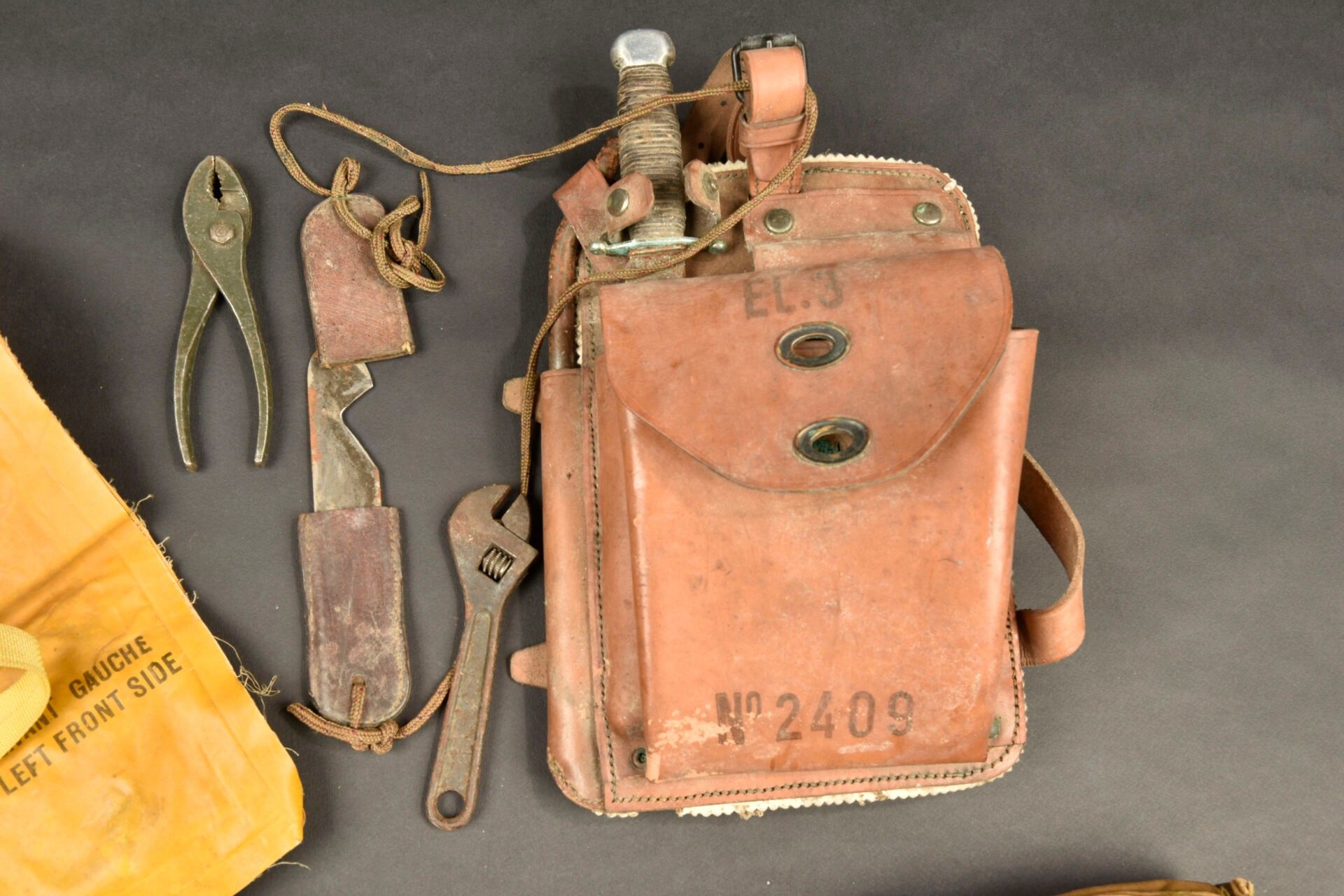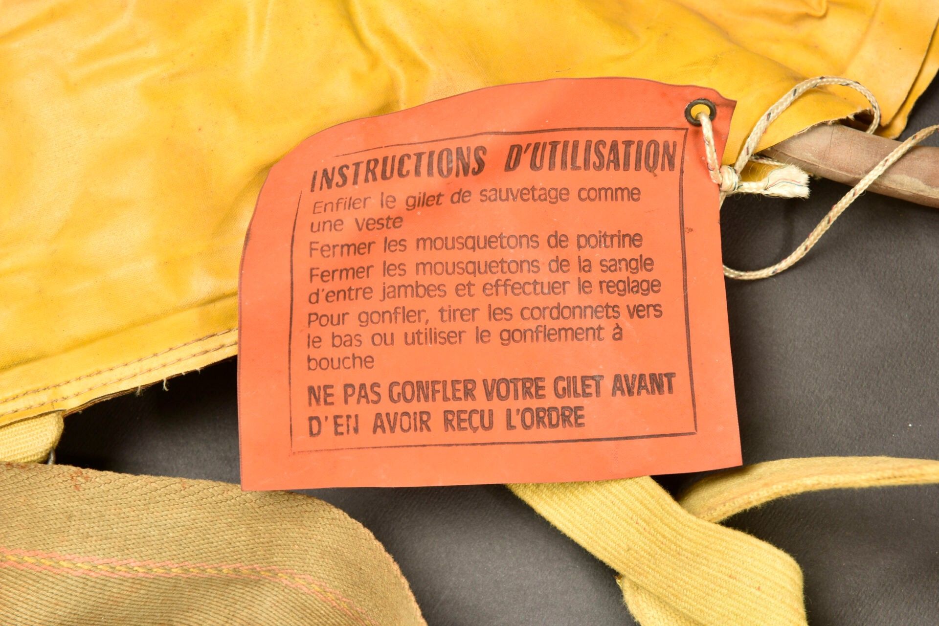 Lot of flight equipment. Comprising a civilian EL3 release kit with key, pliers and release knife, flap lock damaged, all straps present. A strap cutter in its leather case, an Aerazur type 101P life jacket dated June 1969, with its rubber straps (dry). An Algerian war era parachutist long gun jump sheath. Condition II+