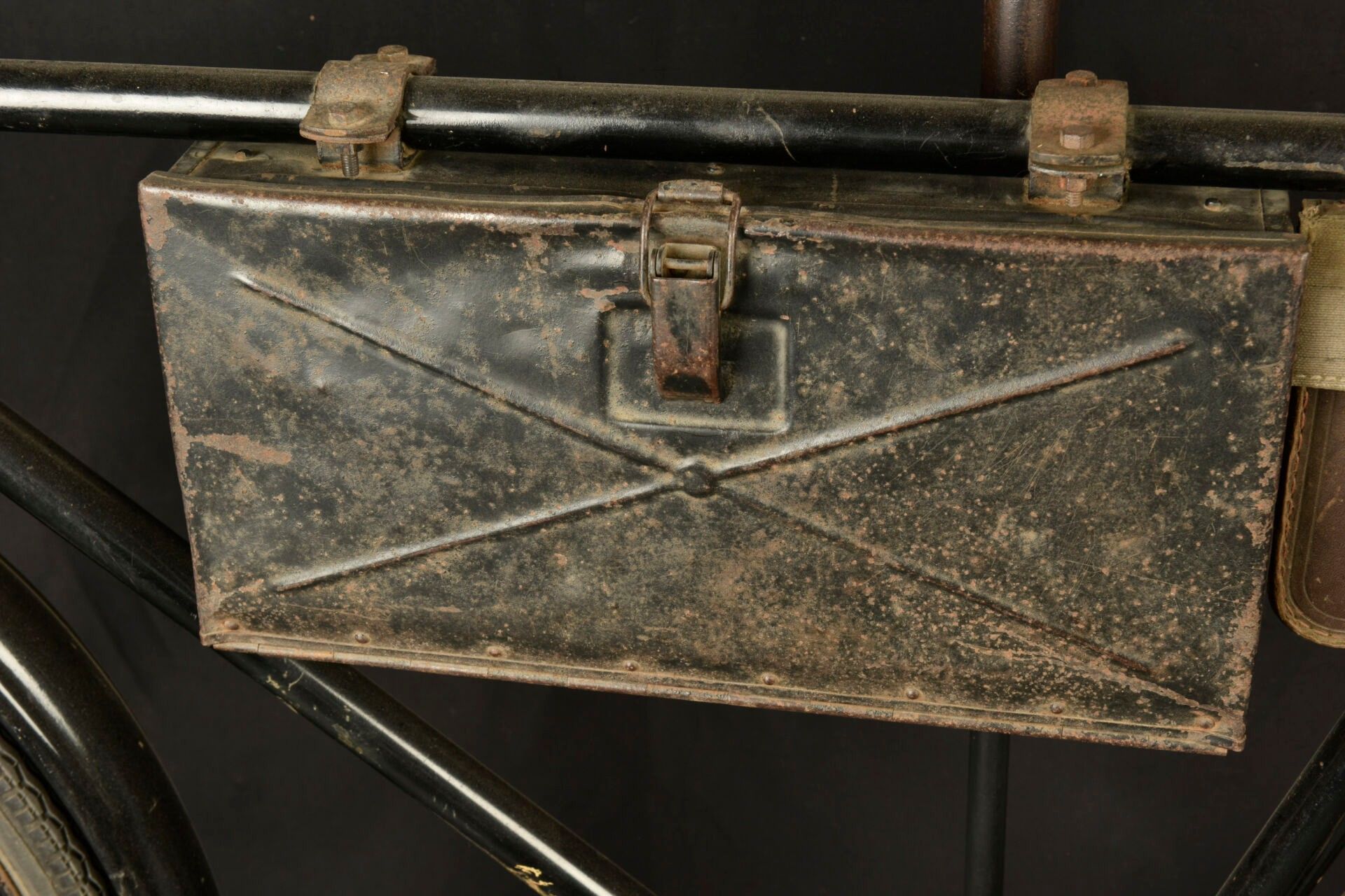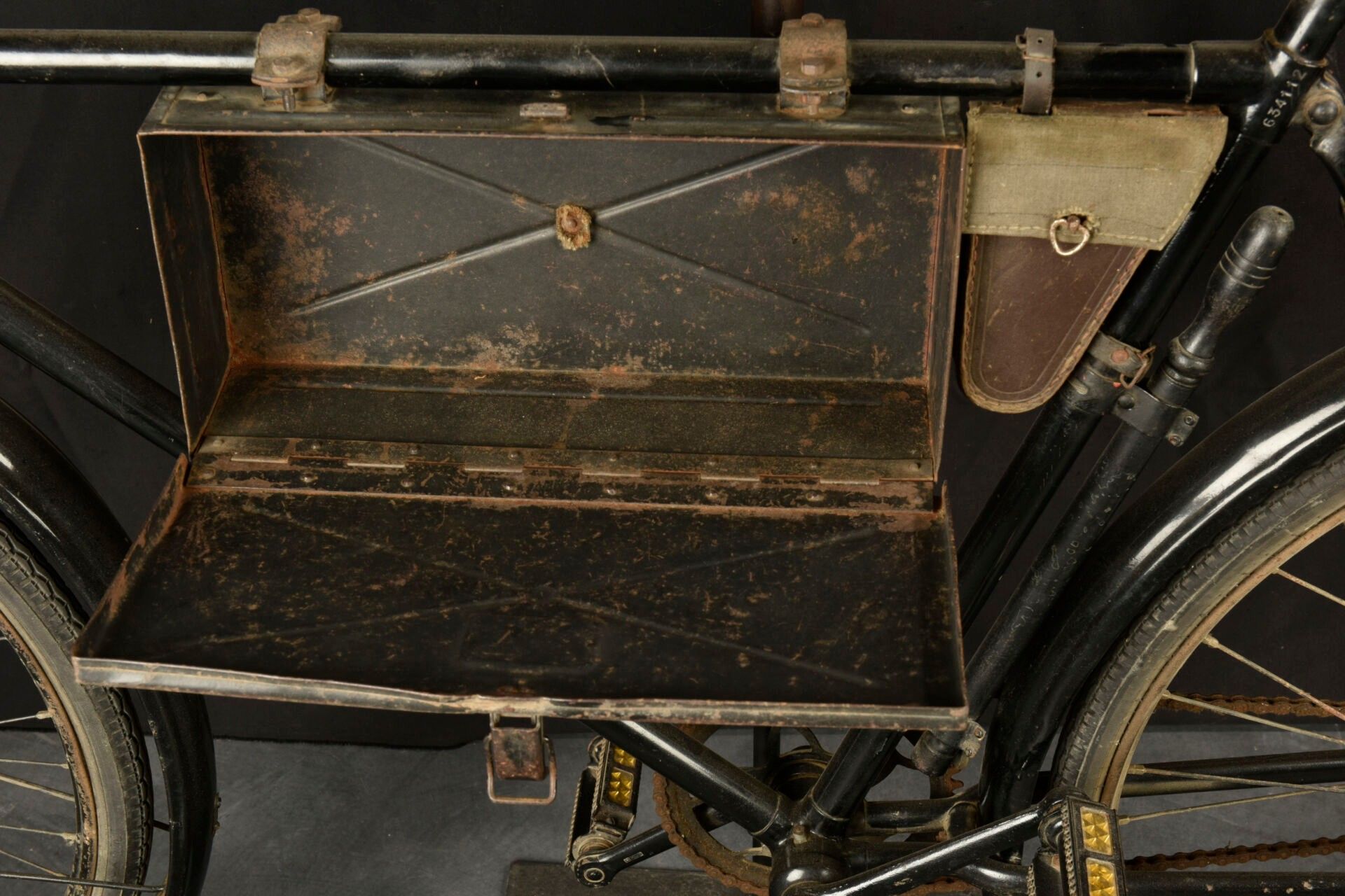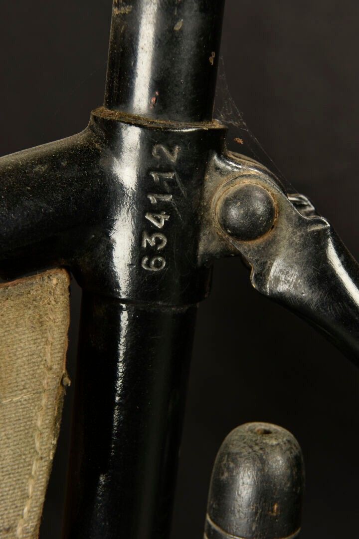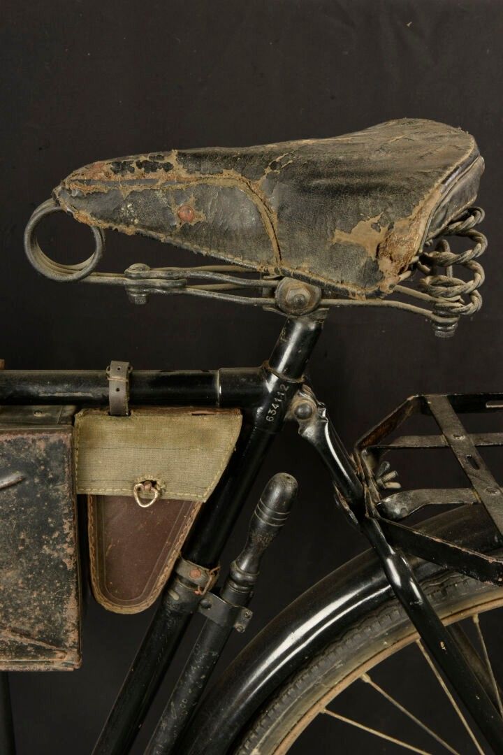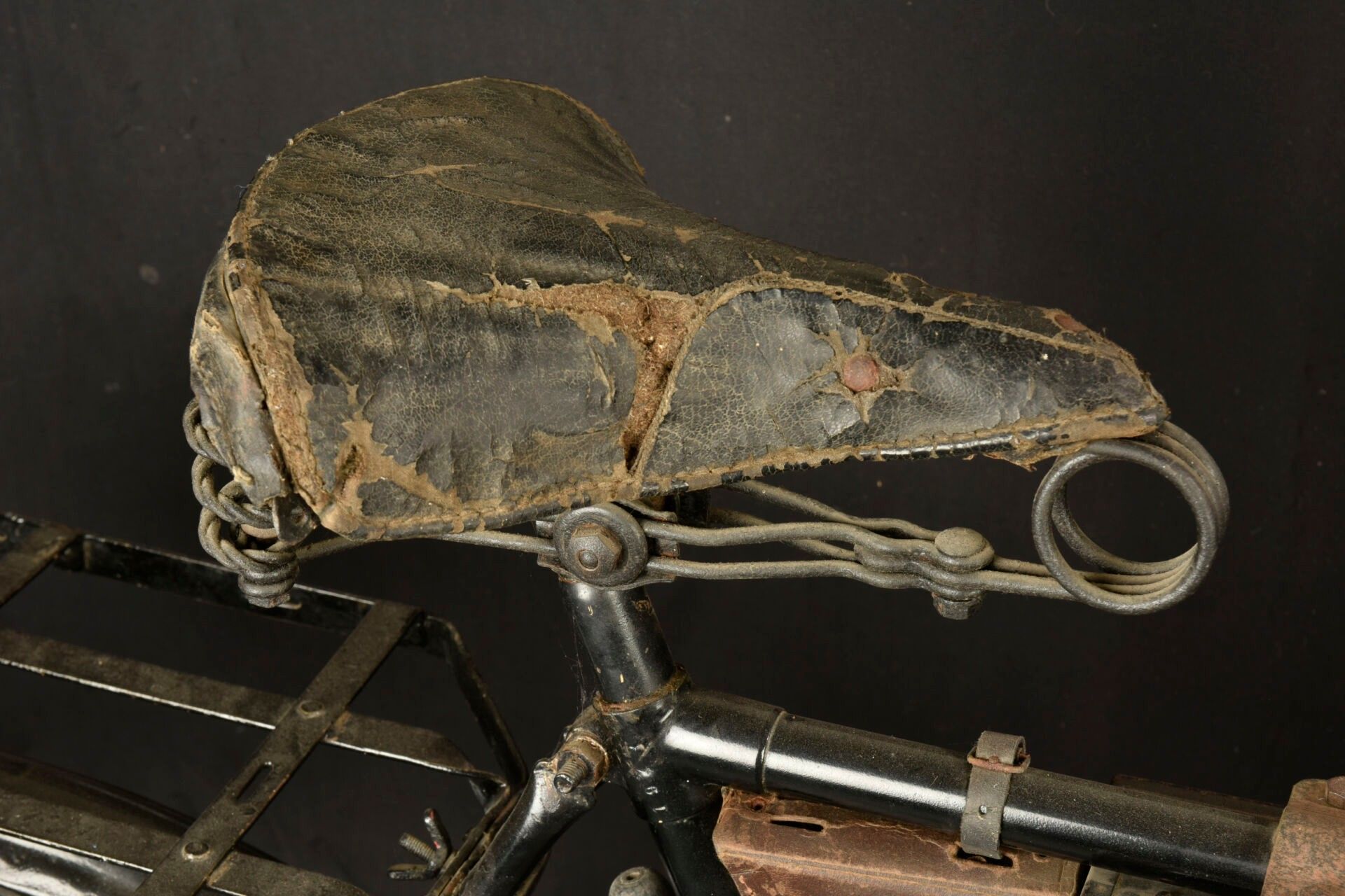 German bike. Metal frame, dated 1943 and number 634112. 70% black paintwork. The mudguards are present, the rear has white paint. Manufacturer's plate illegible. Spoked wheels. Deflated tyres. Brakes are functional. Empty metal tool box, supports complete but oxidised. Small leather tool pouch, empty. Saddle badly damaged. Pedals with reflectors repainted. Chain complete, but oxidised. Complete bicycle pump. Metal luggage rack, repainted. Handles have been replaced with plasters. Some wear and patina. Condition II+. 2+