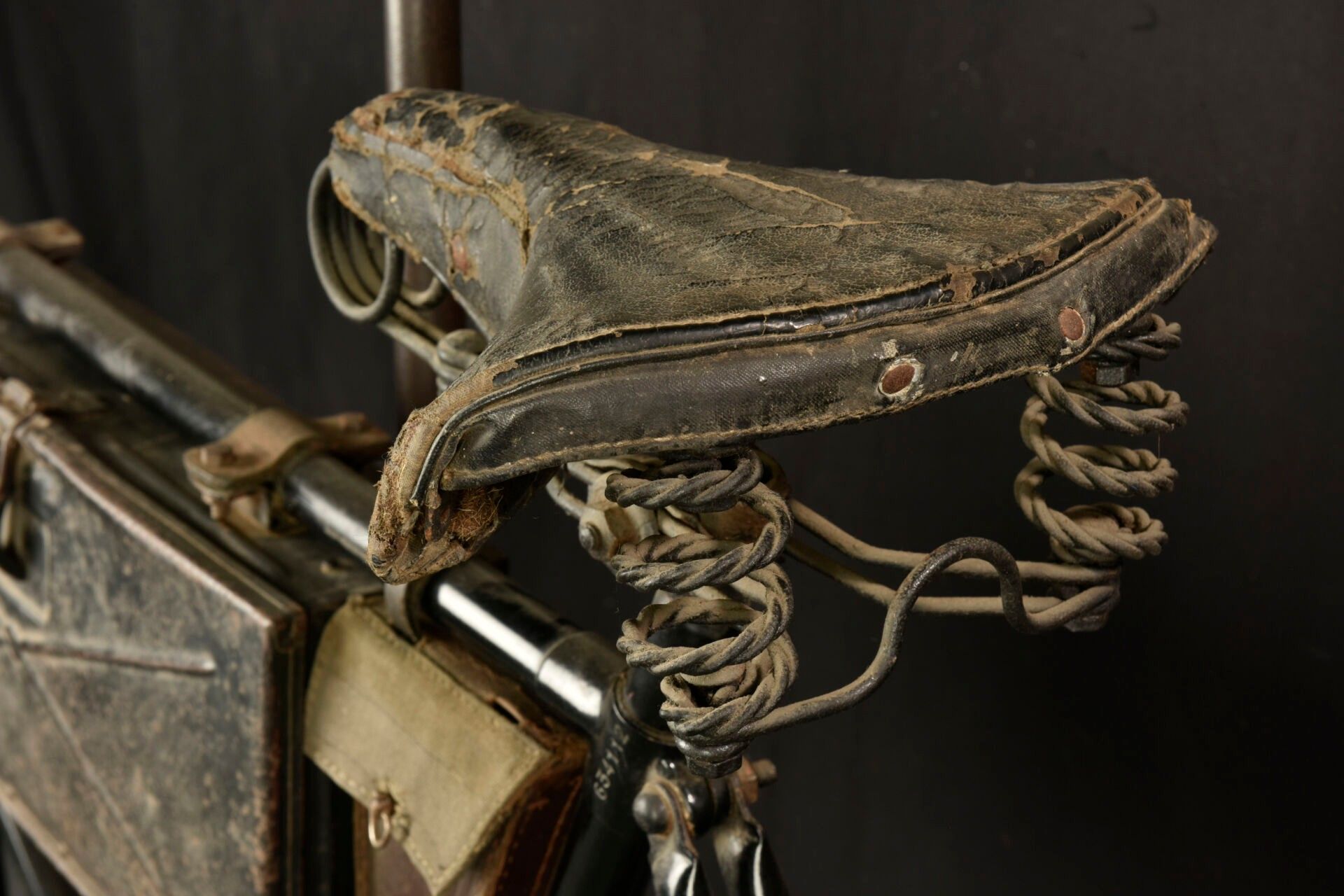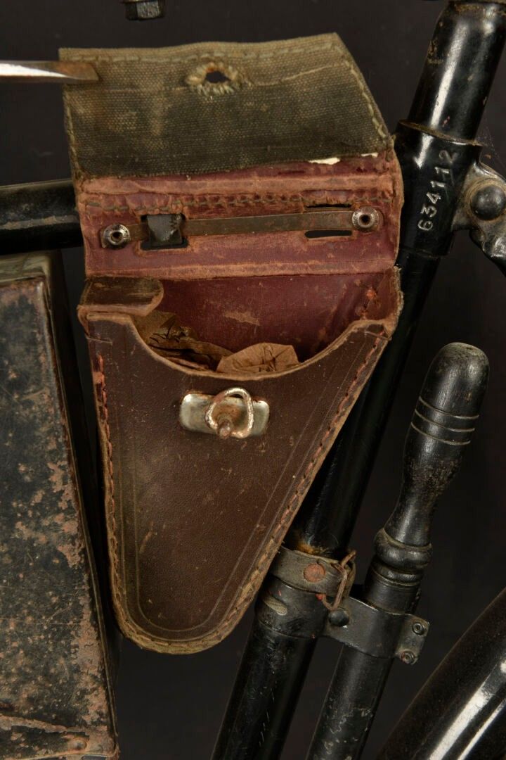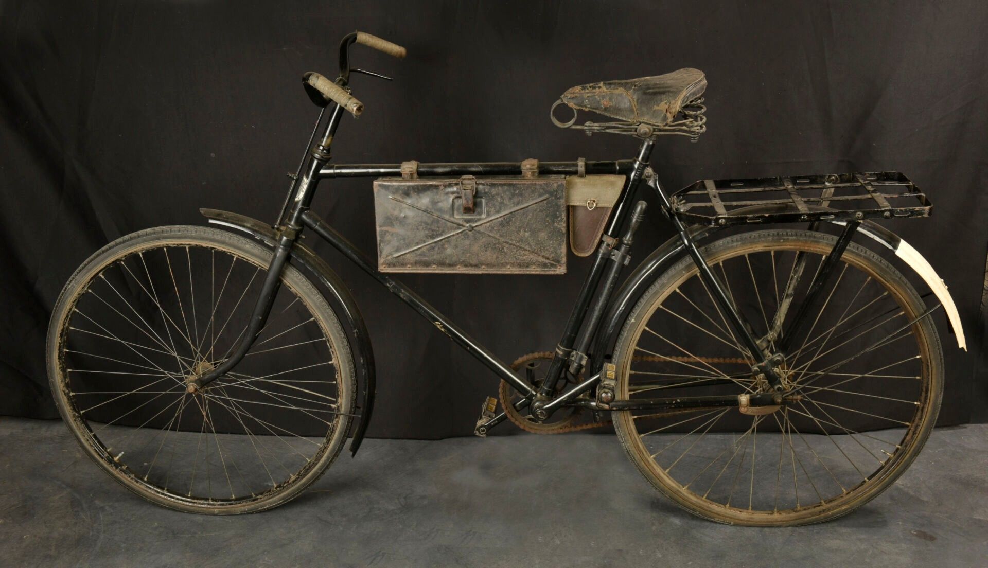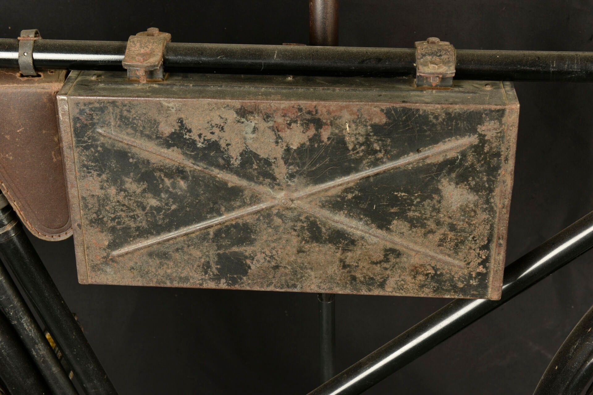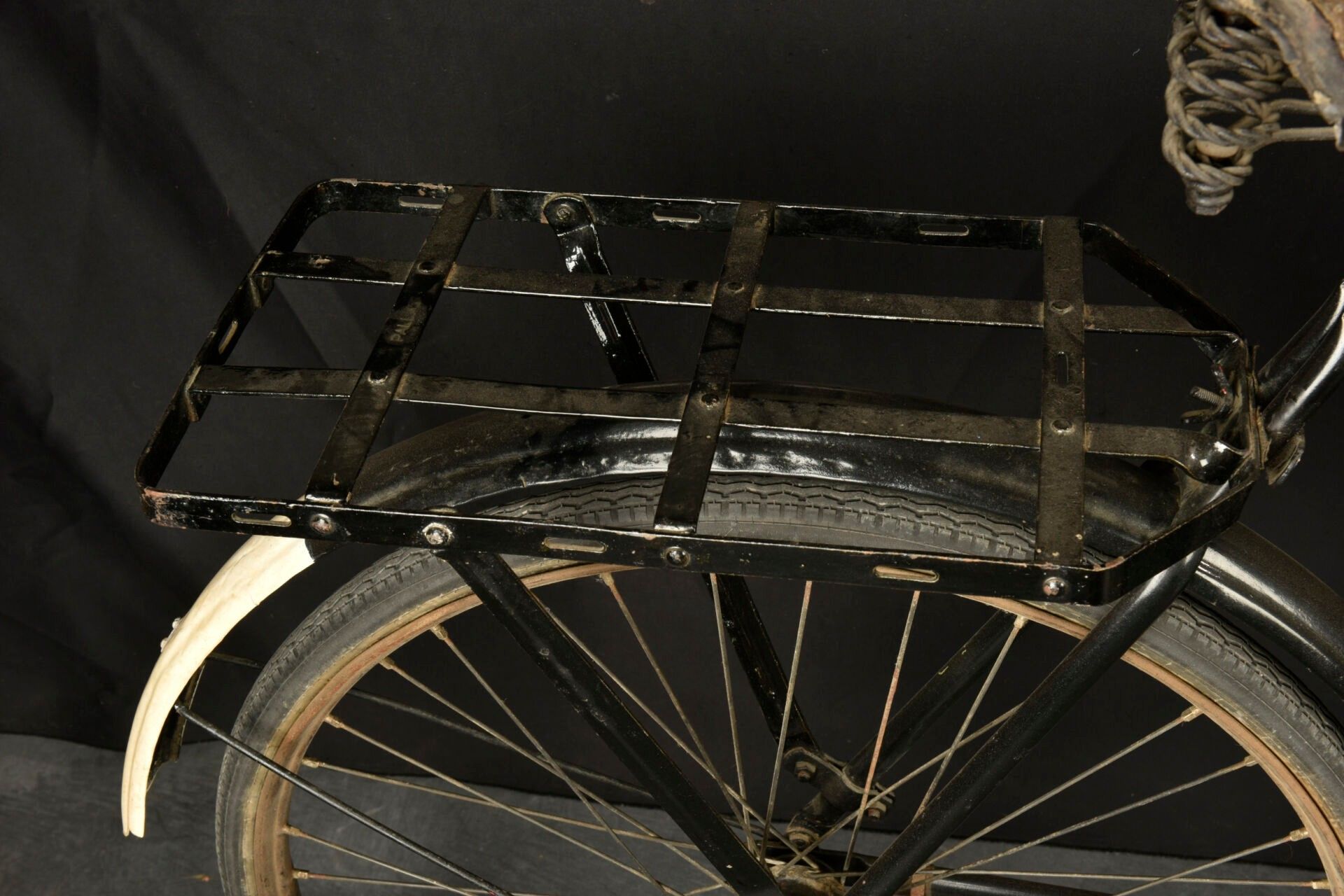German bike. Metal frame, dated 1943 and number 634112. 70% black paintwork. The mudguards are present, the rear has white paint. Manufacturer's plate illegible. Spoked wheels. Deflated tyres. Brakes are functional. Empty metal tool box, supports complete but oxidised. Small leather tool pouch, empty. Saddle badly damaged. Pedals with reflectors repainted. Chain complete, but oxidised. Complete bicycle pump. Metal luggage rack, repainted. Handles have been replaced with plasters. Some wear and patina. Condition II+. 2+