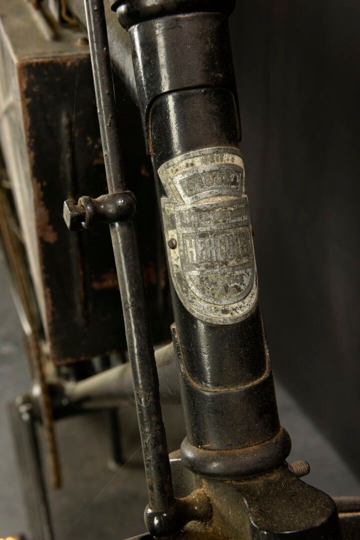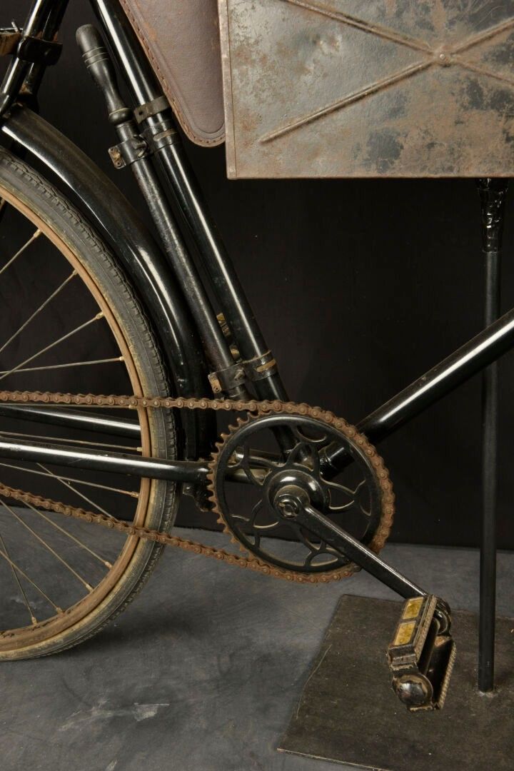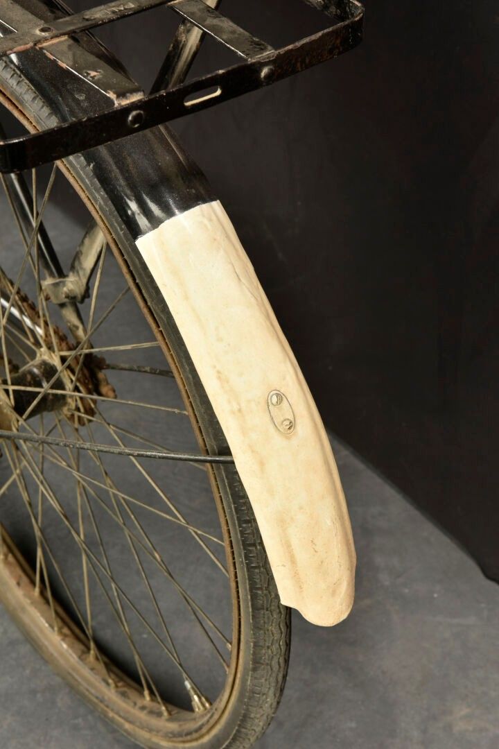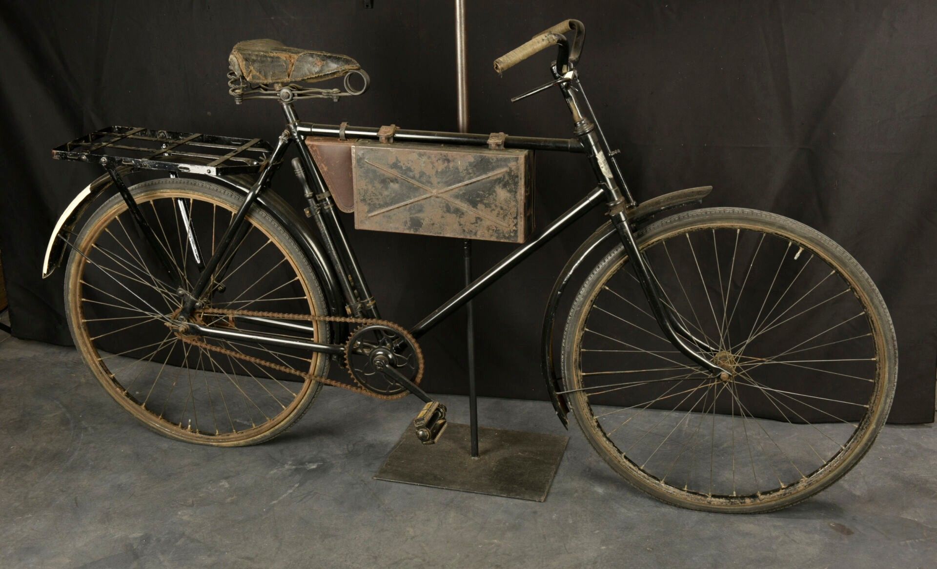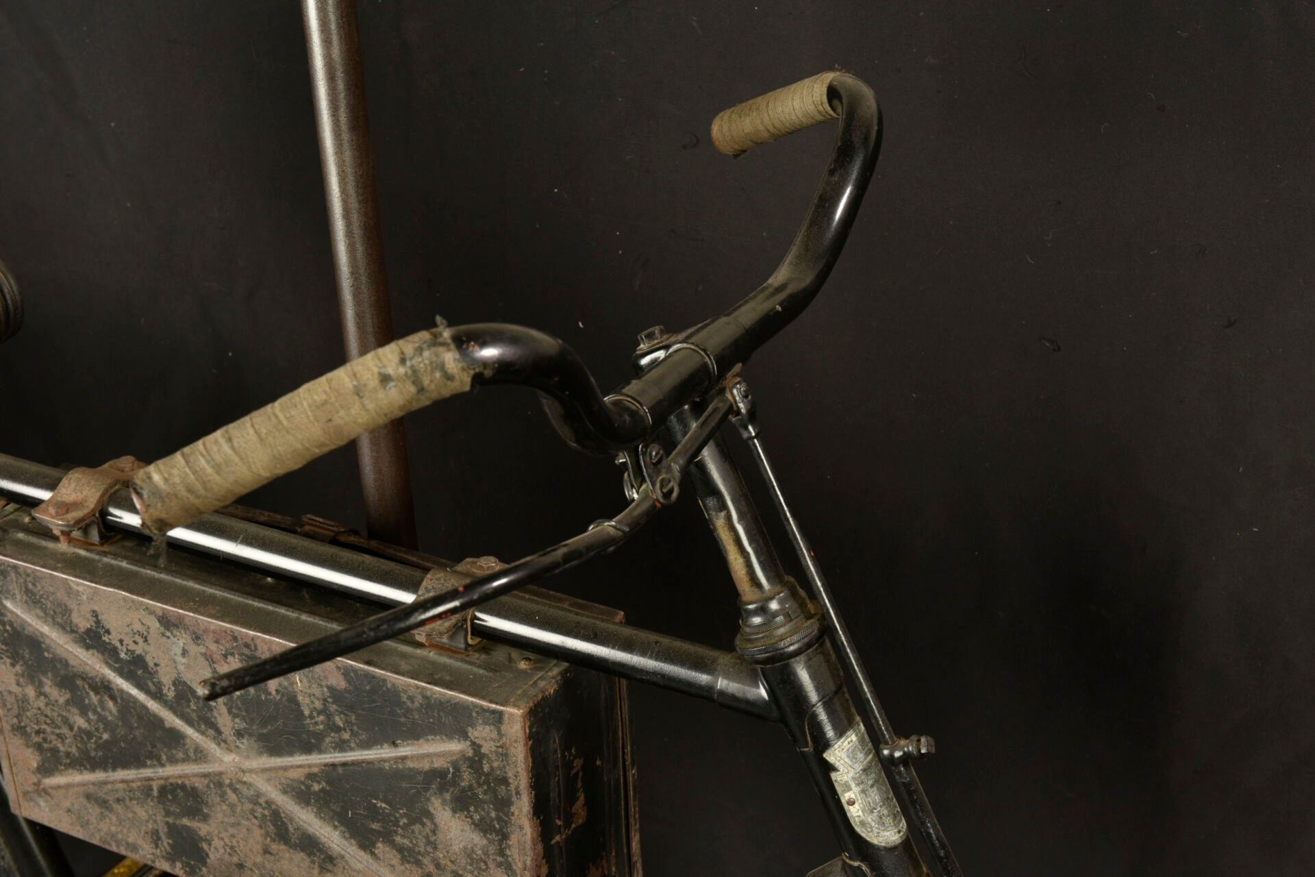 German bike. Metal frame, dated 1943 and number 634112. 70% black paintwork. The mudguards are present, the rear has white paint. Manufacturer's plate illegible. Spoked wheels. Deflated tyres. Brakes are functional. Empty metal tool box, supports complete but oxidised. Small leather tool pouch, empty. Saddle badly damaged. Pedals with reflectors repainted. Chain complete, but oxidised. Complete bicycle pump. Metal luggage rack, repainted. Handles have been replaced with plasters. Some wear and patina. Condition II+. 2+