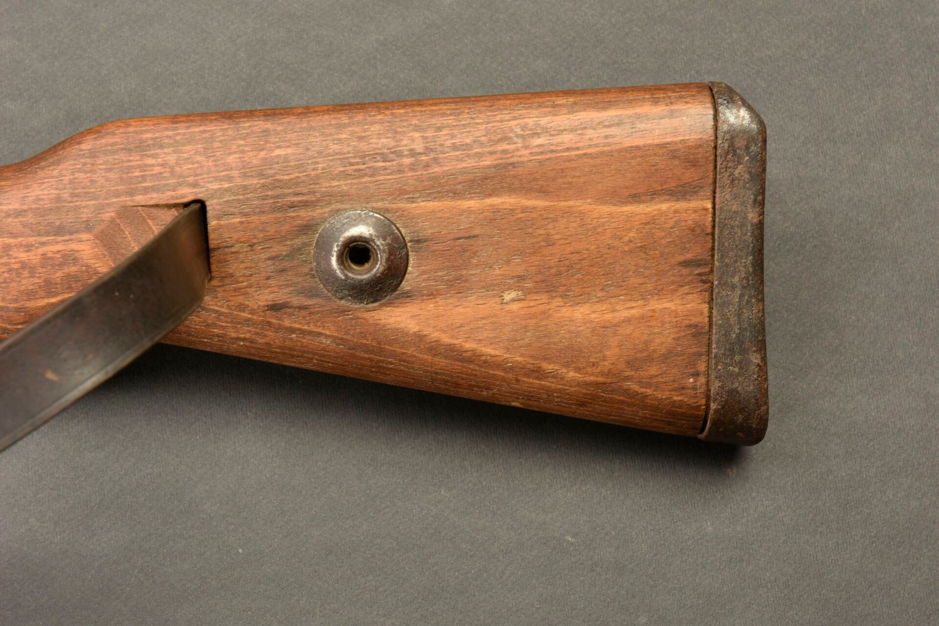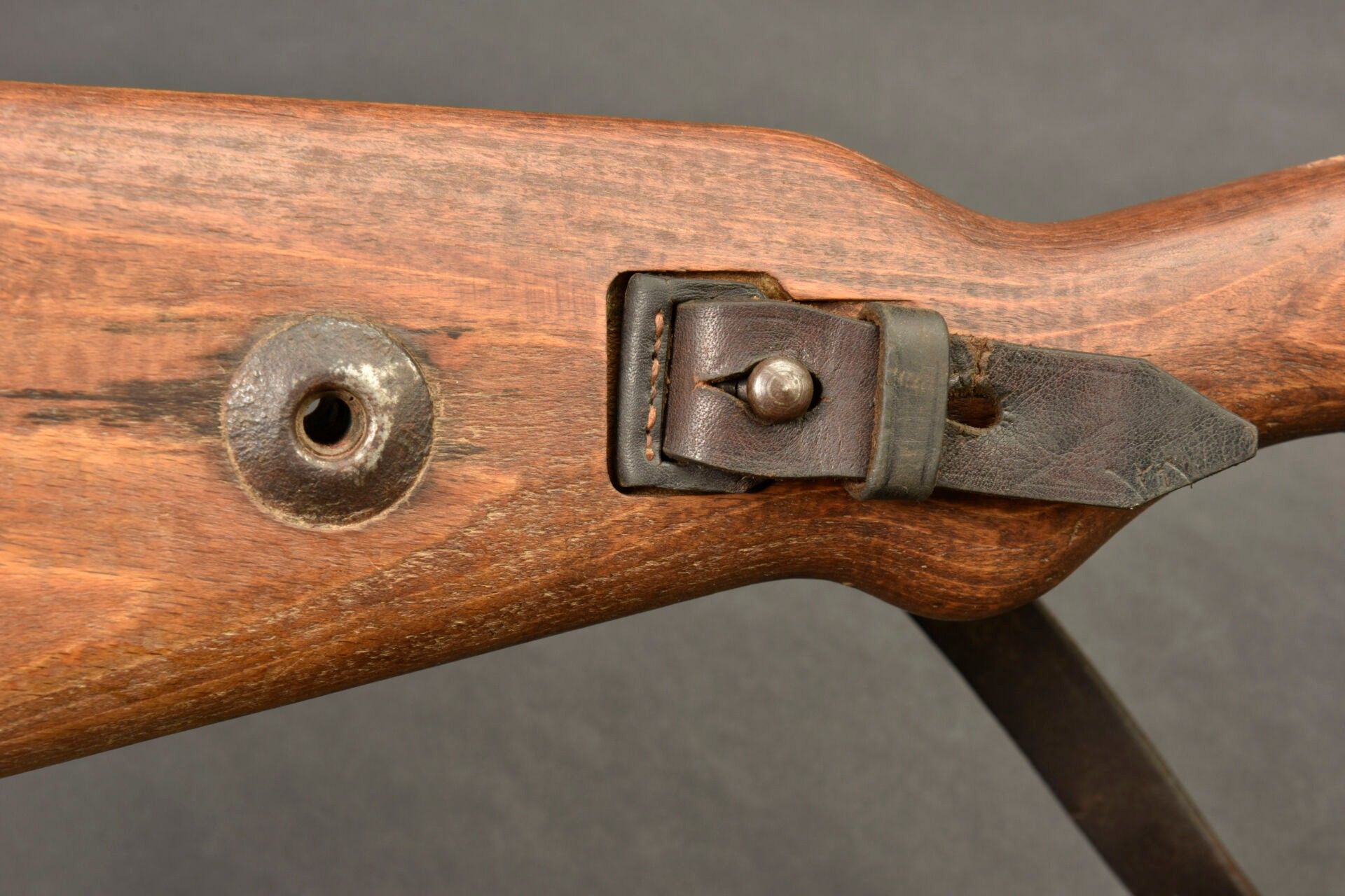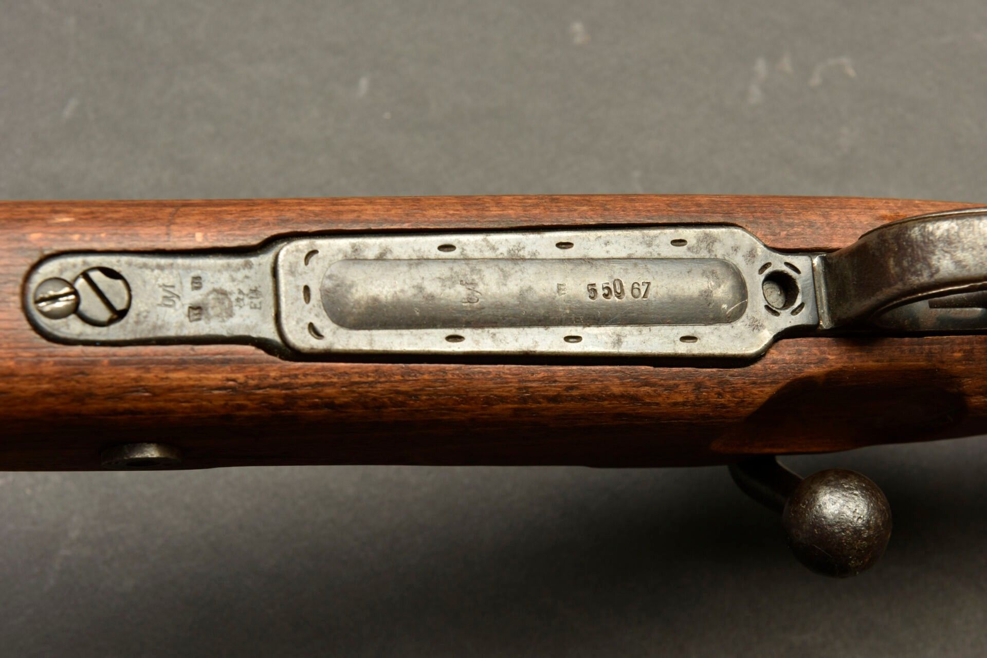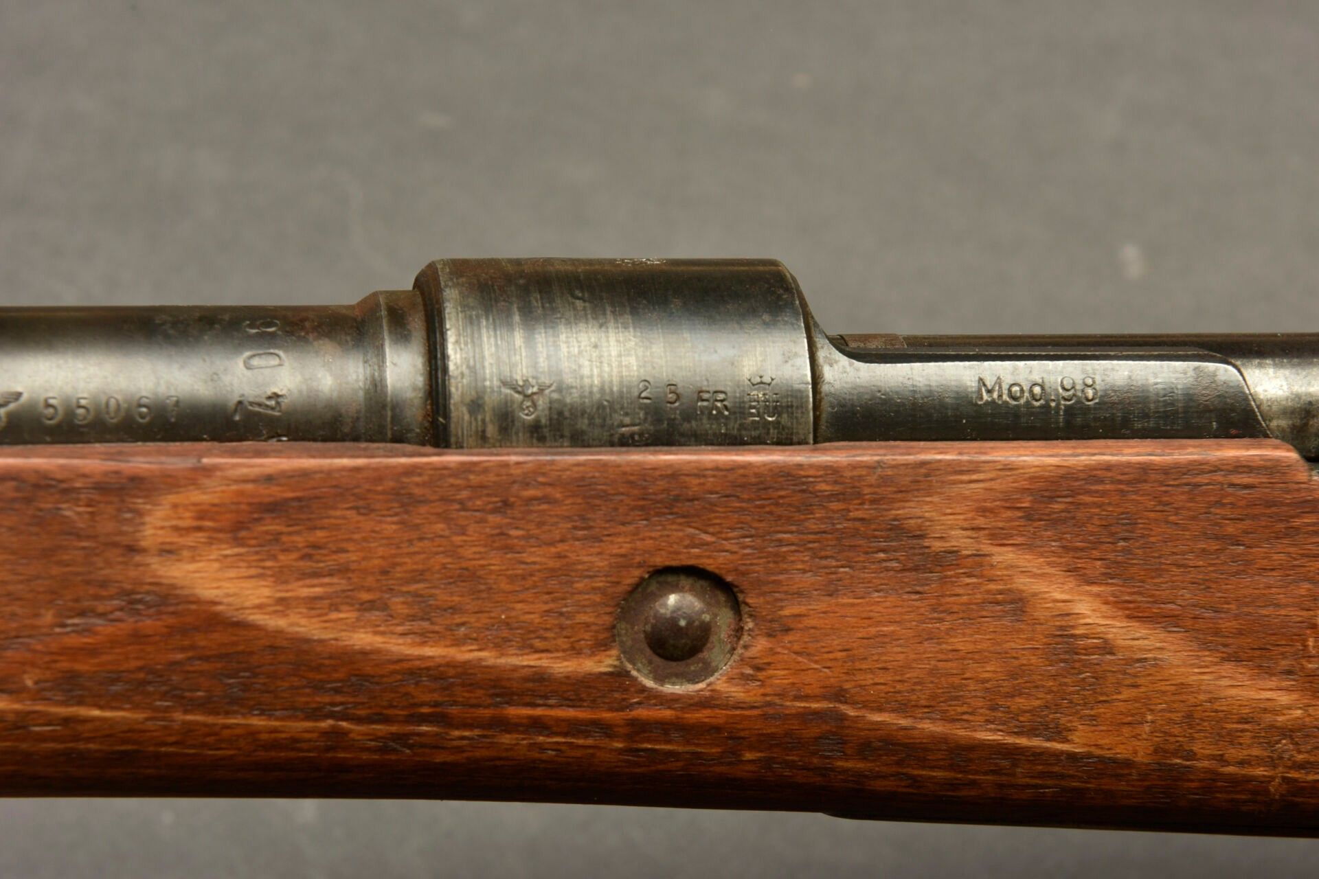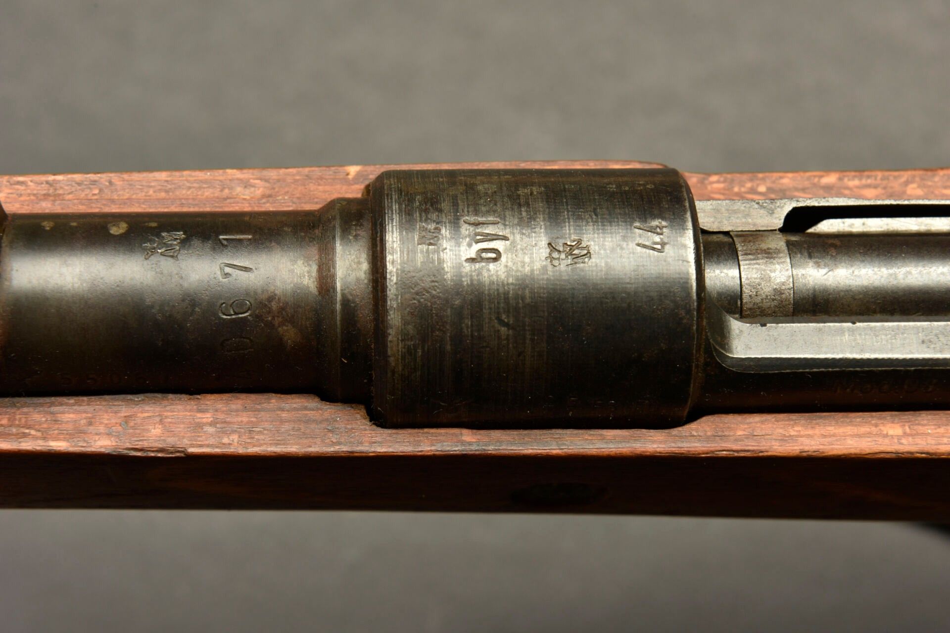 Mauser 98K repeating rifle. The metal parts are partially oxidized. The cleaning rod and front sight protector are present. Nice wooden stock, no visible markings. Barrel numbered 55067 and 4D671, numerous WAA eagles. Breech number 1576. Gun visibly with the number except the breech. Manufacture BYF 44. Nice full leather sling. Some wear and patina. Condition II+. C9 category weapon. Firearms neutralised EU 2017. At the time of purchase, the purchaser must present a valid identity document (CNI or passport) and, depending on the case, either a