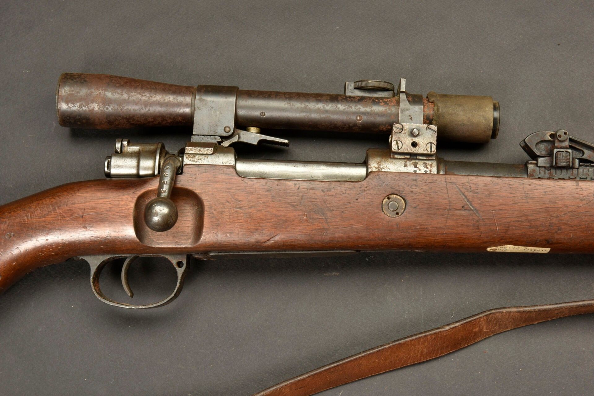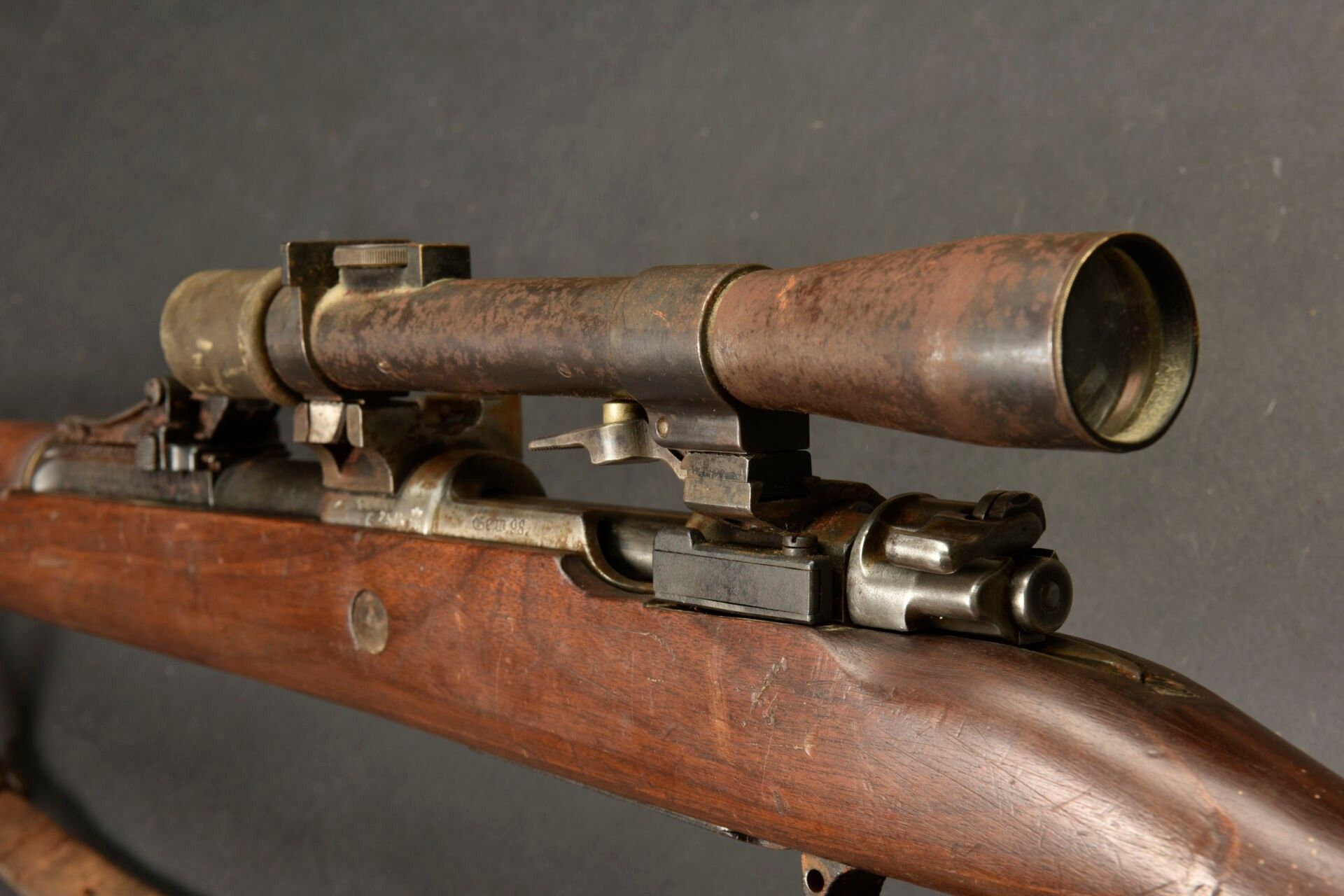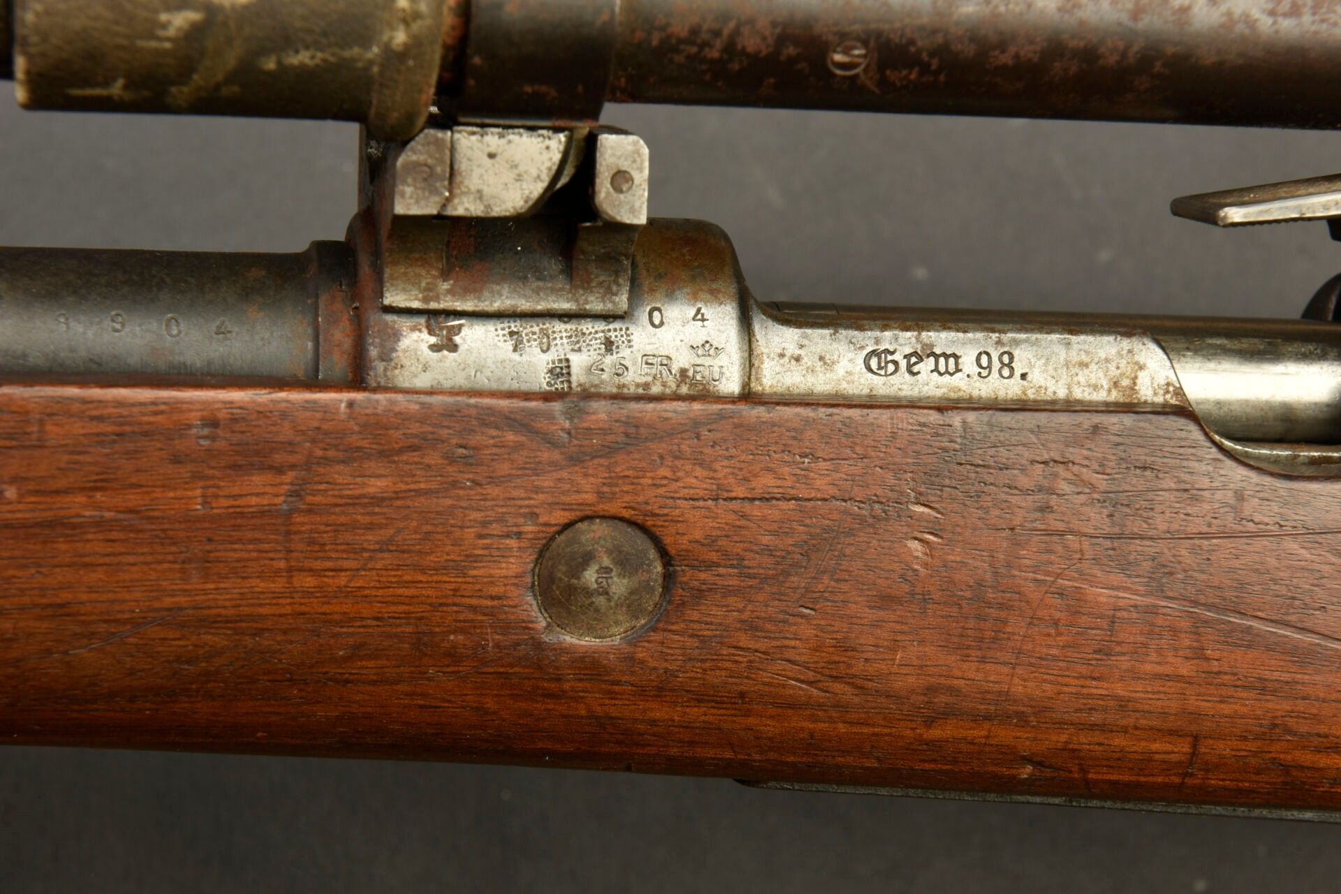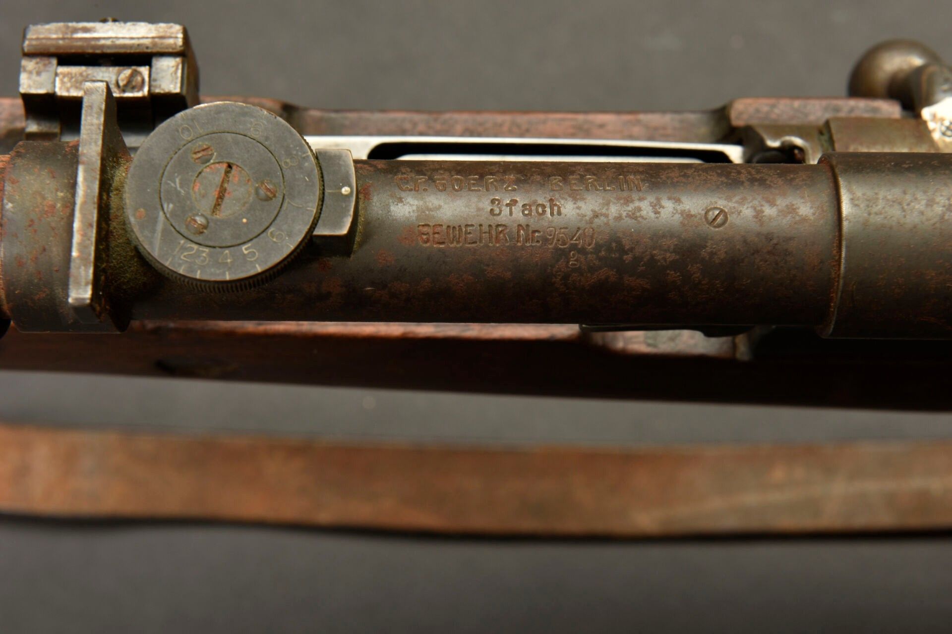 G98 repeating rifle with bezel. Metal parts show some oxidation. Cleaning rod complete. Number 8904G. Dated 1915. Manufacturer's markings not visible as covered by scope. The gun is obviously numbered. Beautiful wooden stock with B markings under crown. Partially oxidised metal bezel. CE Goerz Berlin 31 ACH Gewehr Nr 9540 markings. Optics in perfect condition. Leather shoulder strap complete. Breech blocked by neutralisation. Some original repairs on the stock. Some wear and patina. Condition II+. C9 category weapon. Firearms deactivated EU 2017. At the time of purchase, the purchaser must present a valid identity document (CNI or passport) and according to the case, either an original medical certificate of less than 1 month + account SIA-holder, or a copy of both sides of the hunting licence accompanied by validation for the current year or year n-1 and the SIA-holder's account, or the sports shooting licence for the current year (licence + licence certificate downloaded from EDEN-ITAC + the sports shooter's SIA-holder's account). If the billing address is different from that shown on the identity document, proof of address less than 1 month old must be produced. The transaction will not take place until FINIADA has been consulted. The formalities and consultation of this file will be invoiced at €50 per weapon purchased (€25 inc. VAT for a professional buyer).