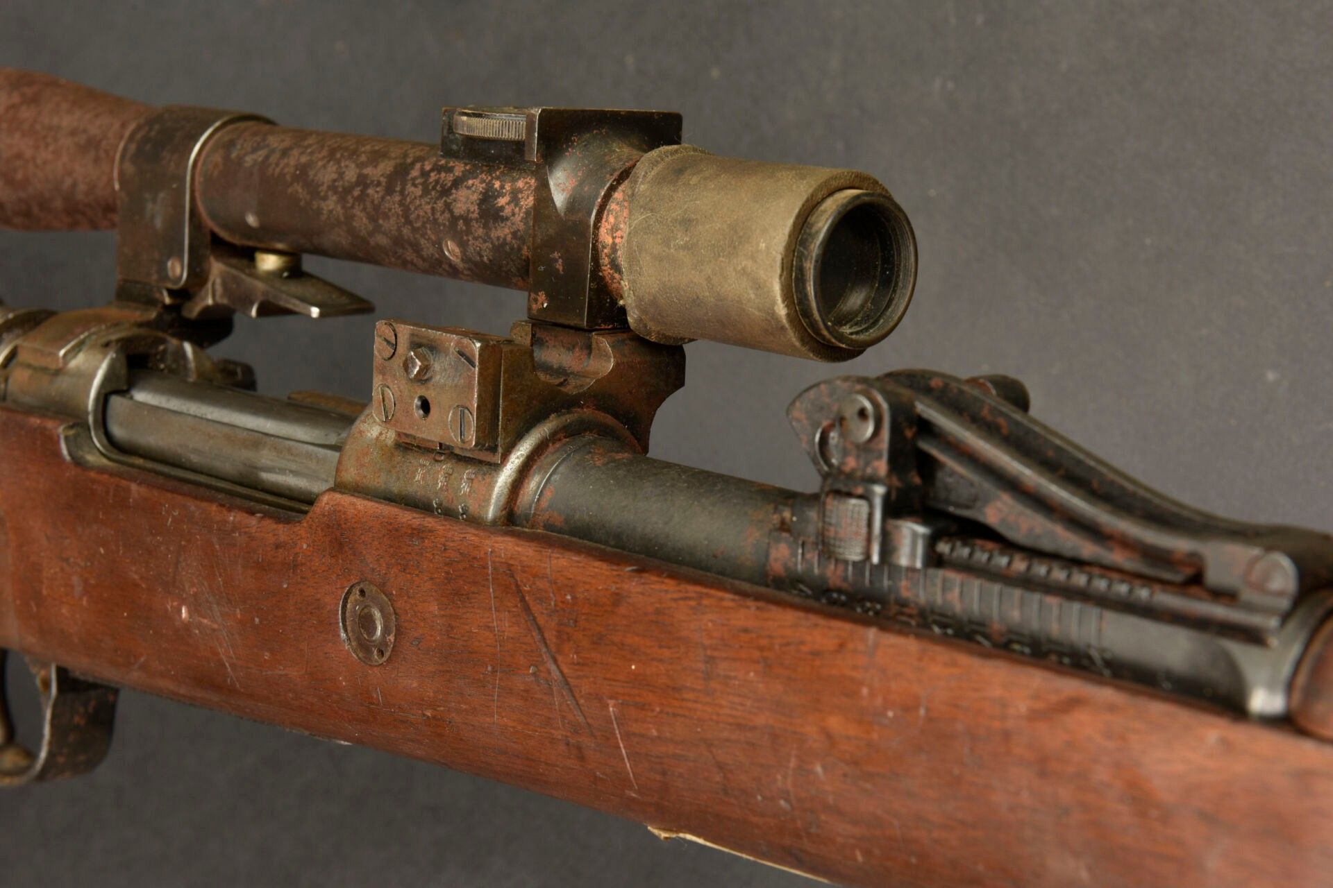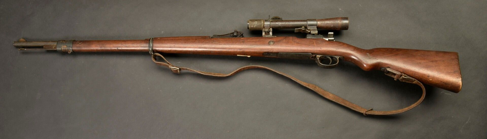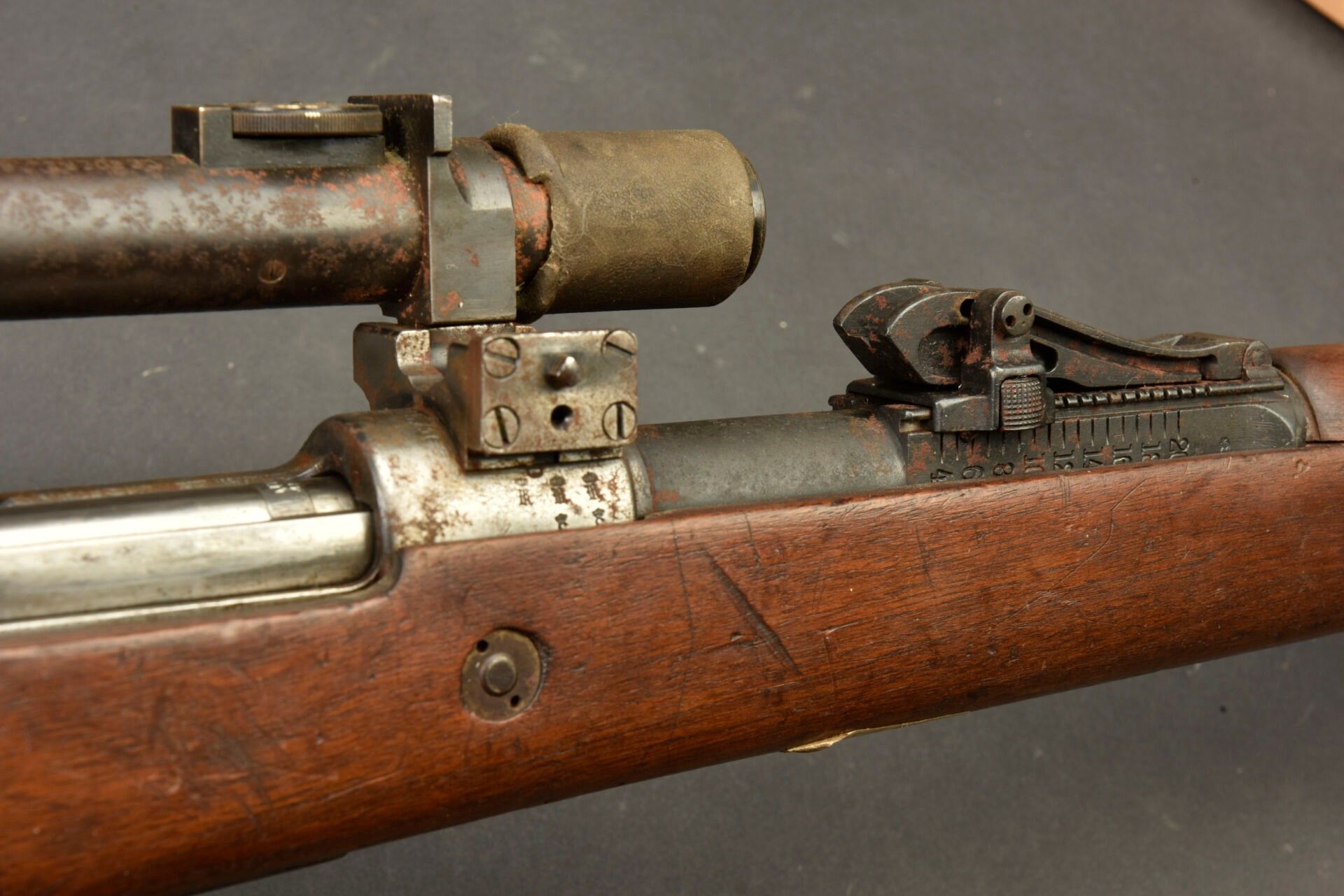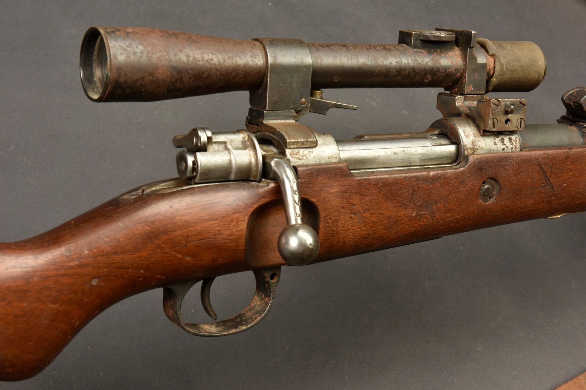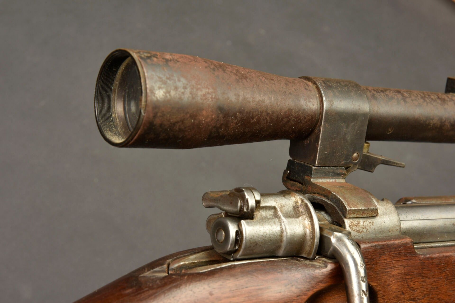 G98 repeating rifle with bezel. Metal parts show some oxidation. Cleaning rod complete. Number 8904G. Dated 1915. Manufacturer's markings not visible as covered by scope. The gun is obviously numbered. Beautiful wooden stock with B markings under crown. Partially oxidised metal bezel. CE Goerz Berlin 31 ACH Gewehr Nr 9540 markings. Optics in perfect condition. Leather shoulder strap complete. Breech blocked by neutralisation. Some original repairs on the stock. Some wear and patina. Condition II+. C9 category weapon. Firearms deactivated EU 2017. At the time of purchase, the purchaser must present a valid identity document (CNI or passport) and according to the case, either an original medical certificate of less than 1 month + account SIA-holder, or a copy of both sides of the hunting licence accompanied by validation for the current year or year n-1 and the SIA-holder's account, or the sports shooting licence for the current year (licence + licence certificate downloaded from EDEN-ITAC + the sports shooter's SIA-holder's account). If the billing address is different from that shown on the identity document, proof of address less than 1 month old must be produced. The transaction will not take place until FINIADA has been consulted. The formalities and consultation of this file will be invoiced at €50 per weapon purchased (€25 inc. VAT for a professional buyer).