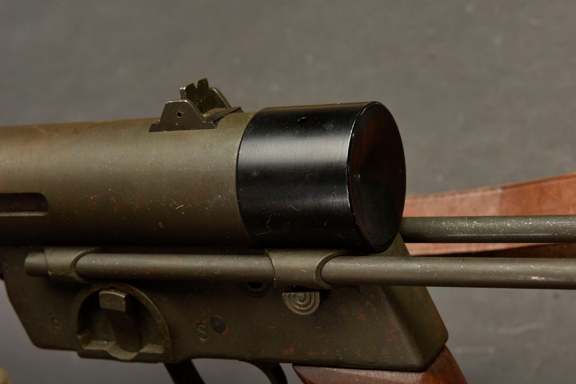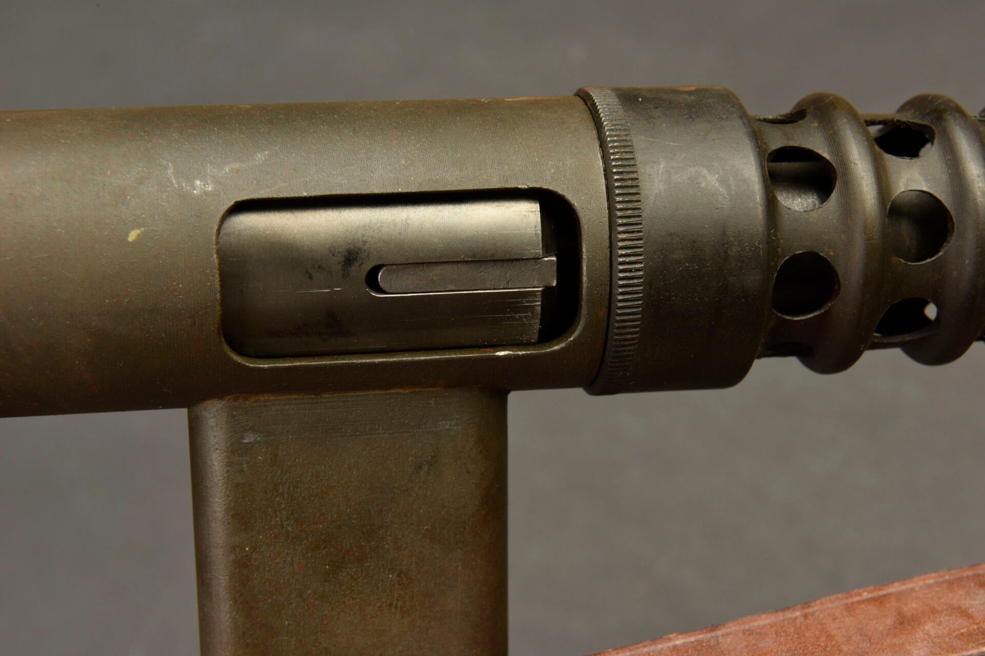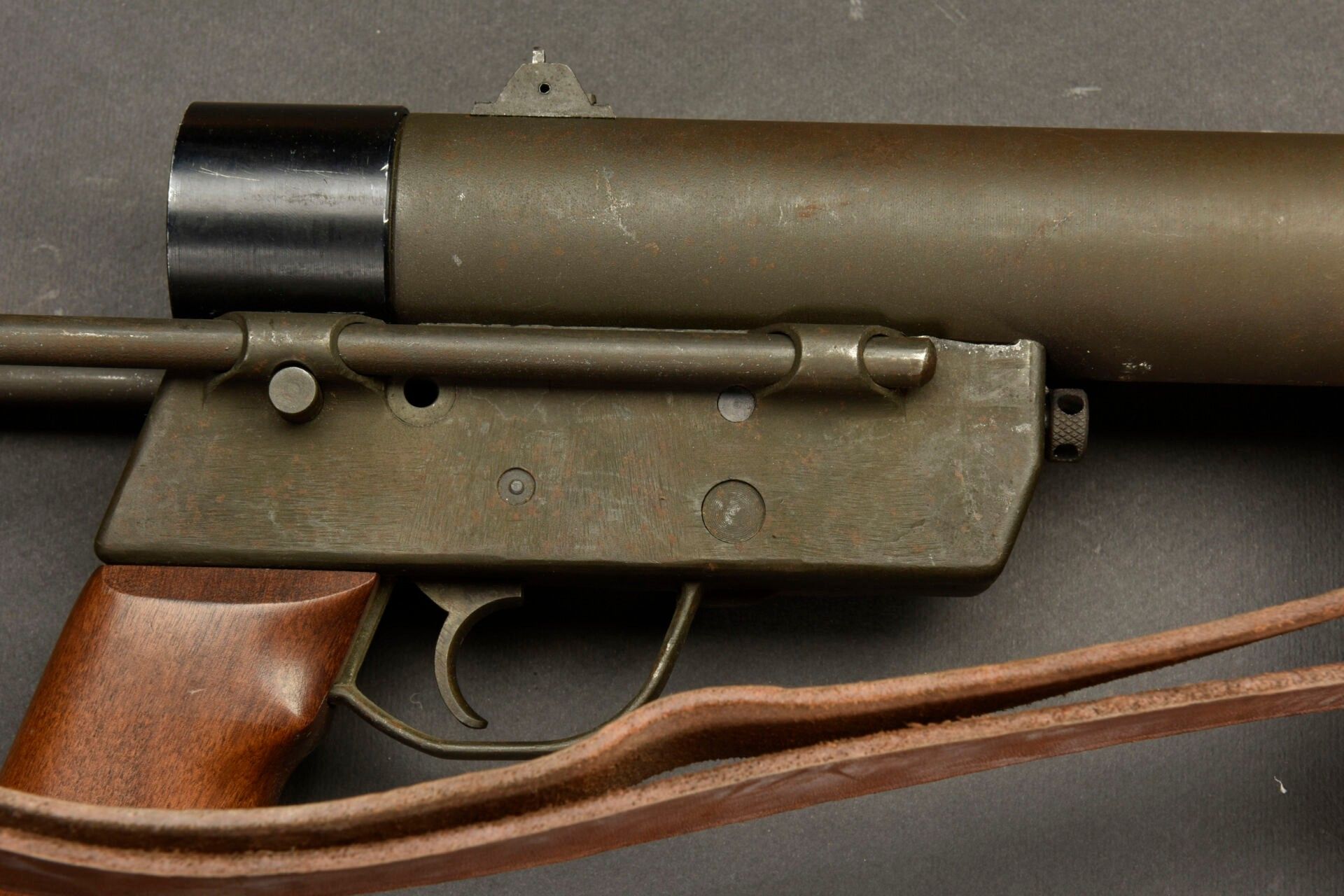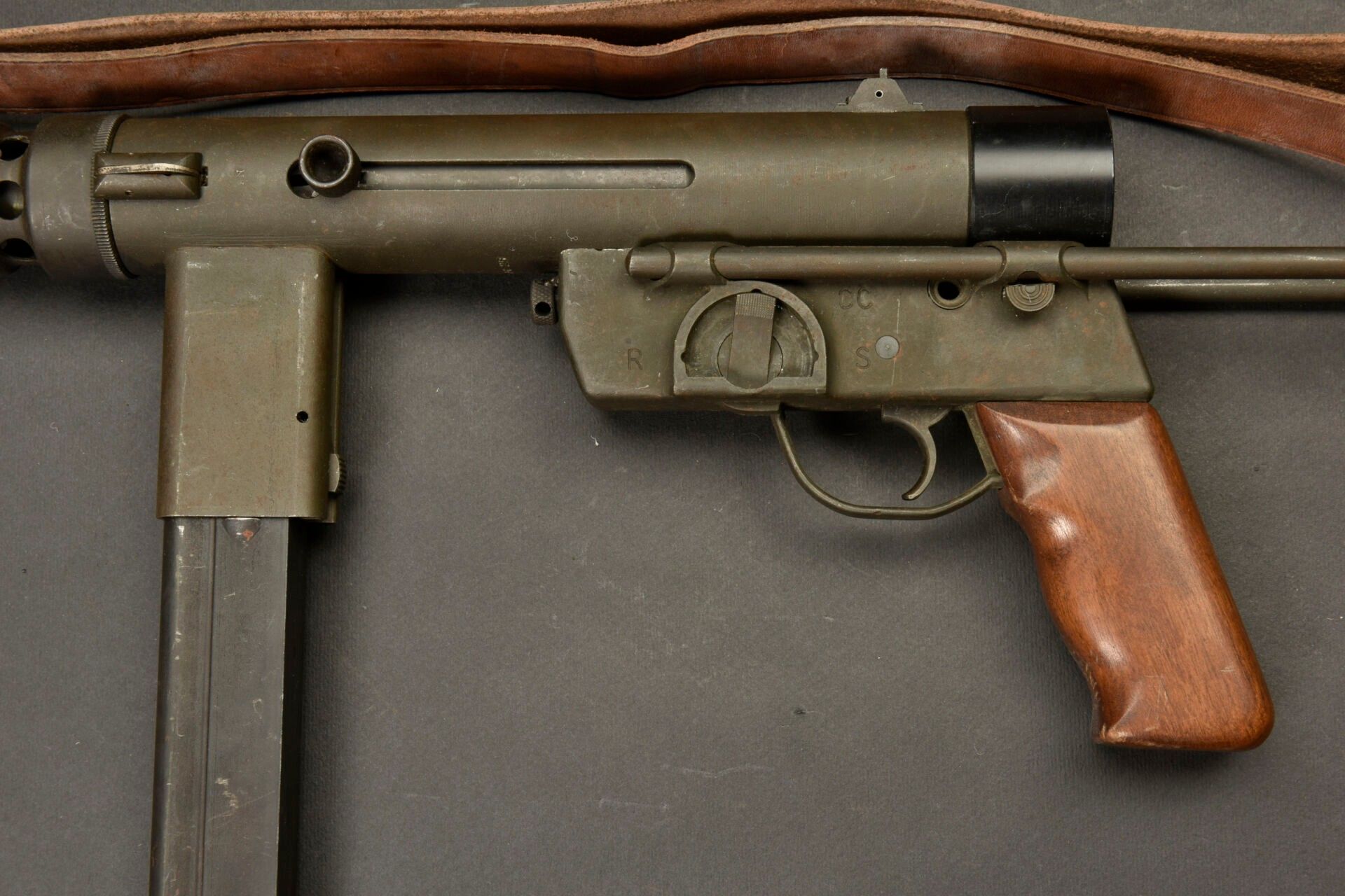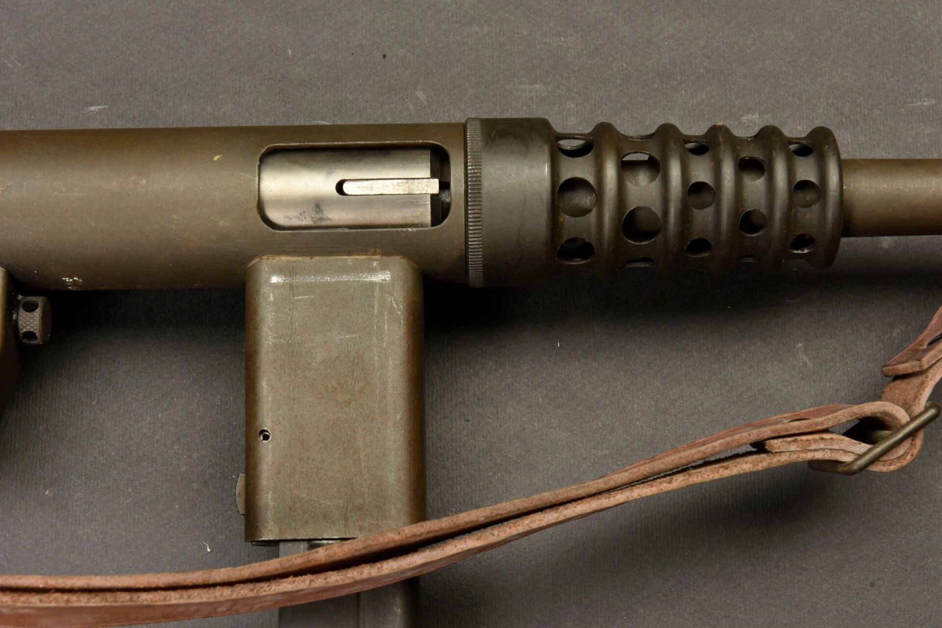 Gevarm D4 machine pistol. All metal, folding stock. Wooden handle. Magazine blocked by deactivation. Breech made mobile by neutralisation +. Number 356304. Complete leather shoulder strap. To note a certain wear and patina of the part. Condition II+. Used by French parachutist units prior to PM MAT 49. 2+ C9 category weapon. Firearms neutralised EU 2017. At the time of purchase, the purchaser must present a valid identity document (CNI or passport) and, depending on the case, either an original medical certificate less than 1 month old + SIA-holder account, or a copy of both sides of the hunting licence accompanied by validation for the current year or year n-1 and the SIA-holder's account, or the sports shooting licence for the current year (licence + licence certificate downloaded from EDEN-ITAC + sports shooter's SIA-holder's account). If the billing address is different from that shown on the identity document, proof of address less than 1 month old must be produced. The transaction will not take place until FINIADA has been consulted. The formalities and consultation of this file will be invoiced at €50 per weapon purchased (€25 inc. VAT for a professional buyer).