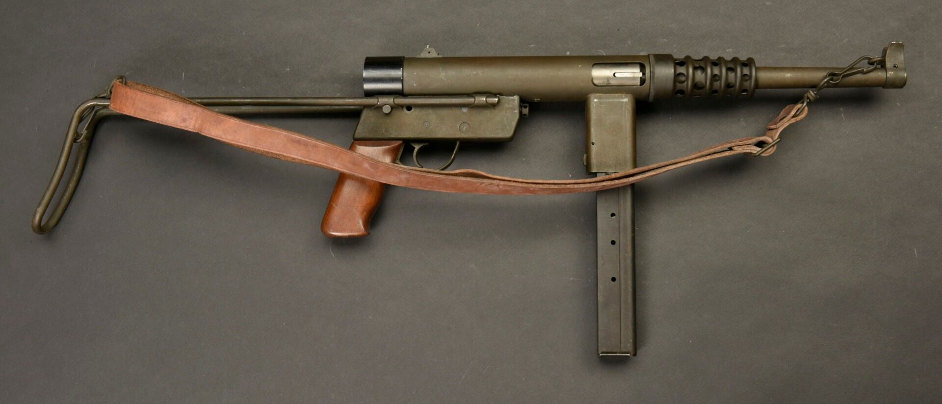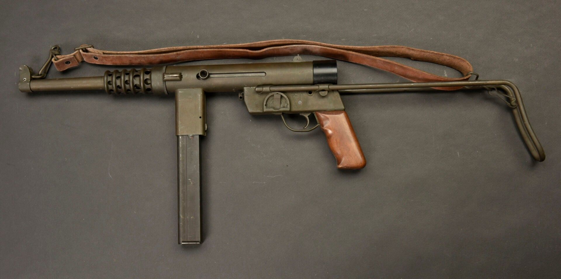 Gevarm D4 machine pistol. All metal, folding stock.