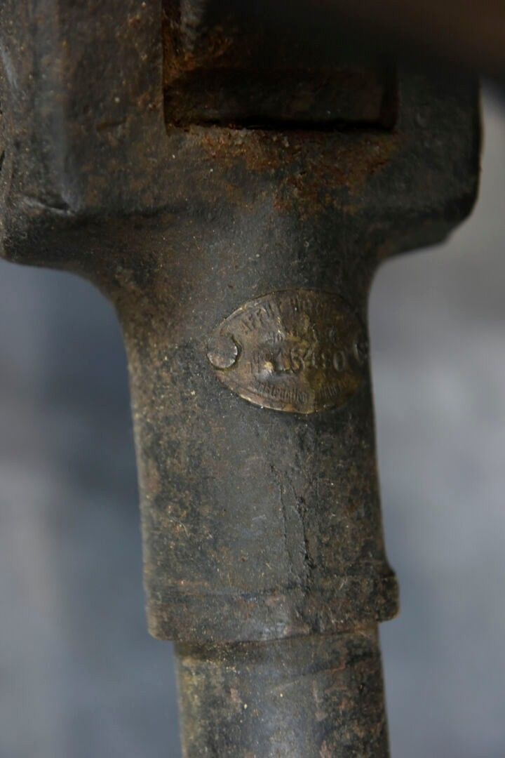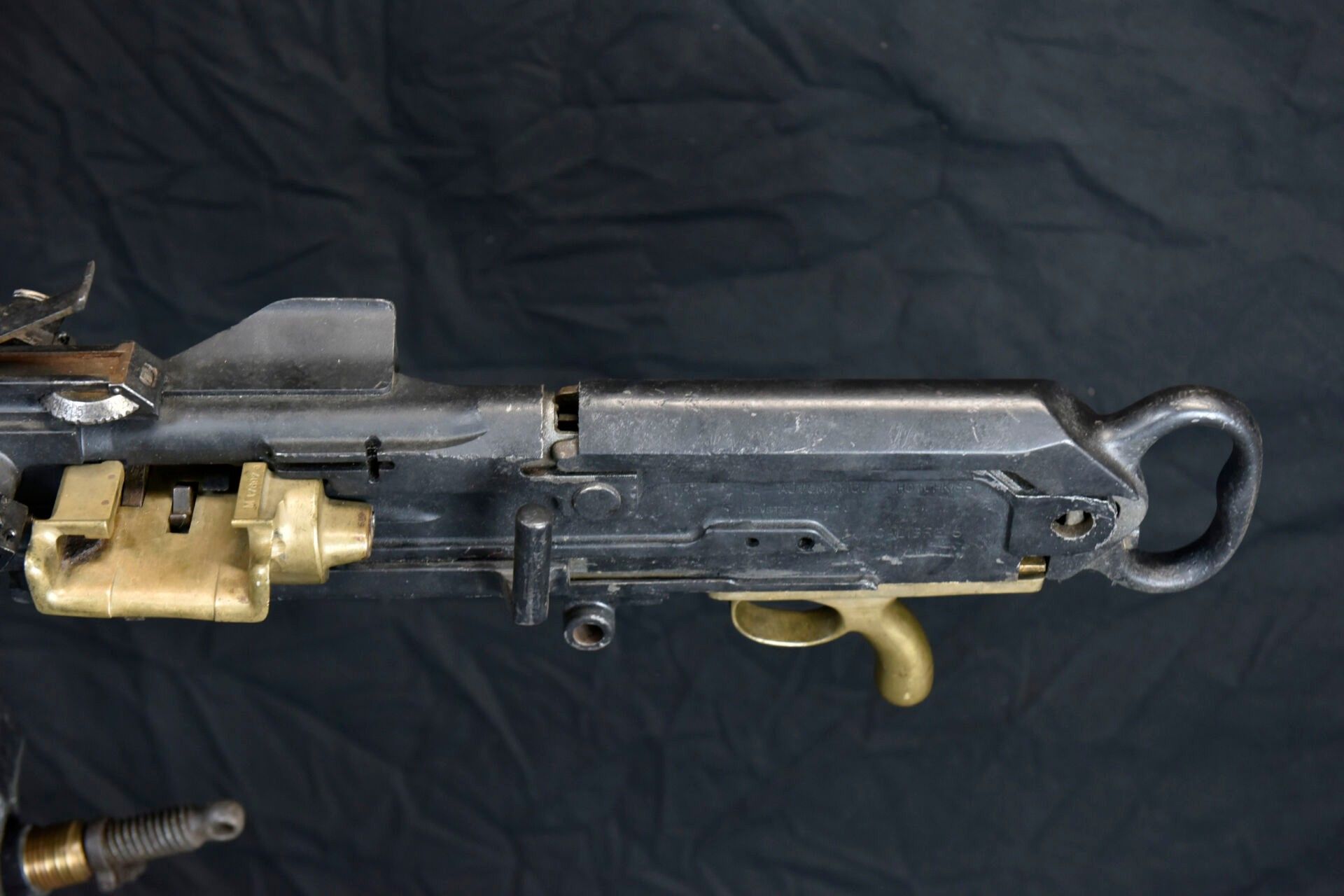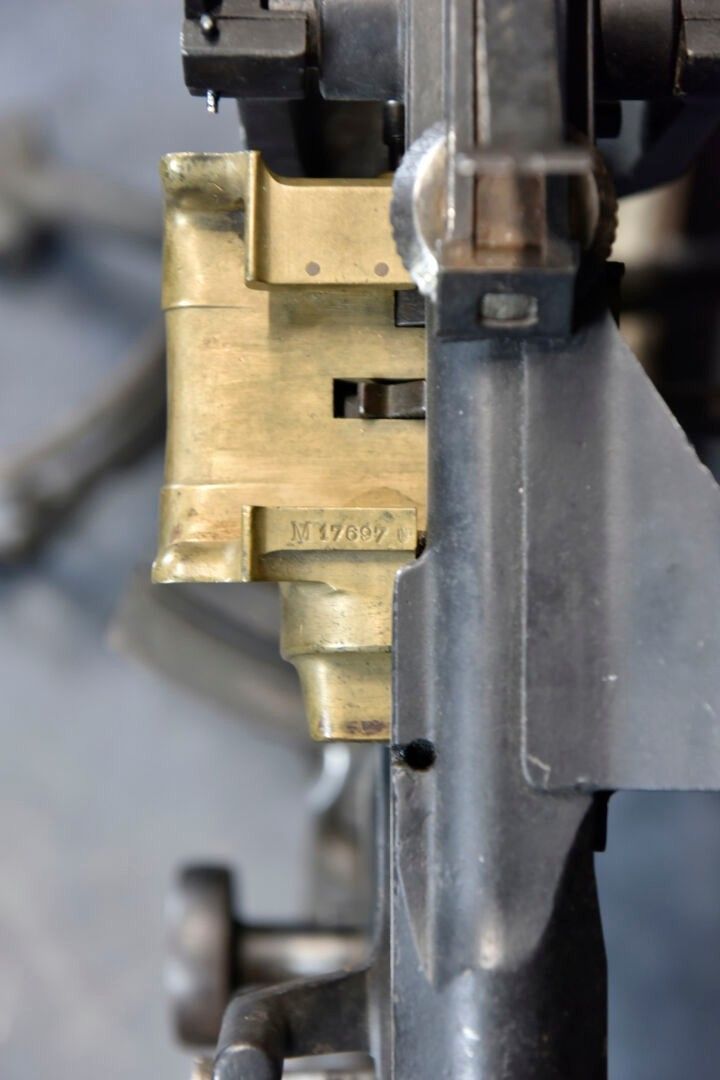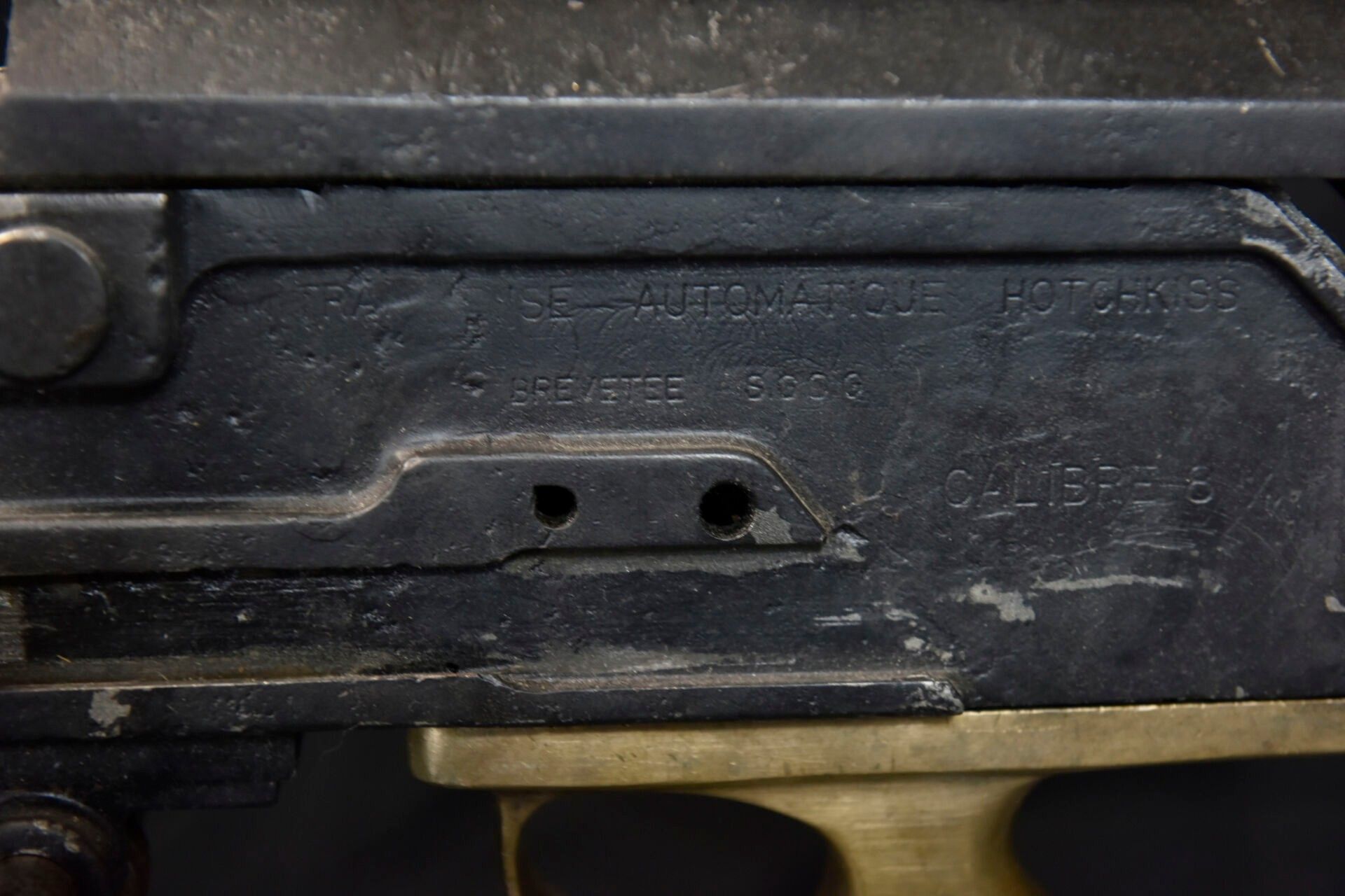 Hotchkiss machine gun. Metal tripod, 70% original colour. Elevatine complete and functional, but heavily oxidised. All moving parts are functional. Many wear marks and some missing parts due to oxidation. Plate marked Affût Hotchkiss, number 23050. Metal machine gun, 80% black paint. Traces of oxidation in places. Flame cover missing. Brass feed chute, marked M17697. Many spare parts are present. The rear part does not fit properly, as there are two soldering points, which simply need to be ground off to fix the spare parts. Trigger missing. Markings Automatic machine gun Hotchkiss Breveté SGDG Calibre 8mm, number 23050. Attached is a wood and metal ammunition box, the leather carrying handle is complete. The metal parts of the case are heavily oxidised. Some wear and patina. Condition II+. 2+ C9 category weapon. Firearms neutralised EU 2017. At the time of purchase, the purchaser must present a valid identity document (CNI or passport) and according to the case, either an original medical certificate of less than 1 month + account SIA-holder, or a copy of both sides of the hunting licence accompanied by validation for the current year or year n-1 and the SIA-holder's account, or the sports shooting licence for the current year (licence + licence certificate downloaded from EDEN-ITAC + the sports shooter's SIA-holder's account). If the billing address is different from that shown on the identity document, proof of address less than 1 month old must be produced. The transaction will not take place until FINIADA has been consulted. The formalities and consultation of this file will be invoiced at €50 per weapon purchased (€25 inc. VAT for a professional buyer).