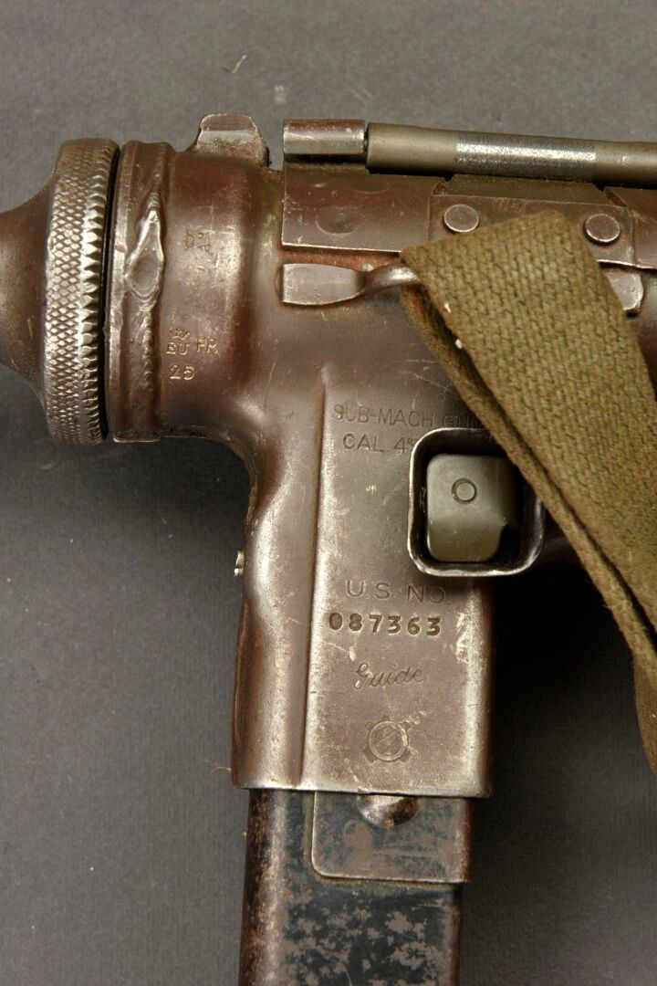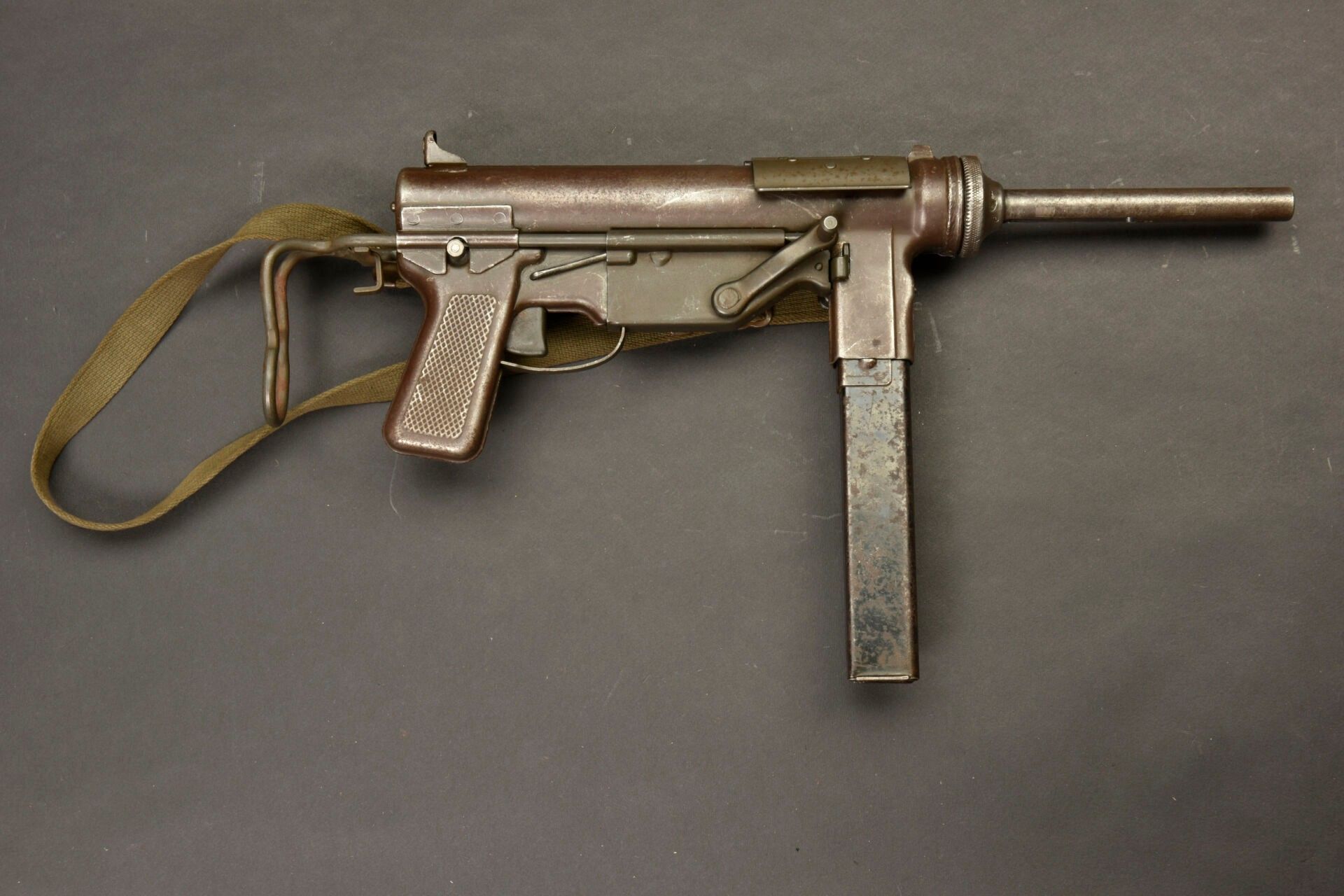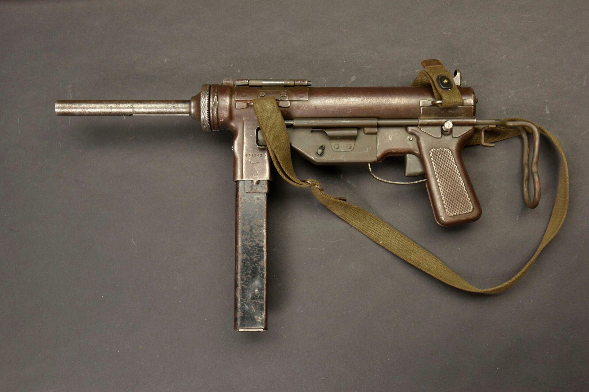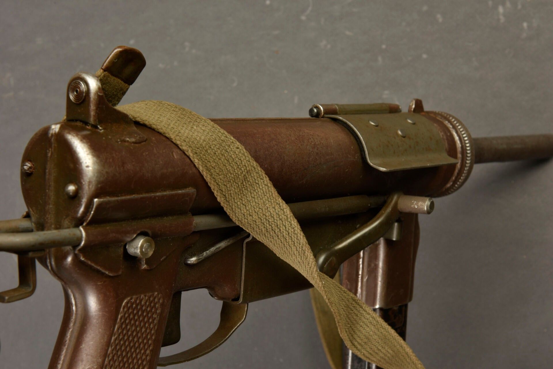 Grease Gun. Manufactured by Guide Lamp Corp. Model M3 Grease Gun. Number 087363. Oil pan missing. Complete canvas shoulder strap. Functional folding stock. Magazine blocked by neutralisation. Breech made mobile by neutralisation +. To note a certain wear and patina of the part. Condition II+. 2+ C9 category weapon. Firearms deactivated EU 2017. At the time of purchase, the purchaser must present a valid identity document (CNI or passport) and, depending on the case, either an original medical certificate less than 1 month old + SIA-holder account, or a copy of both sides of the hunting licence accompanied by validation for the current year or year n-1 and the SIA-holder's account, or the sports shooting licence for the current year (licence + licence certificate downloaded from EDEN-ITAC + the sports shooter's SIA-holder's account). If the billing address is different from that shown on the identity document, proof of address less than 1 month old must be produced. The transaction will not take place until FINIADA has been consulted. The formalities and consultation of this file will be invoiced at €50 per weapon purchased (€25 inc. VAT for a professional buyer).