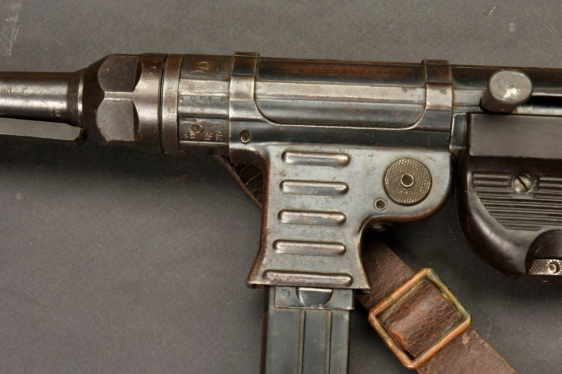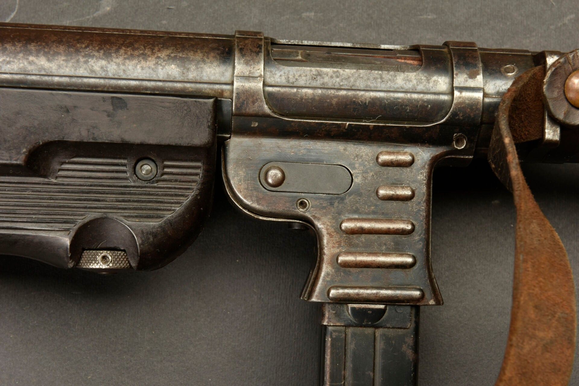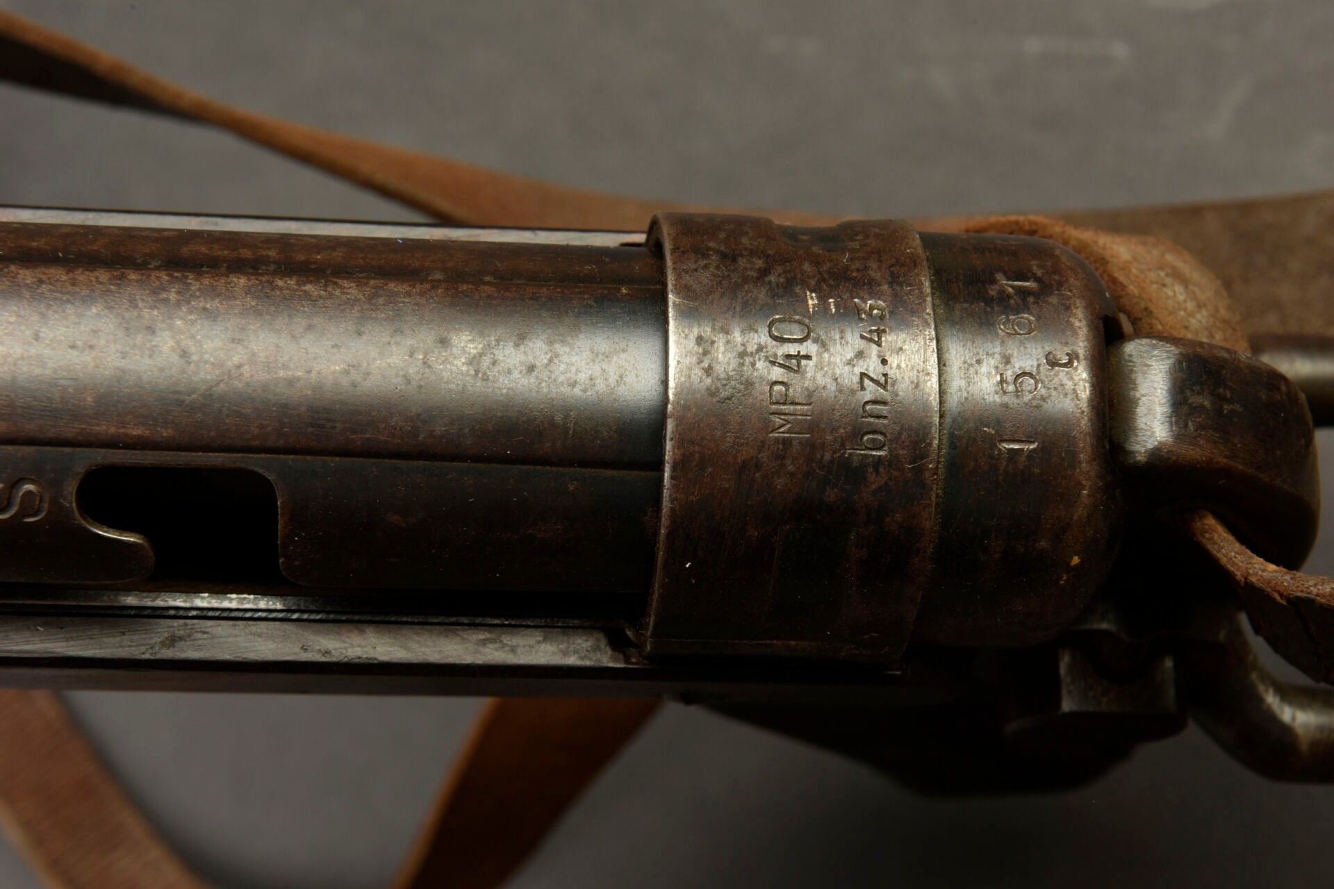 MP 40 machine pistol. 80% tanning. Magazine blocked by neutralisation. Black bakelite frame. Plates also in black bakelite. Functional folding stock. The breech is made mobile by the neutralization +. Nice brown leather sling. Made BNZ 1943. Number 1561C. Weapon visibly with the number. To note a certain wear and patina of the part. Condition II+. 2+ Category C9 weapon. Firearms deactivated EU 2017. At the time of purchase, the purchaser must present a valid identity document (CNI or passport) and according to the case, either an original medical certificate of less than 1 month + account SIA-holder, or a copy of both sides of the hunting licence accompanied by validation for the current year or year n-1 and the SIA-holder's account, or the sports shooting licence for the current year (licence + licence certificate downloaded from EDEN-ITAC + the sports shooter's SIA-holder's account). If the billing address is different from that shown on the identity document, proof of address less than 1 month old must be produced. The transaction will not take place until FINIADA has been consulted. The formalities and consultation of this file will be invoiced at €50 per weapon purchased (€25 inc. VAT for a professional buyer).