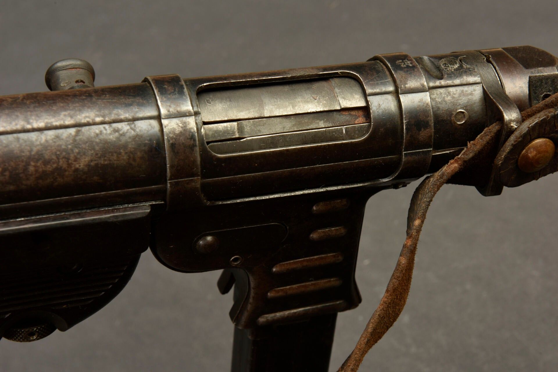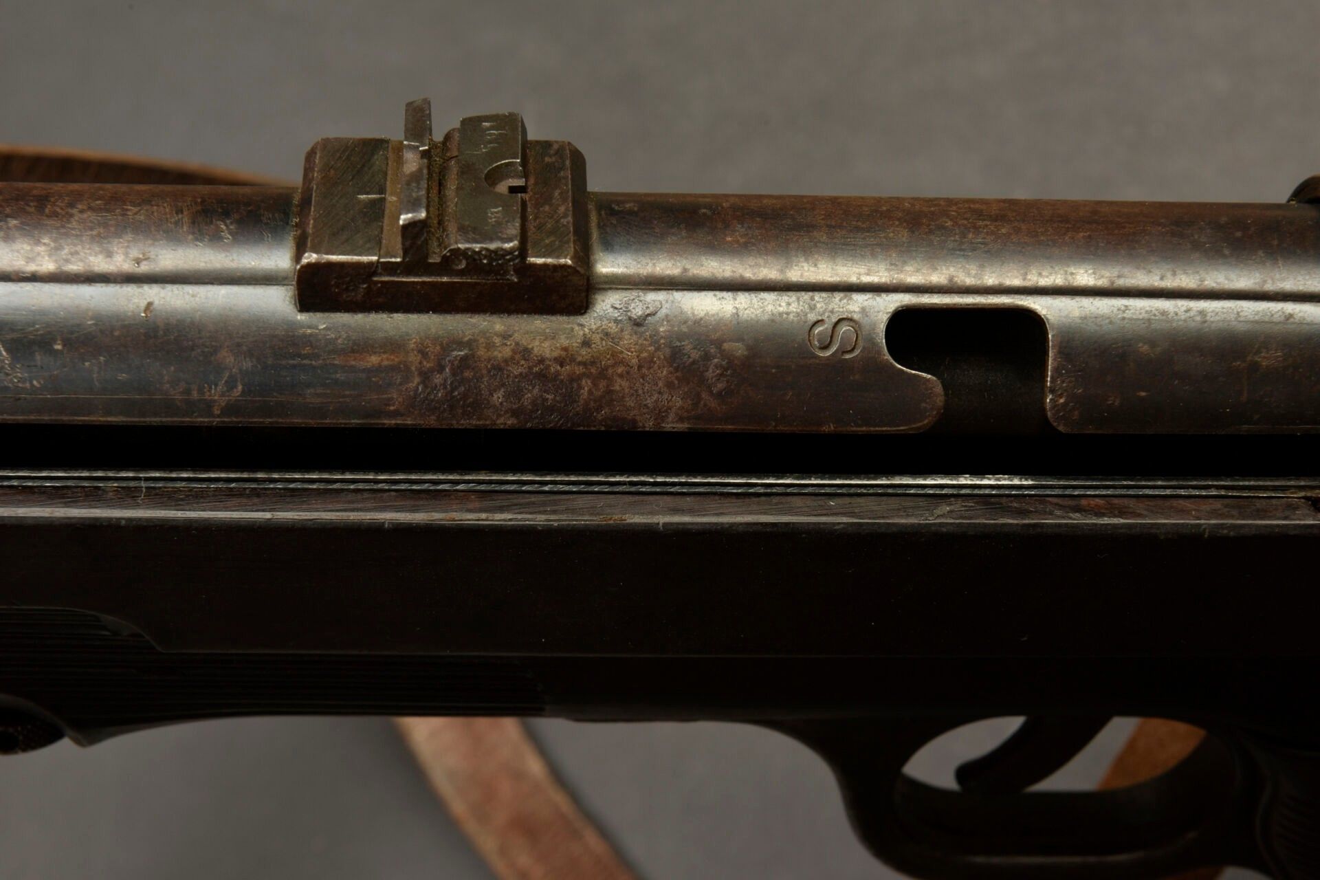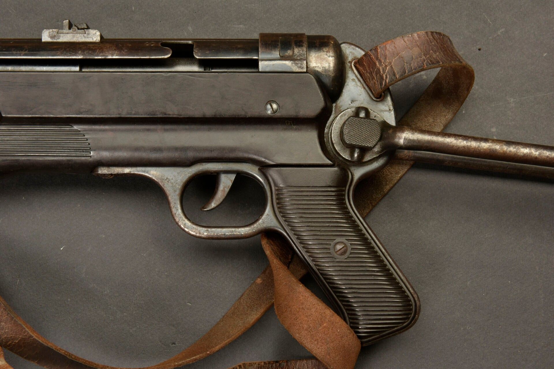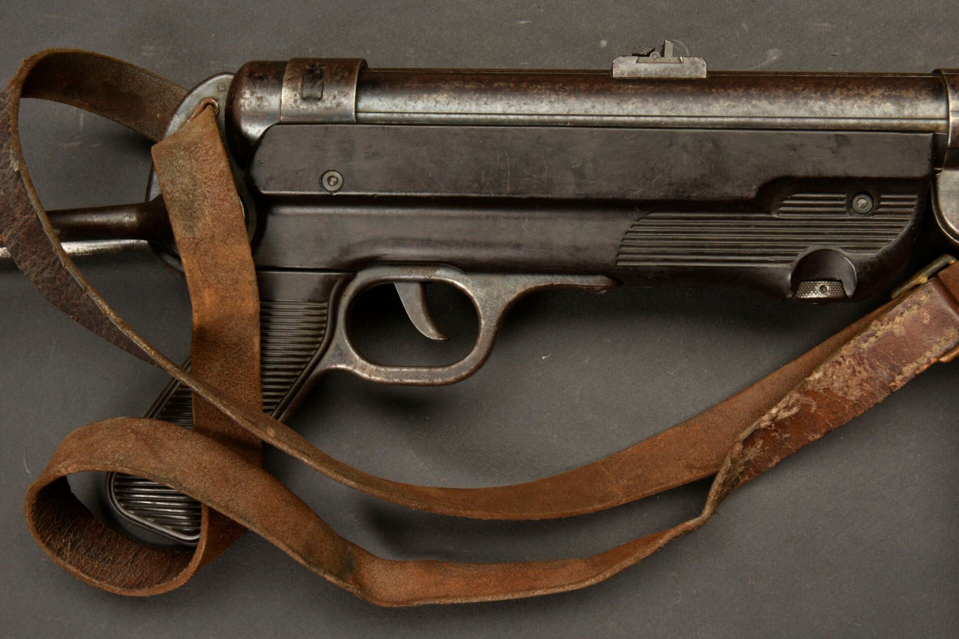 MP 40 machine pistol. 80% tanning. Magazine blocked by neutralisation. Black bakelite frame. Plates also in black bakelite. Functional folding stock. The breech is made mobile by the neutralization +. Nice brown leather sling. Made BNZ 1943. Number 1561C. Weapon visibly with the number. To note a certain wear and patina of the part. Condition II+. 2+ Category C9 weapon. Firearms deactivated EU 2017. At the time of purchase, the purchaser must present a valid identity document (CNI or passport) and according to the case, either an original medical certificate of less than 1 month + account SIA-holder, or a copy of both sides of the hunting licence accompanied by validation for the current year or year n-1 and the SIA-holder's account, or the sports shooting licence for the current year (licence + licence certificate downloaded from EDEN-ITAC + the sports shooter's SIA-holder's account). If the billing address is different from that shown on the identity document, proof of address less than 1 month old must be produced. The transaction will not take place until FINIADA has been consulted. The formalities and consultation of this file will be invoiced at €50 per weapon purchased (€25 inc. VAT for a professional buyer).