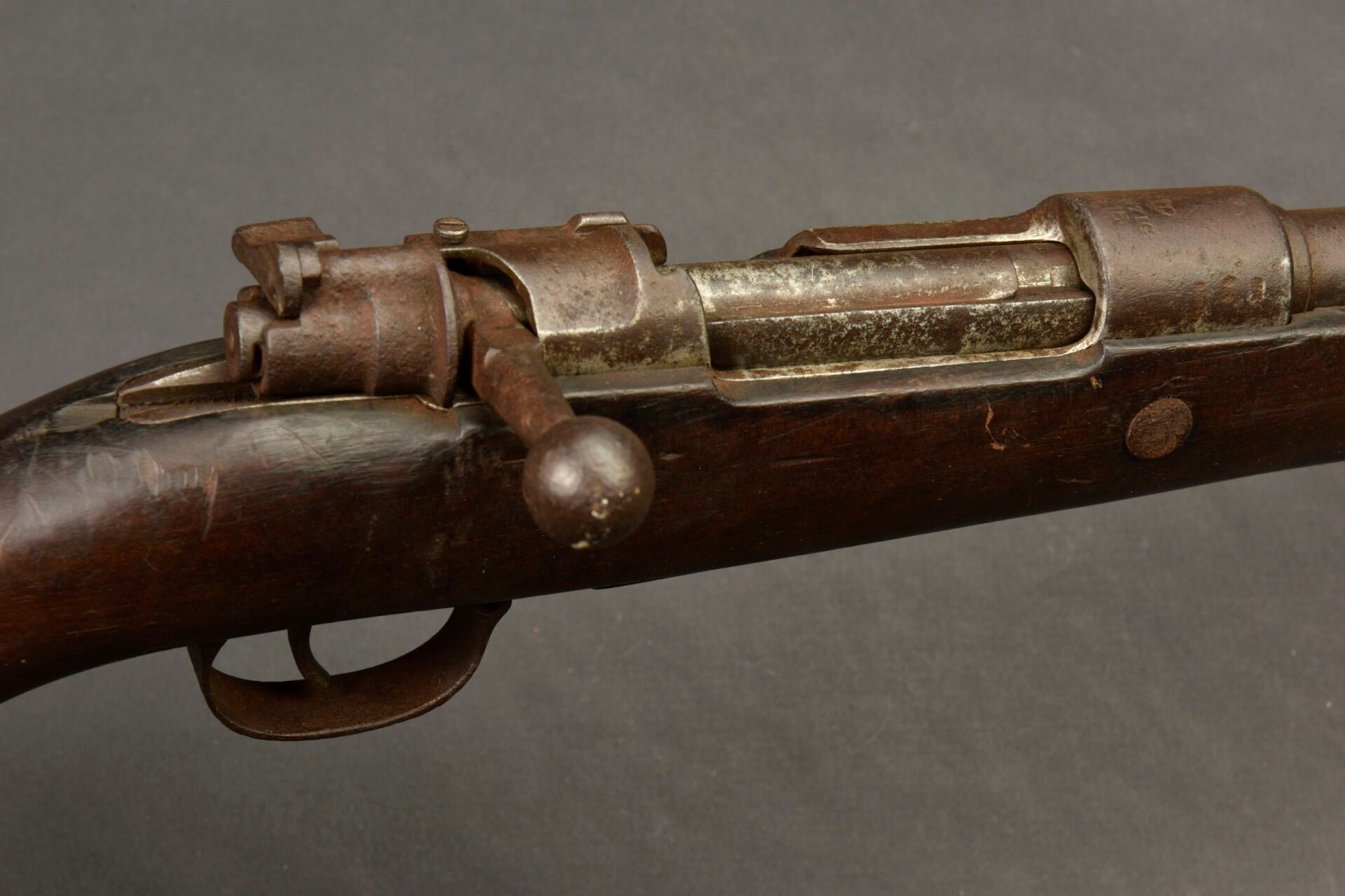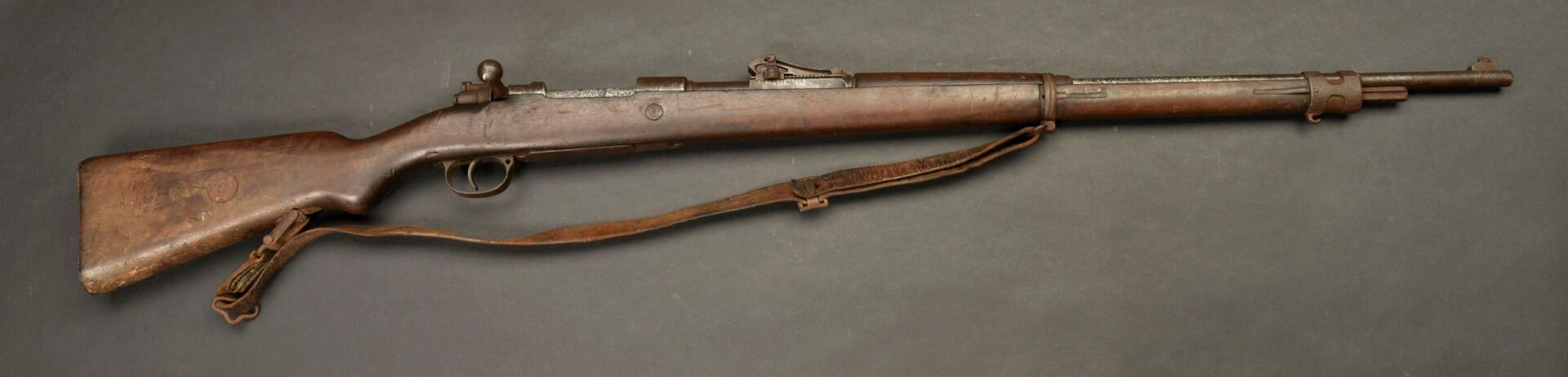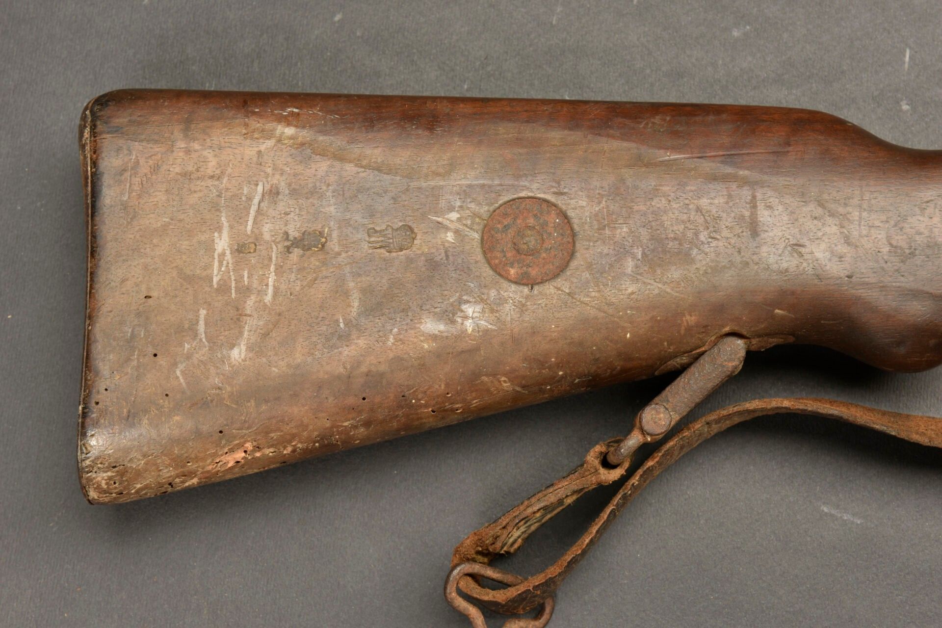 Gewehr 98 manual repeating rifle with heavily oxidised metal fittings. Nice complete frame. Markings Gew 98, number 1399W. Made Danzig 1915. The gun is not the same number. Nice wooden stock with visible markings. Complete leather shoulder strap. The breech is mobile thanks to a neutralization +. Some wear and patina. Condition II+. 2+ C9 category weapon. Firearms neutralised EU 2017. At the time of purchase, the purchaser must present a valid identity document (CNI or passport) and according to the case, either an original medical certificate of less than 1 month + account SIA-holder, or a copy of both sides of the hunting licence accompanied by validation for the current year or year n-1 and the SIA-holder's account, or the sports shooting licence for the current year (licence + licence certificate downloaded from EDEN-ITAC + the sports shooter's SIA-holder's account). If the billing address is different from that shown on the identity document, proof of address less than 1 month old must be produced. The transaction will not take place until FINIADA has been consulted. The formalities and consultation of this file will be invoiced at €50 per weapon purchased (€25 inc. VAT for a professional buyer).