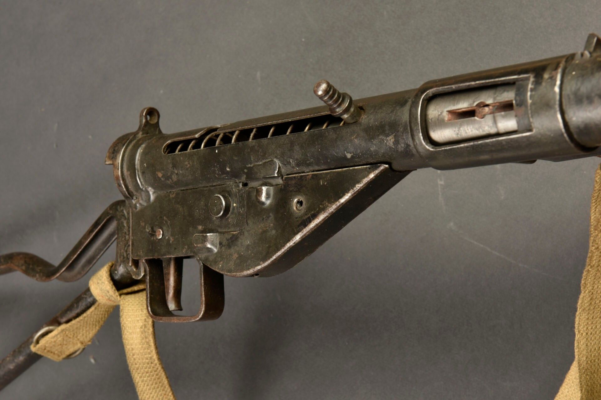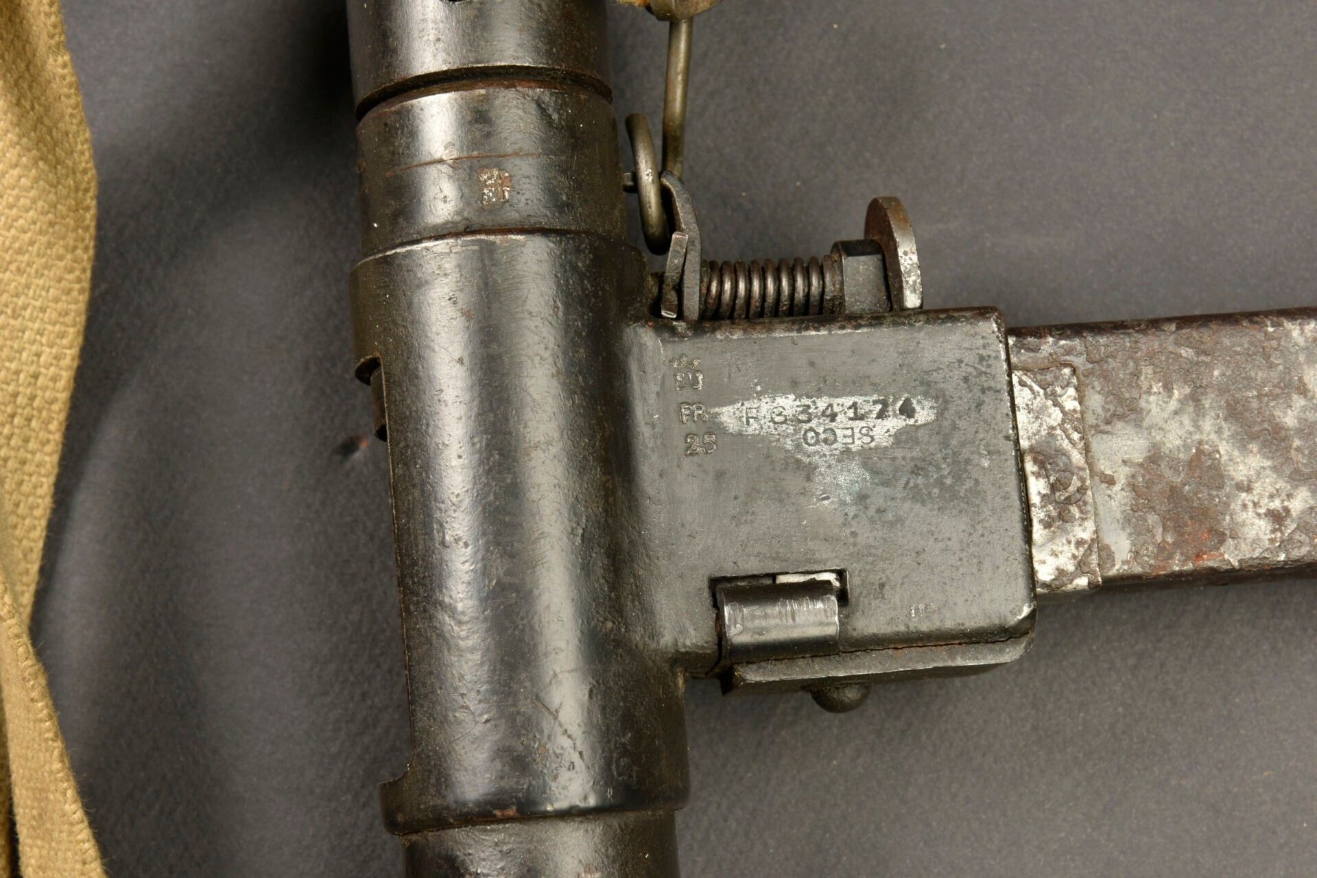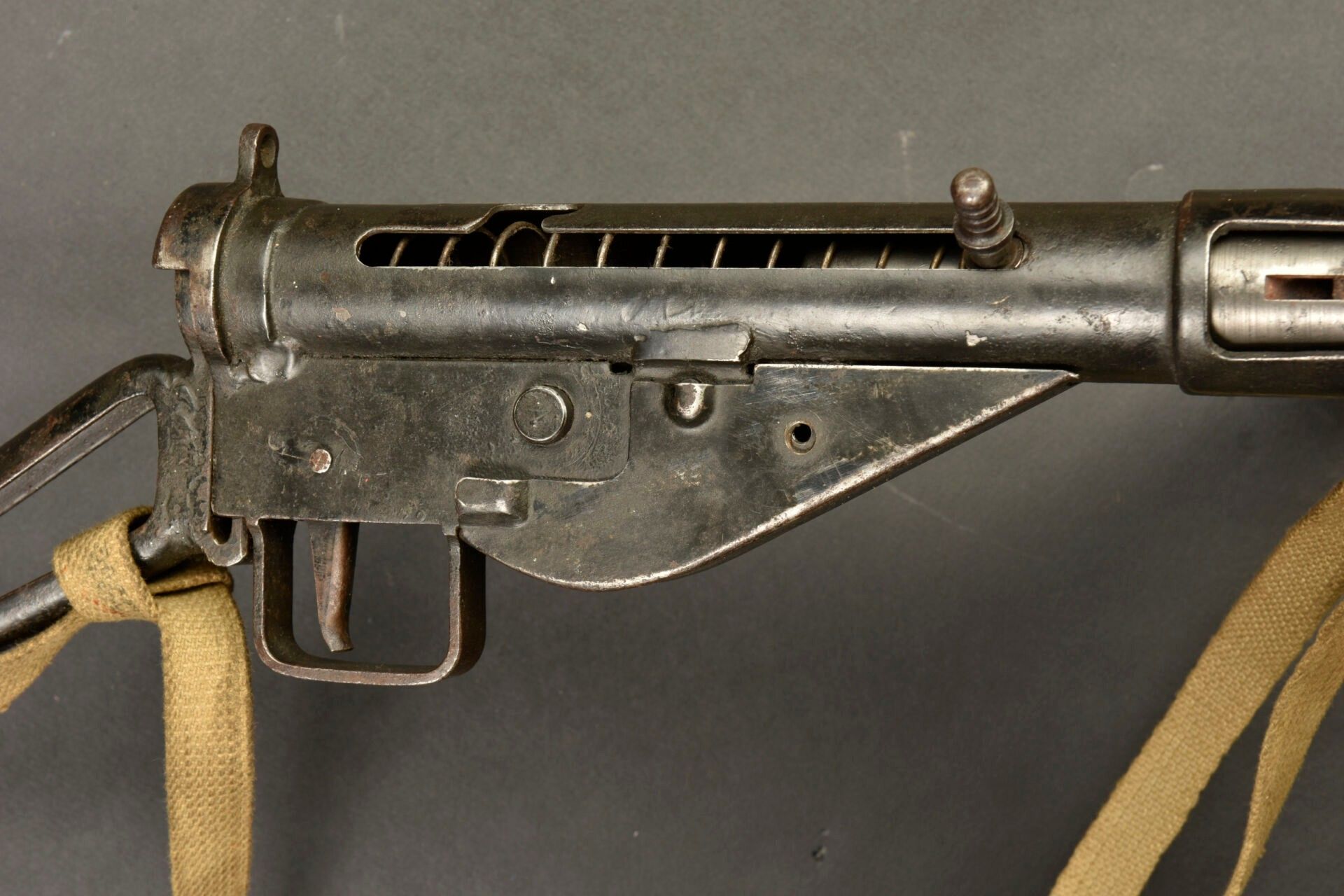 Sten MK II machine pistol. All metal, 70% original black colour. Complete skeleton stock. Magazine blocked by deactivation. Breech made mobile by neutralisation +. Complete canvas sling. Made by SECO, number FG34174. To note a certain wear and patina of the part. Condition II+. C9 category weapon. Firearms neutralised EU 2017. At the time of purchase, the purchaser must present a valid identity document (CNI or passport) and according to the case, either an original medical certificate of less than 1 month + account SIA-holder, or a copy of both sides of the hunting licence accompanied by validation for the current year or year n-1 and the SIA-holder's account, or the sports shooting licence for the current year (licence + licence certificate downloaded from EDEN-ITAC + the sports shooter's SIA-holder's account). If the billing address is different from that shown on the identity document, proof of address less than 1 month old must be produced. The transaction will not take place until FINIADA has been consulted. The formalities and consultation of this file will be invoiced at €50 per weapon purchased (€25 inc. VAT for a professional buyer).