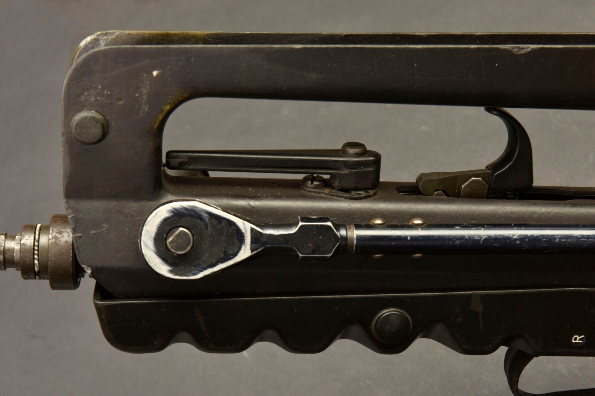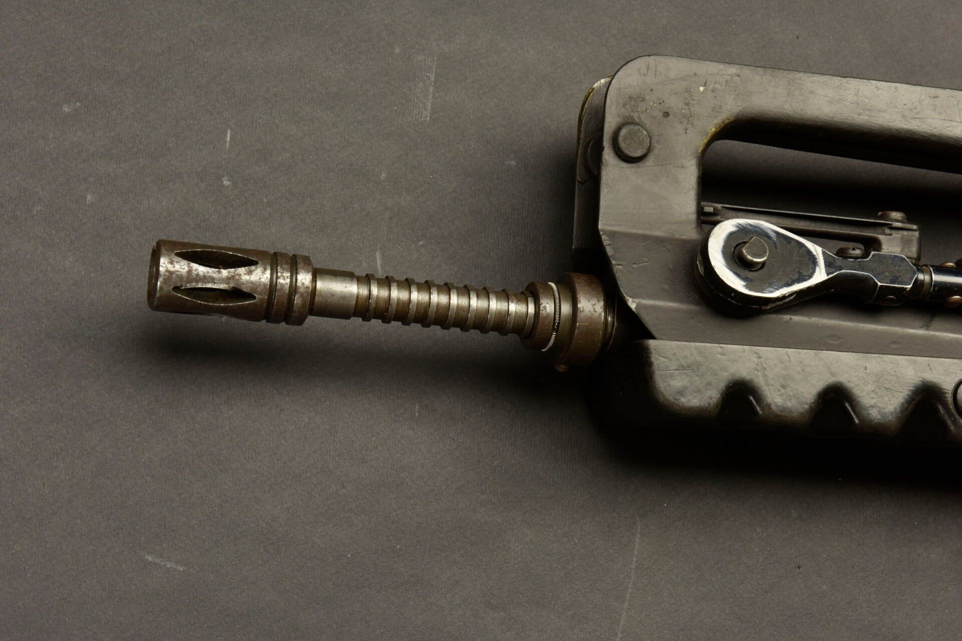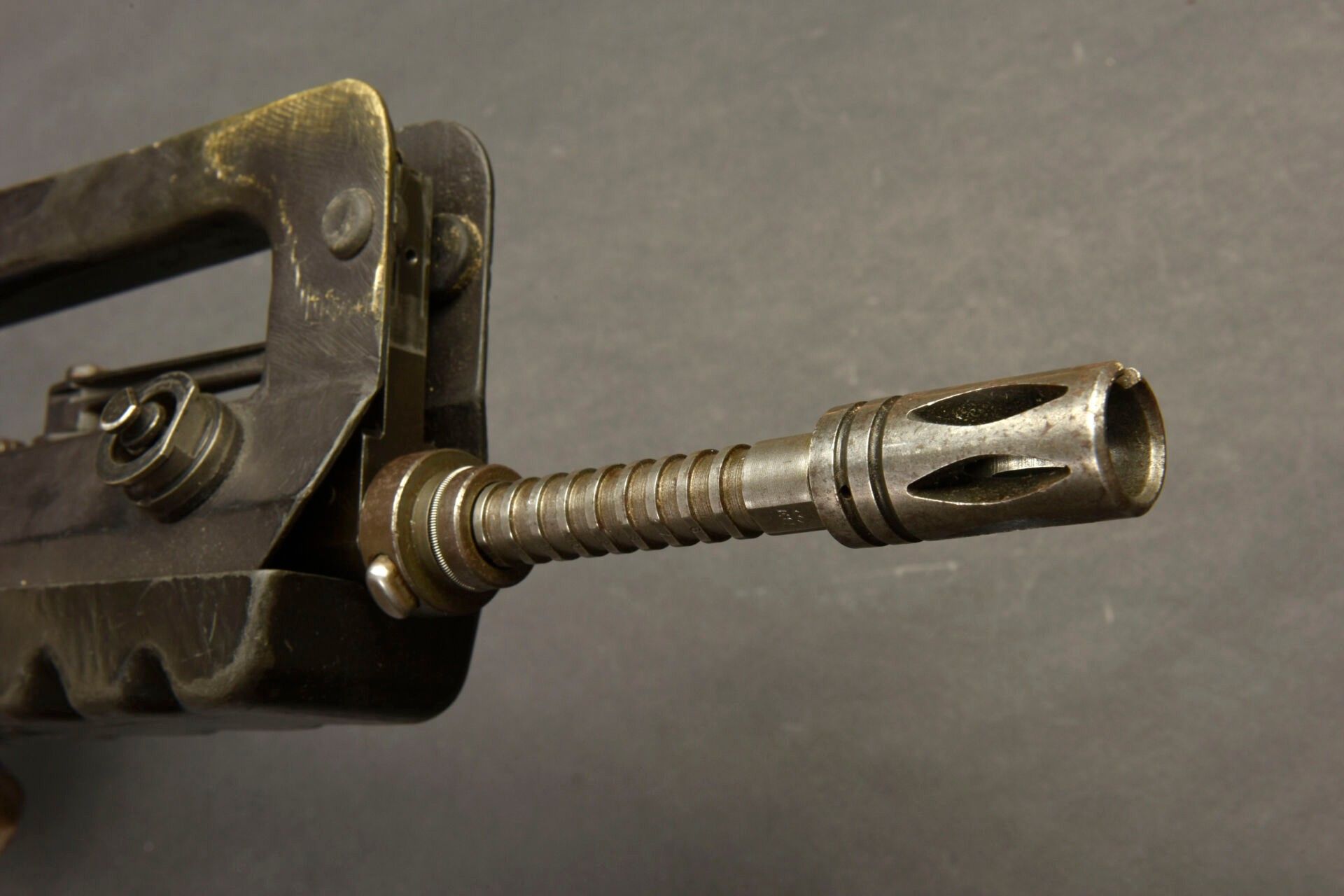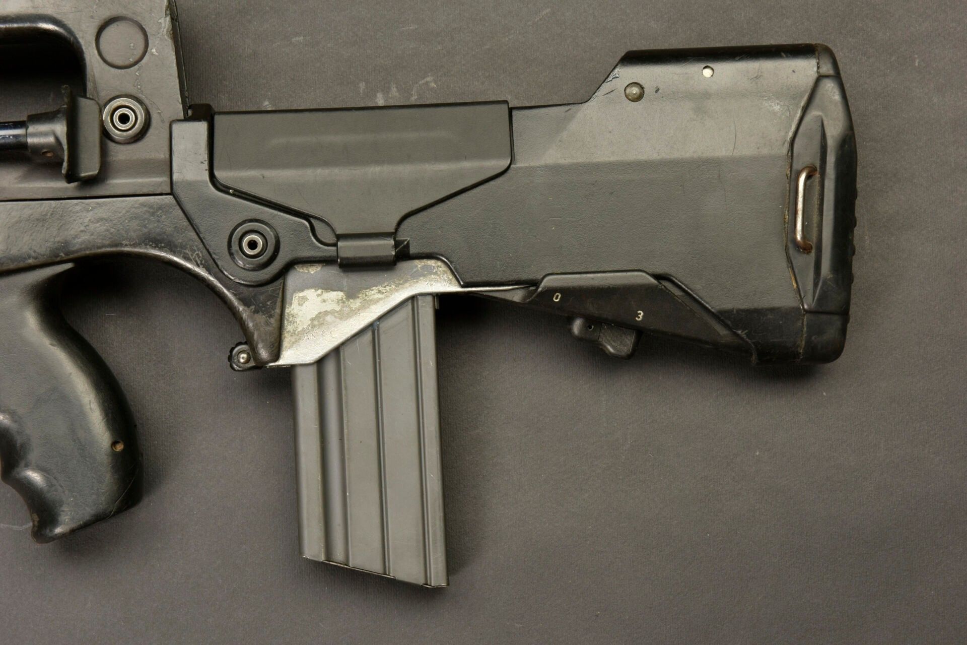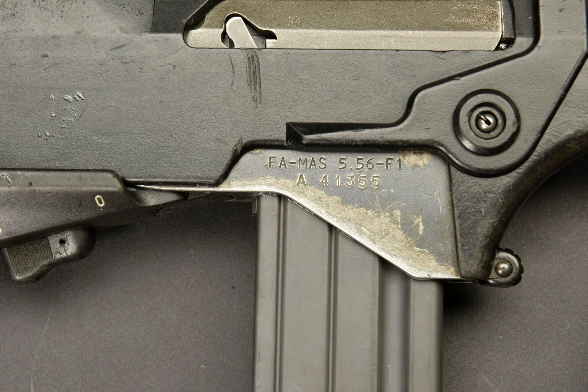 FAMAS F1 assault rifle. Metal and plastic. Some traces of oxidation. Magazine blocked by neutralisation. Breech made mobile by neutralisation +. Manufactured by Manufacture d'armes de Saint-Etienne. Number A41355. Part of the bipod is missing. Some wear and patina. Condition II+. Ordered and put into service by the French Army in the 1970's. Category C9 weapon. Firearms neutralised EU 2017. At the time of purchase, the purchaser must present a valid identity document (CNI or passport) and, depending on the case, either an original medical certificate less than 1 month old + SIA-holder account, or a copy of both sides of the hunting licence accompanied by validation for the current year or year n-1 and the SIA-holder's account, or the sports shooting licence for the current year (licence + licence certificate downloaded from EDEN-ITAC + the sports shooter's SIA-holder's account). If the billing address is different from that shown on the identity document, proof of address less than 1 month old must be produced. The transaction will not take place until FINIADA has been consulted. The formalities and consultation of this file will be invoiced at €50 per weapon purchased (€25 inc. VAT for a professional buyer).
