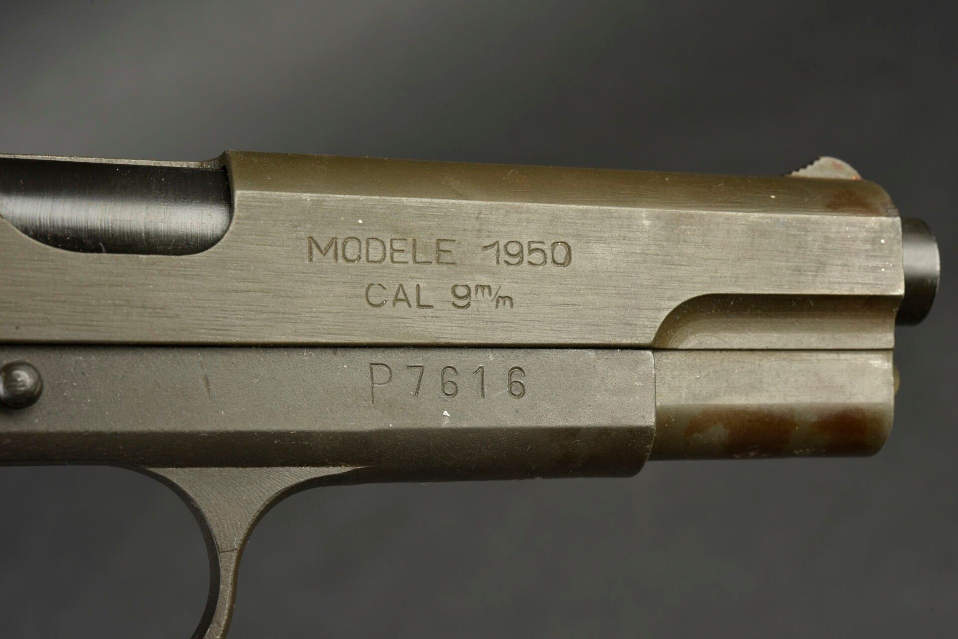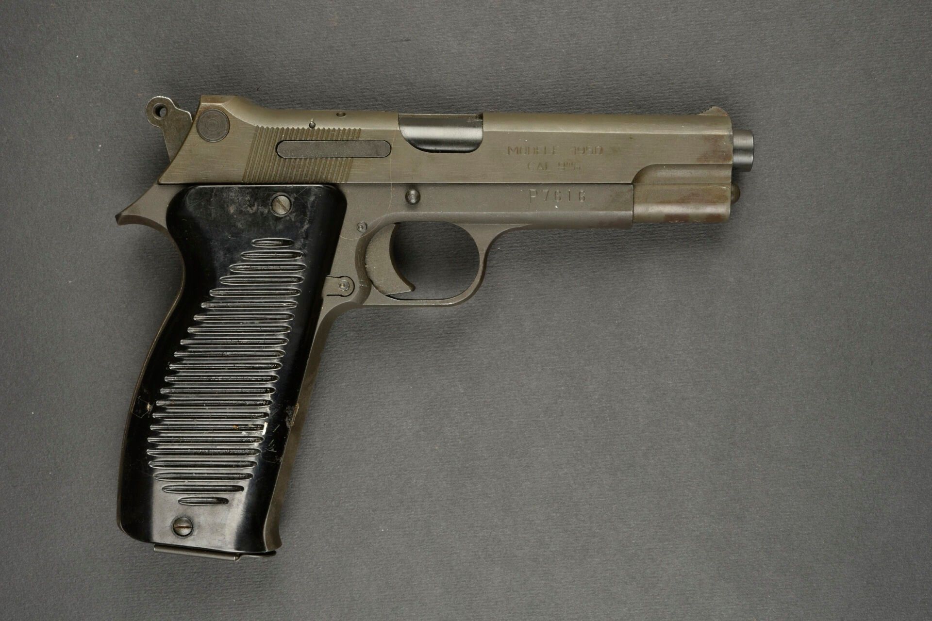 MAC 50 pistol. Manufactured by Manufacture d'Armes de Châtellerault. Number P7616. Black bakelite plate. Magazine and breech blocked by neutralisation. 90% original tanning. . Some wear and patina. Condition II+. C9 category weapon. Firearms neutralised EU 2017. At the time of purchase, the purchaser must present a valid identity document (CNI or passport) and, depending on the case, either an original medical certificate less than 1 month old + SIA-holder account, or a copy of both sides of the hunting licence accompanied by validation for the current year or year n-1 and the SIA-holder's account, or the sports shooting licence for the current year (licence + licence certificate downloaded from EDEN-ITAC + the sports shooter's SIA-holder's account). If the billing address is different from that shown on the identity document, proof of address less than 1 month old must be produced. The transaction will not take place until FINIADA has been consulted. The formalities and consultation of this file will be invoiced at €50 per weapon purchased (€25 inc. VAT for a professional buyer).