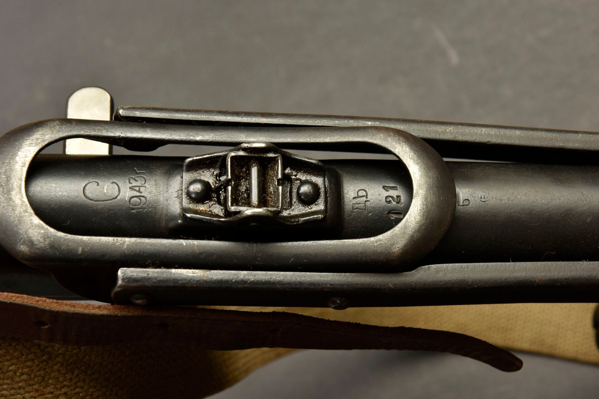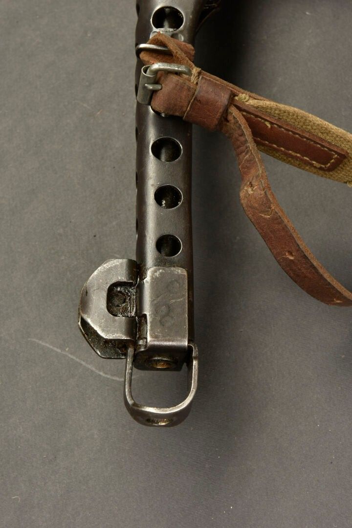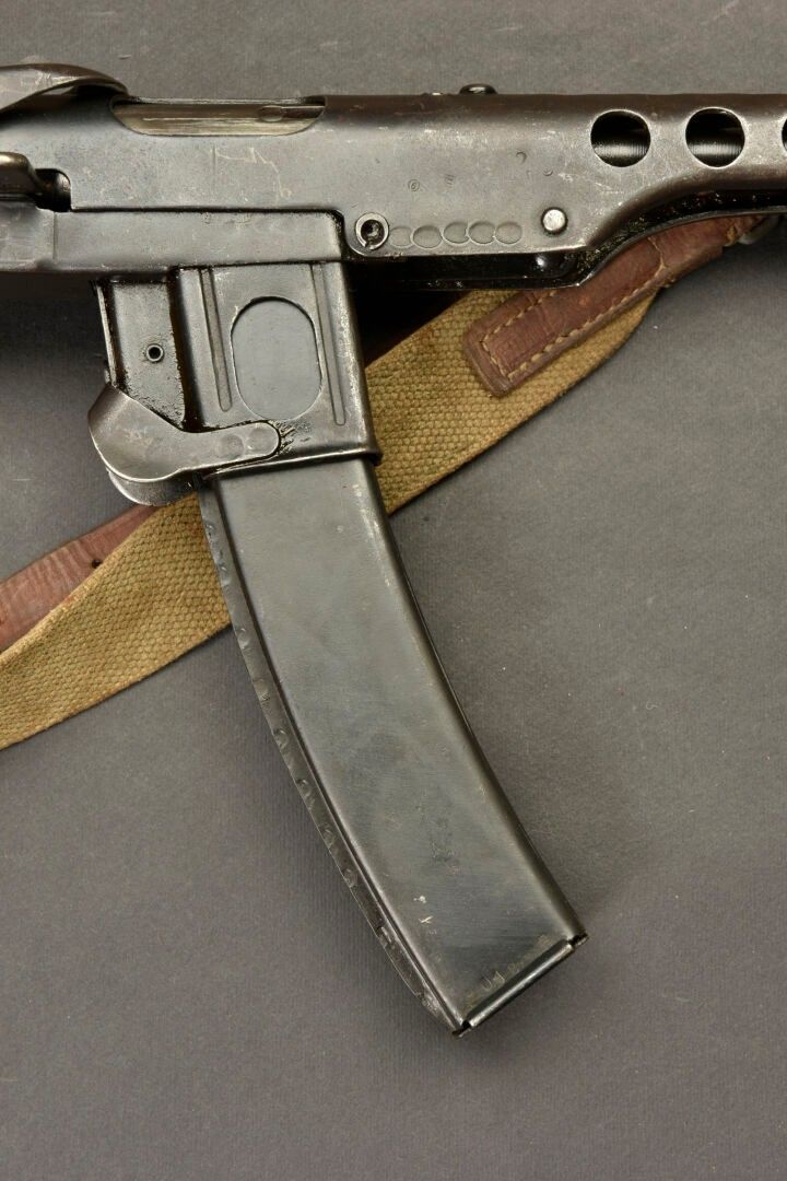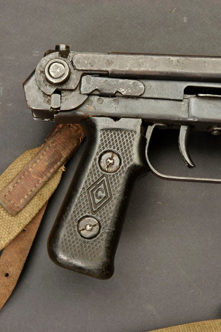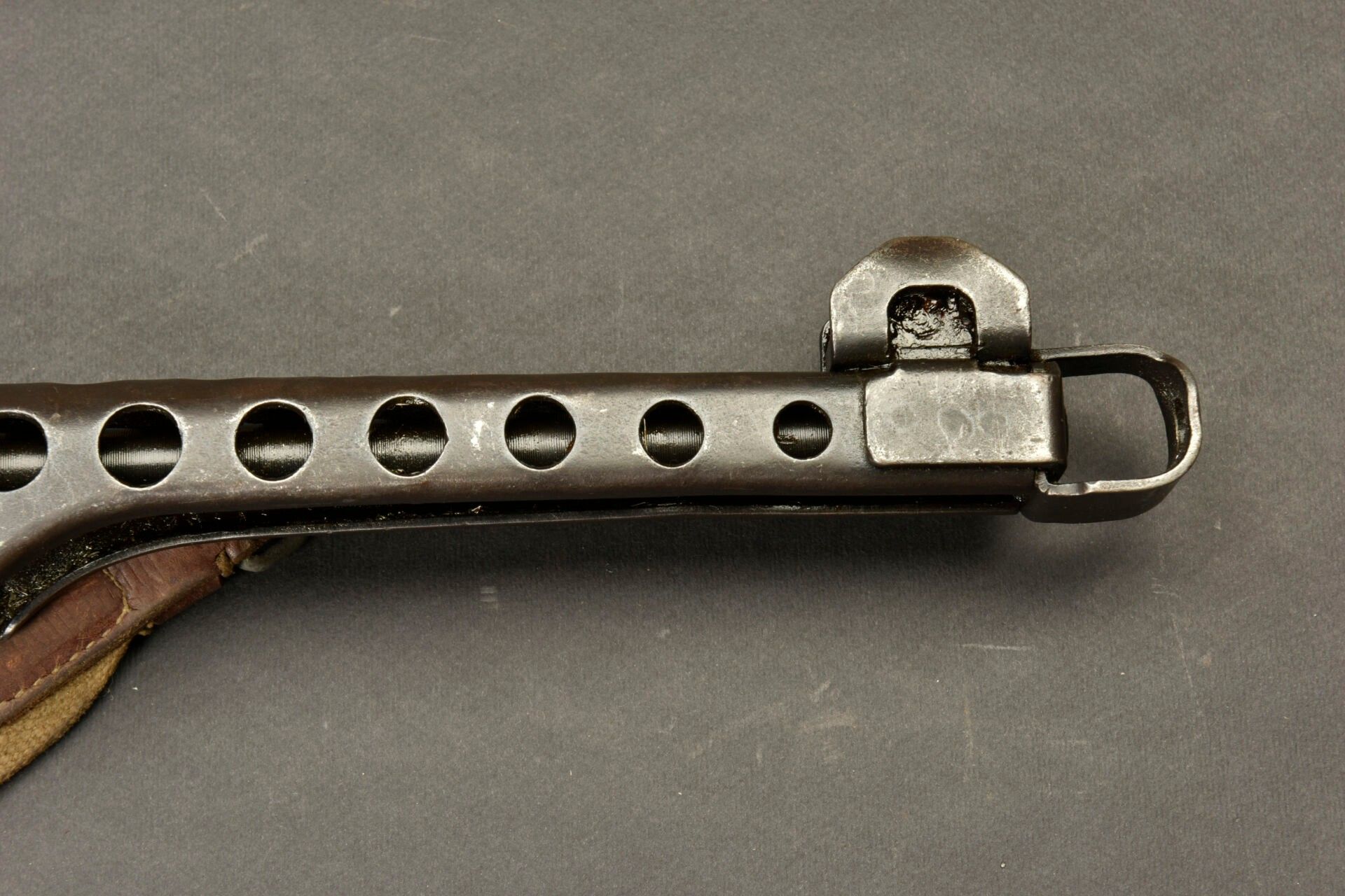 PPS 43 machine pistol. All metal, some minor traces of oxidation visible. Black bakelite grips. Complete folding stock. Canvas shoulder strap present. Breech movable due to neutralisation +. Number B121, dated 1943. Magazine blocked by neutralization. Some wear and patina. Condition II+. The Soudaïev (or Sudaev) Soviet PPS machine pistol is a machine pistol designed as a model (PPS 42) by Alekseï Soudaïev during the siege of Leningrad in 1942. It was originally intended for tankers and scouts. By removing the wooden inserts from the PPS-42 and simplifying manufacture, Soudaïev created the PPS-43, which was produced in the Soviet Union until 1945. It was a rustic model made from pressed sheet metal with welded or riveted parts. 2+. Category C9 weapon. Firearms deactivated EU 2017. At the time of purchase, the purchaser must present a valid identity document (CNI or passport) and, depending on the case, either an original medical certificate less than 1 month old + SIA-holder account, or a copy of both sides of the hunting licence accompanied by validation for the current year or year n-1 and the SIA-holder's account, or the sports shooting licence for the current year (licence + licence certificate downloaded from EDEN-ITAC + the sports shooter's SIA-holder's account). If the billing address is different from that shown on the identity document, proof of address less than 1 month old must be produced. The transaction will not take place until FINIADA has been consulted. The formalities and consultation of this file will be invoiced at €50 per weapon purchased (€25 inc. VAT for a professional buyer).