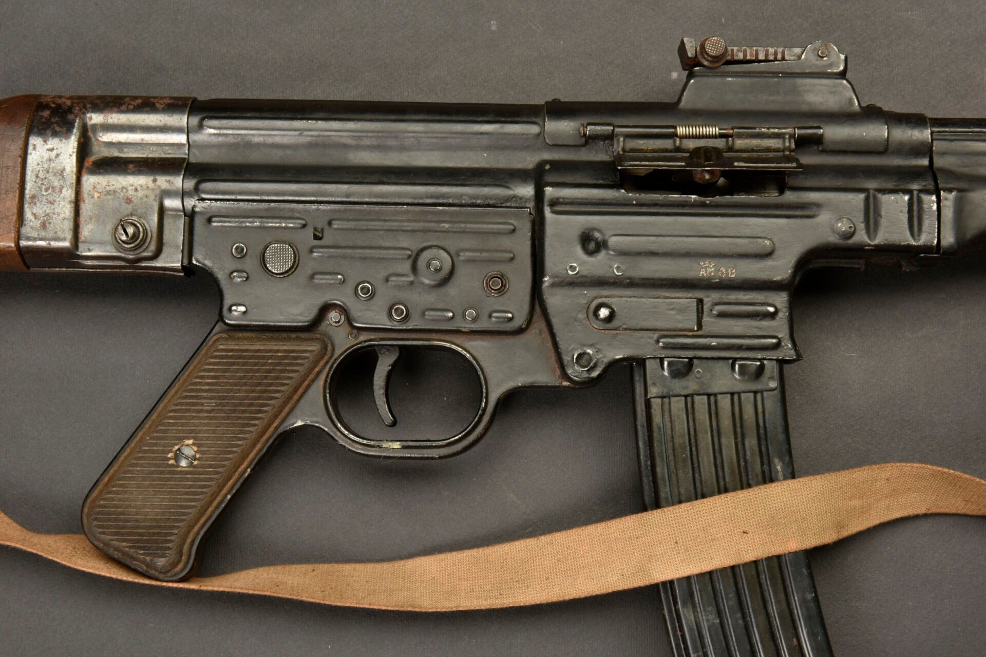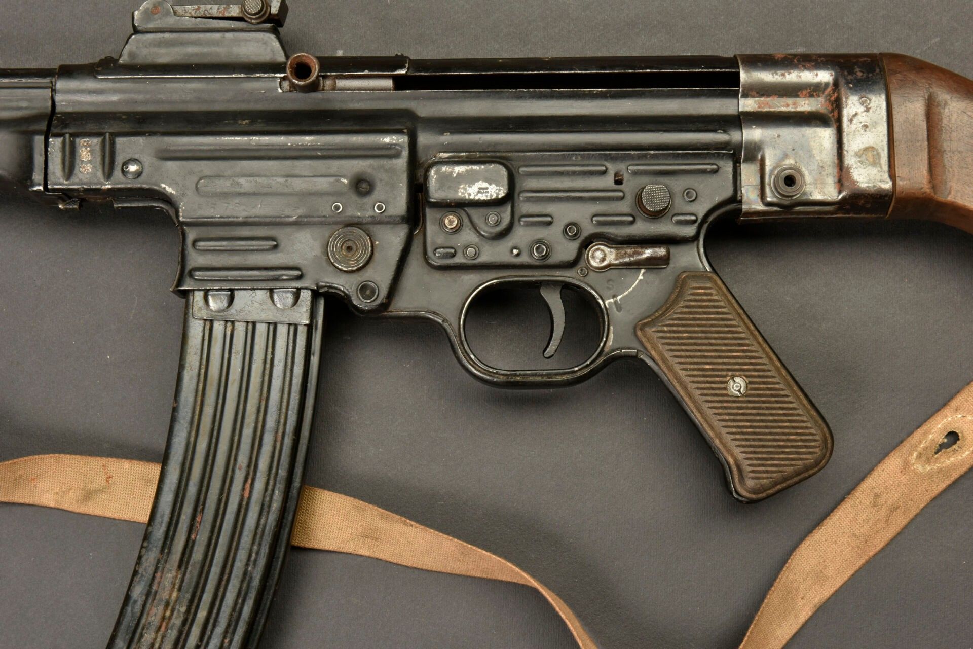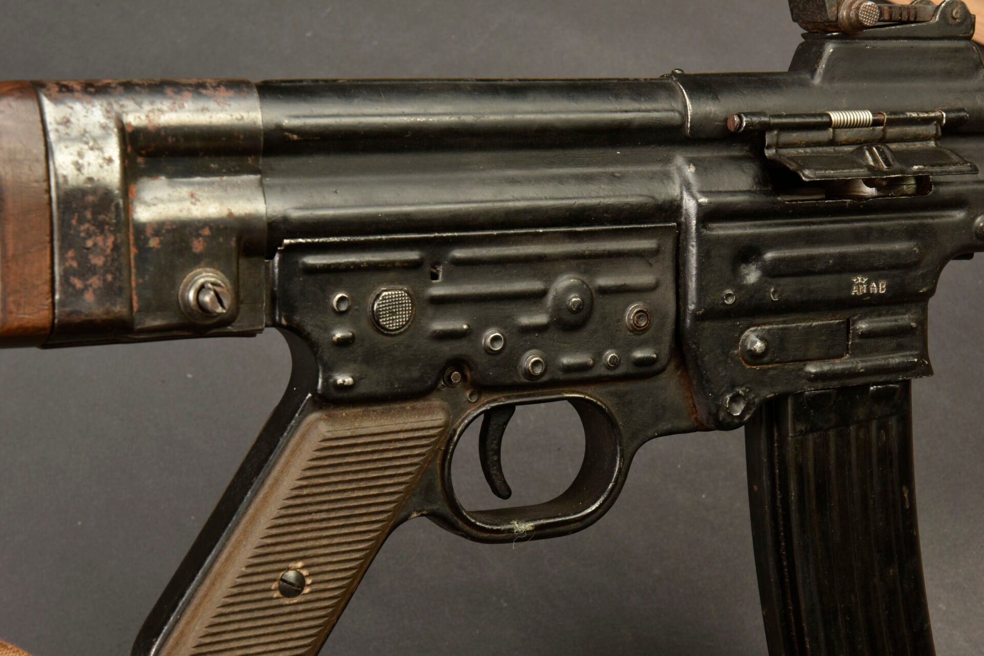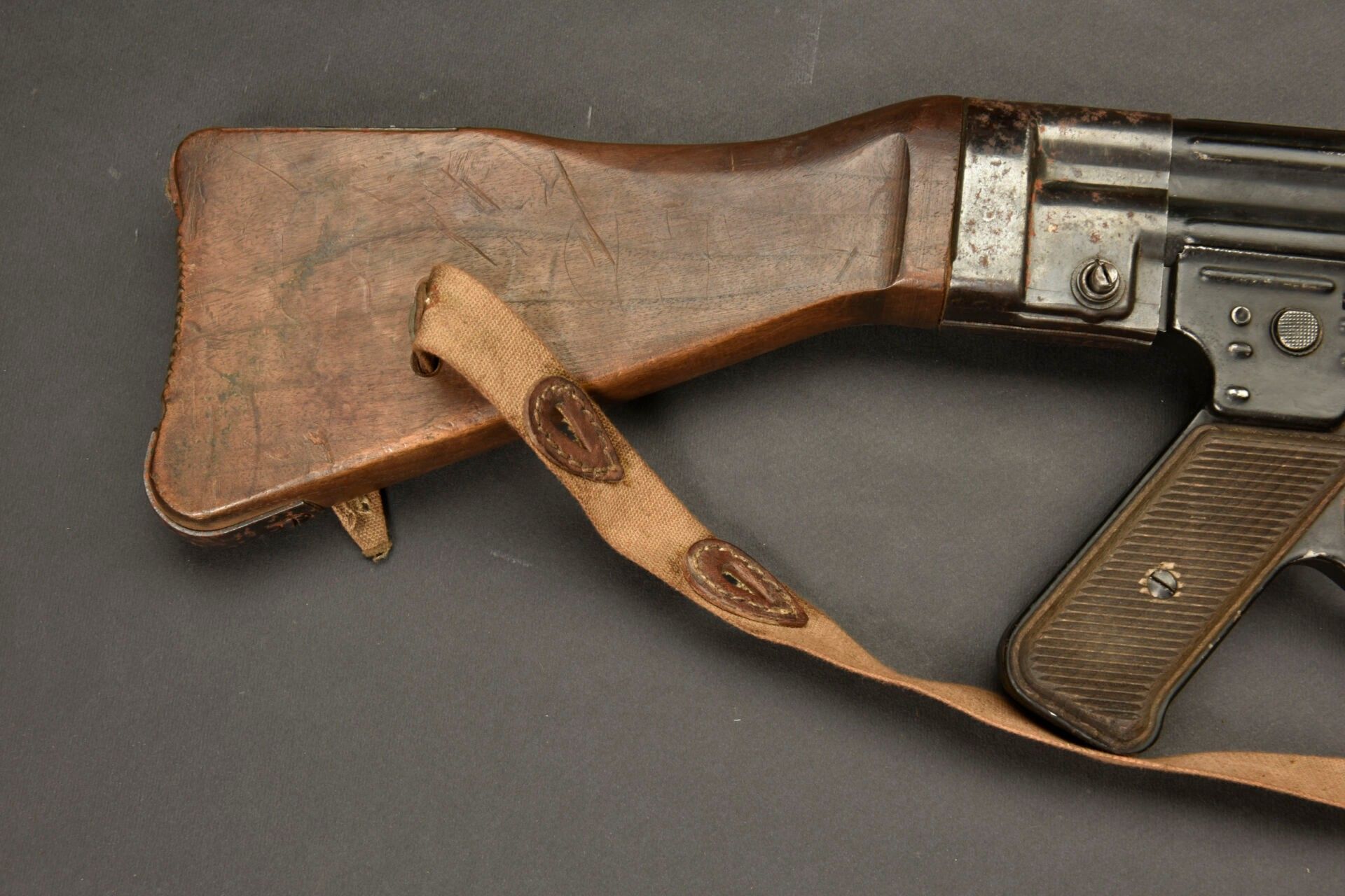 Sturmgewehr 44. The metal fittings are heavily worn and repainted black. Wooden grips, held in place by a rivet. Nice wooden stock. Breech made mobile by neutralisation +. MP43 magazine, blocked by neutralisation. Later canvas sling. Number 5576. Some wear and patina. Condition II+. C9 category weapon. Firearms deactivated EU 2017. At the time of purchase, the purchaser must present a valid identity document (CNI or passport) and, depending on the case, either an original medical certificate less than 1 month old + SIA-holder account, or a copy of both sides of the hunting licence accompanied by validation for the current year or year n-1 and the SIA-holder's account, or the sports shooting licence for the current year (licence + licence certificate downloaded from EDEN-ITAC + the sports shooter's SIA-holder's account). If the billing address is different from that shown on the identity document, proof of address less than 1 month old must be produced. The transaction will not take place until FINIADA has been consulted. The formalities and consultation of this file will be invoiced at €50 per weapon purchased (€25 inc. VAT for a professional buyer).