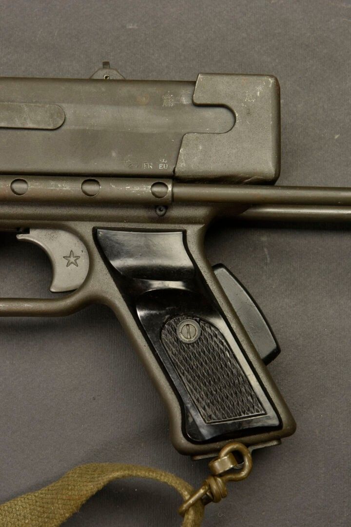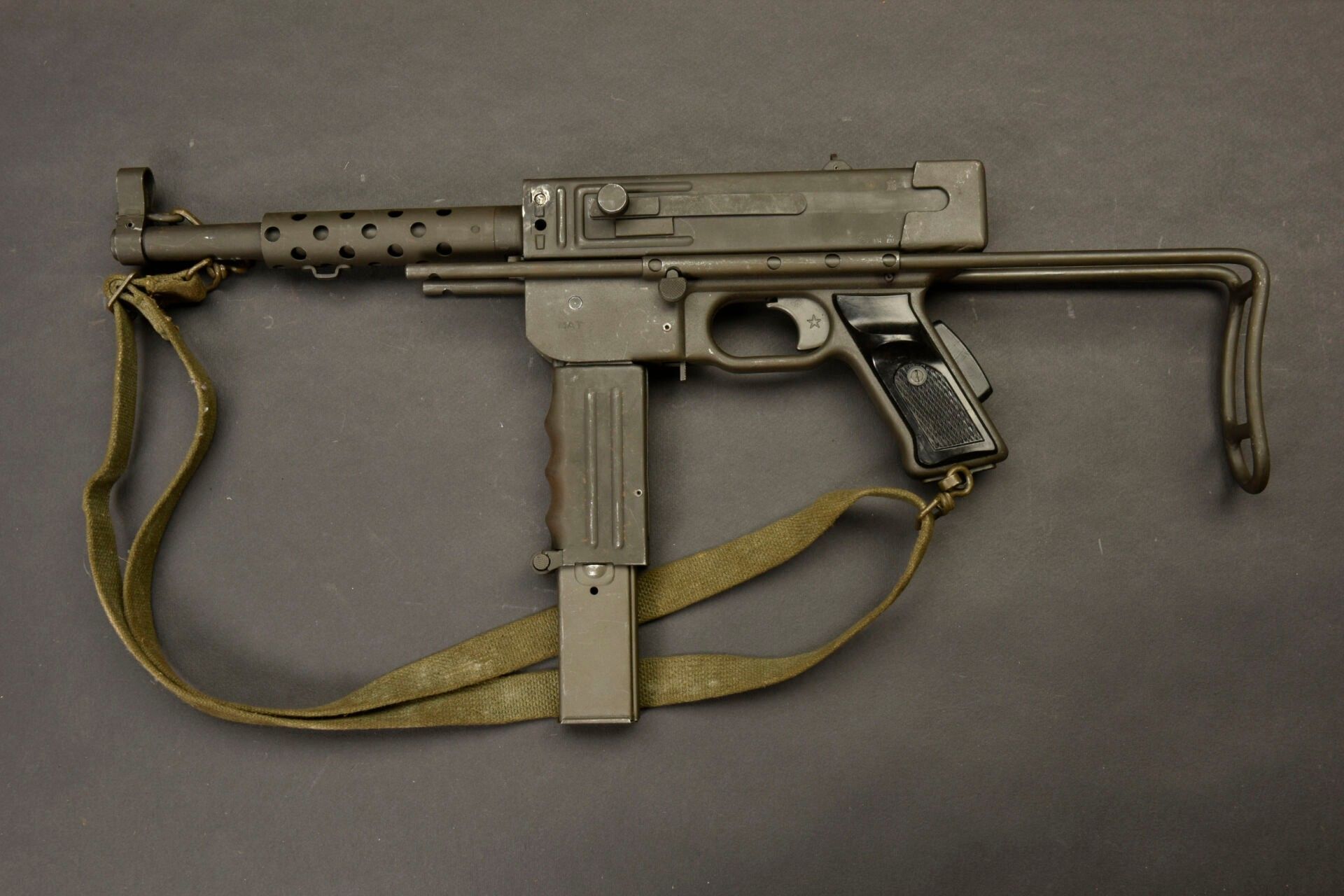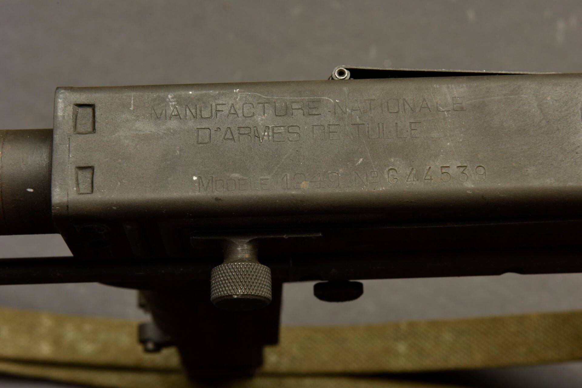 MAT 49 machine pistol. Metal fittings in perfect condition. Magazine present. Folding stock. Black bakelite grips. Breech and magazine blocked by neutralisation. Complete canvas sling. Manufacture of the weapons of Tulle, M1949 type 2. Number G44539. Some wear and patina. Condition II+. Category C9 weapon. Firearms neutralised EU 2017. At the time of purchase, the purchaser must present a valid identity document (CNI or passport) and according to the case, either an original medical certificate of less than 1 month + account SIA-holder, or a copy of both sides of the hunting licence accompanied by validation for the current year or year n-1 and the SIA-holder's account, or the sports shooting licence for the current year (licence + licence certificate downloaded from EDEN-ITAC + the sports shooter's SIA-holder's account). If the billing address is different from that shown on the identity document, proof of address less than 1 month old must be produced. The transaction will not take place until FINIADA has been consulted. The formalities and consultation of this file will be invoiced at €50 per weapon purchased (€25 inc. VAT for a professional buyer).