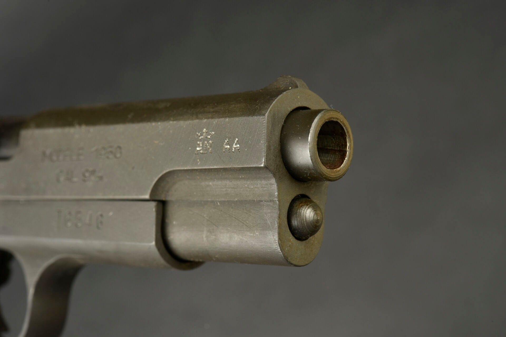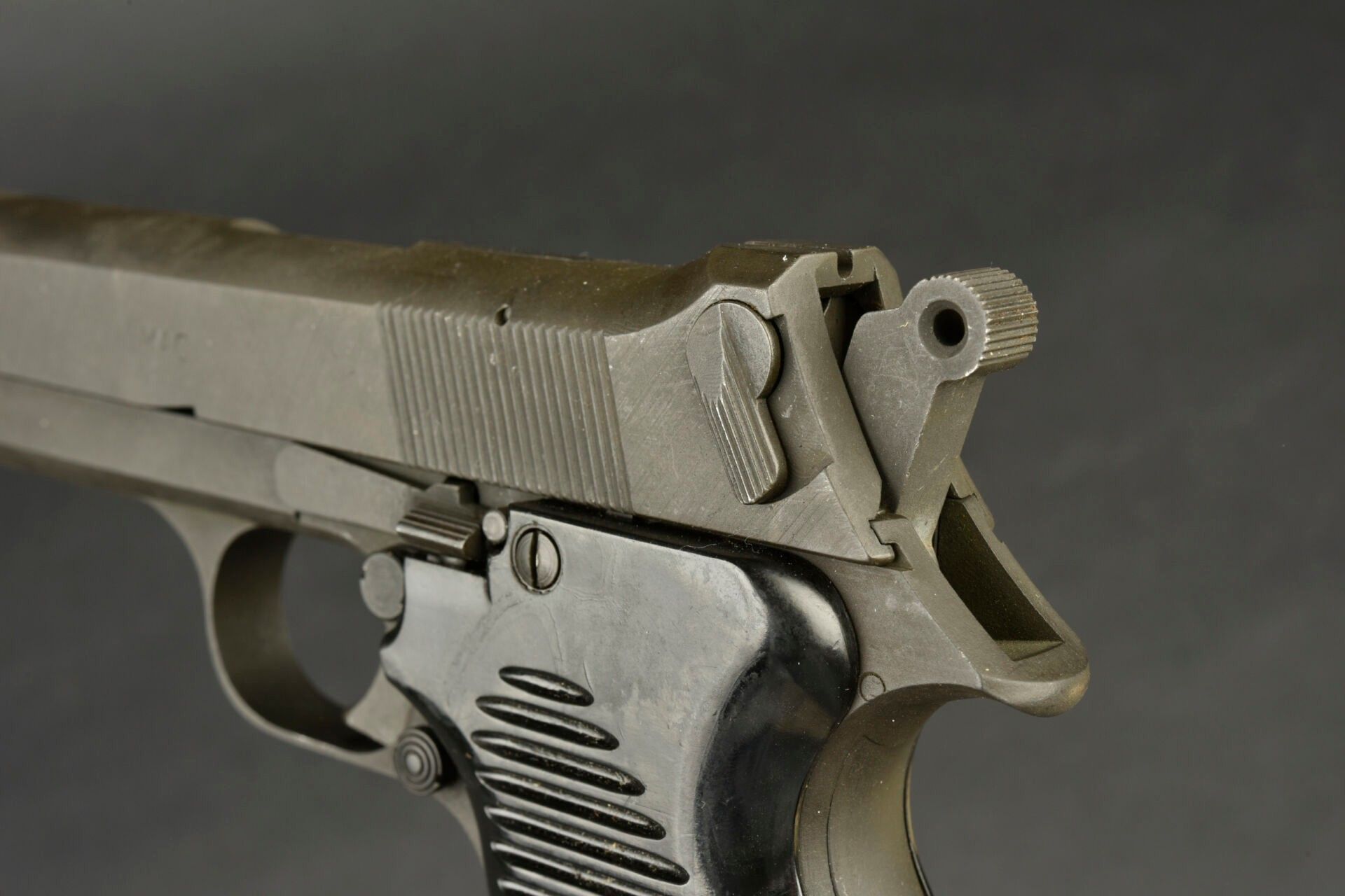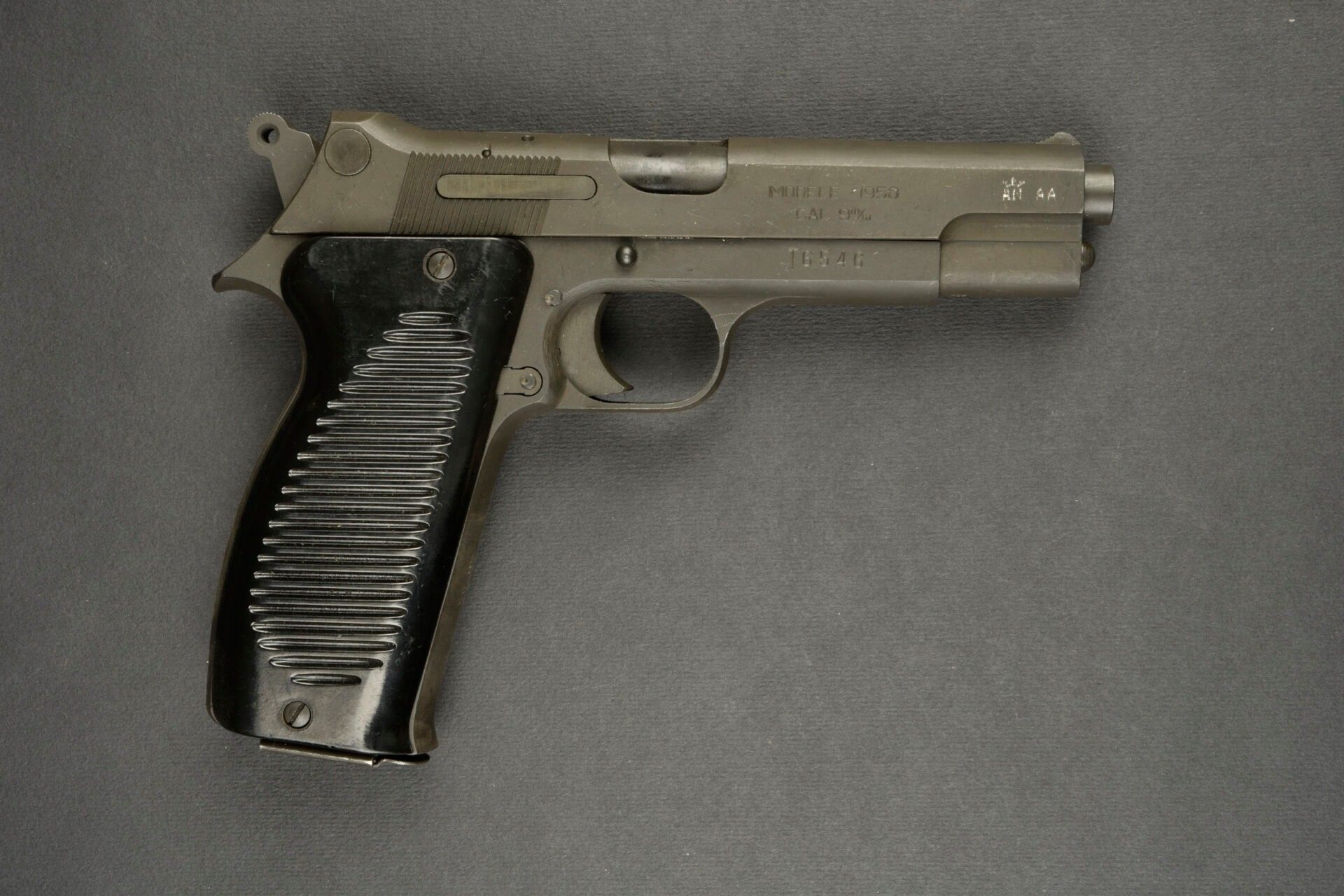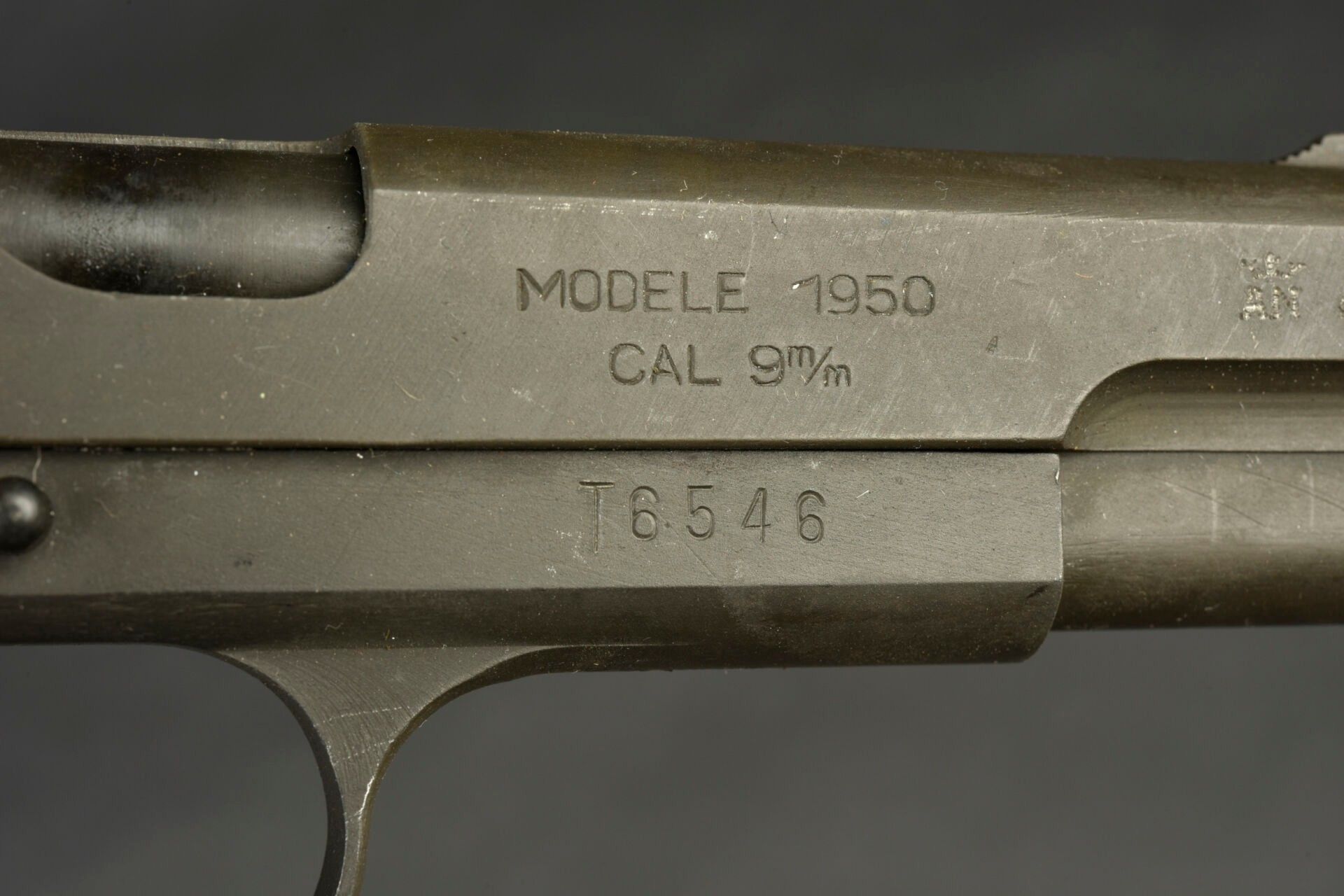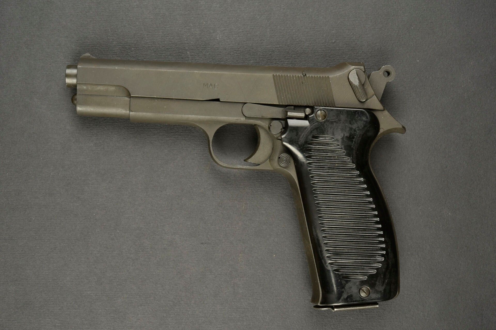 MAC 50 pistol. Manufactured by Manufacture d'Armes de Châtellerault. Number T6546. Black bakelite plate. Magazine and breech blocked by neutralisation. 90% original tanning. . Some wear and patina. Condition II+ Category C9. Firearms neutralised EU 2017. At the time of the purchase, the purchaser must present a valid identity document (CNI or passport) and according to the case, either an original medical certificate of less than 1 month + account SIA-holder, or a copy of both sides of the hunting licence accompanied by validation for the current year or year n-1 and the SIA-holder's account, or the sports shooting licence for the current year (licence + licence certificate downloaded from EDEN-ITAC + the sports shooter's SIA-holder's account). If the billing address is different from that shown on the identity document, proof of address less than 1 month old must be produced. The transaction will not take place until FINIADA has been consulted. The formalities and consultation of this file will be invoiced at €50 per weapon purchased (€25 inc. VAT for a professional buyer).