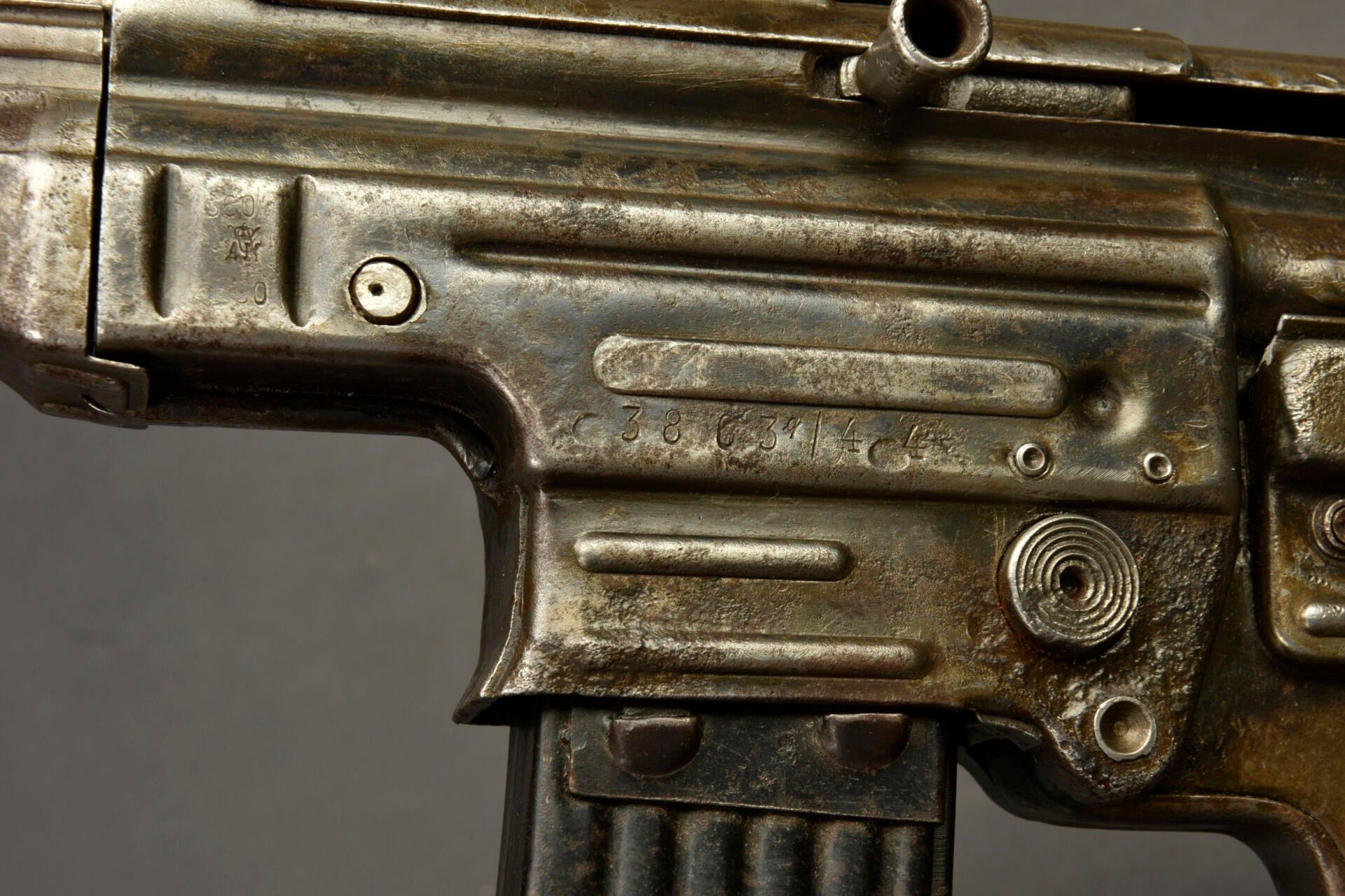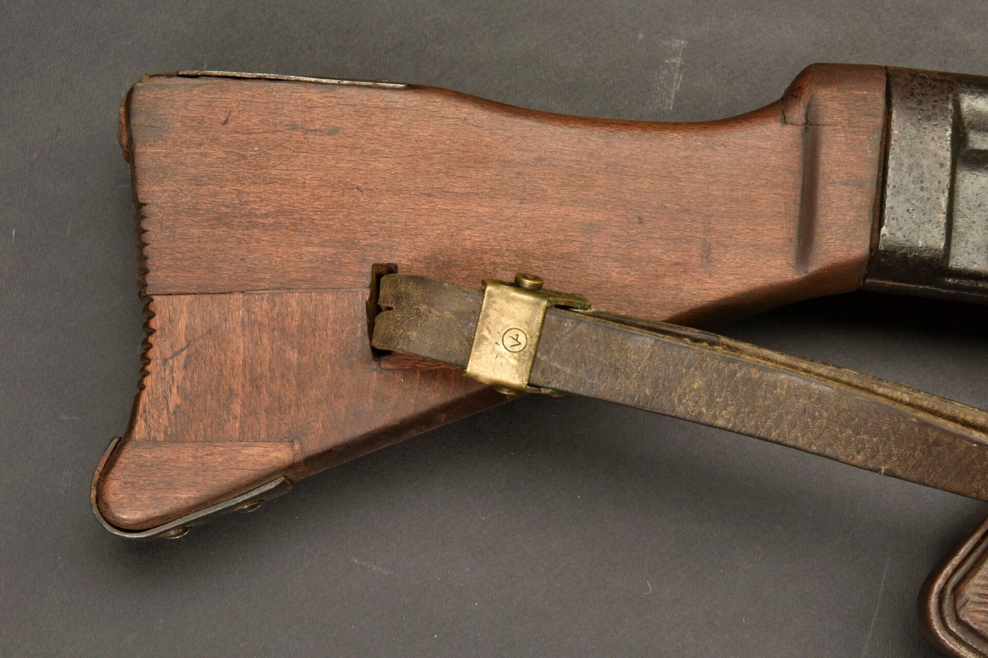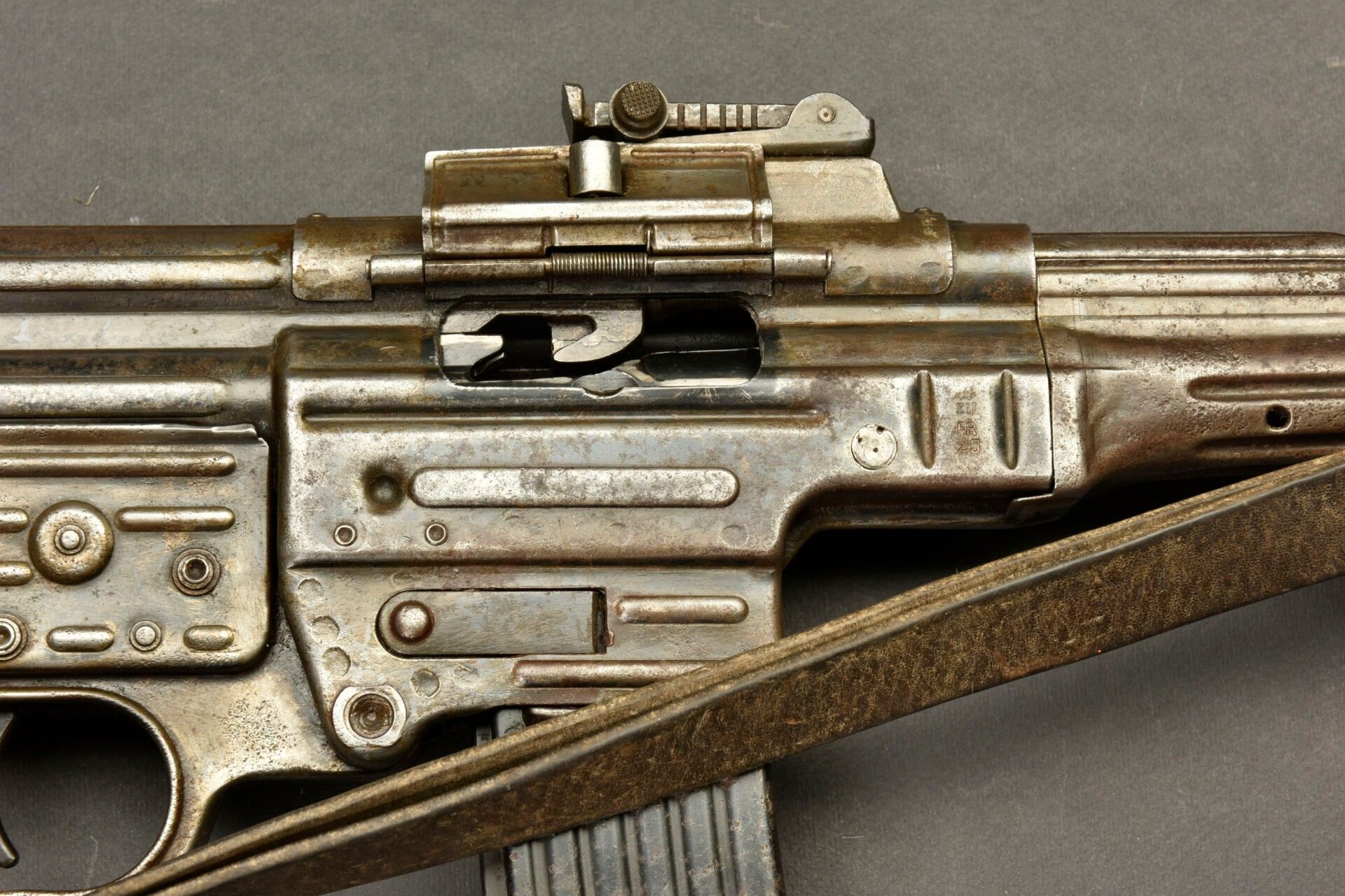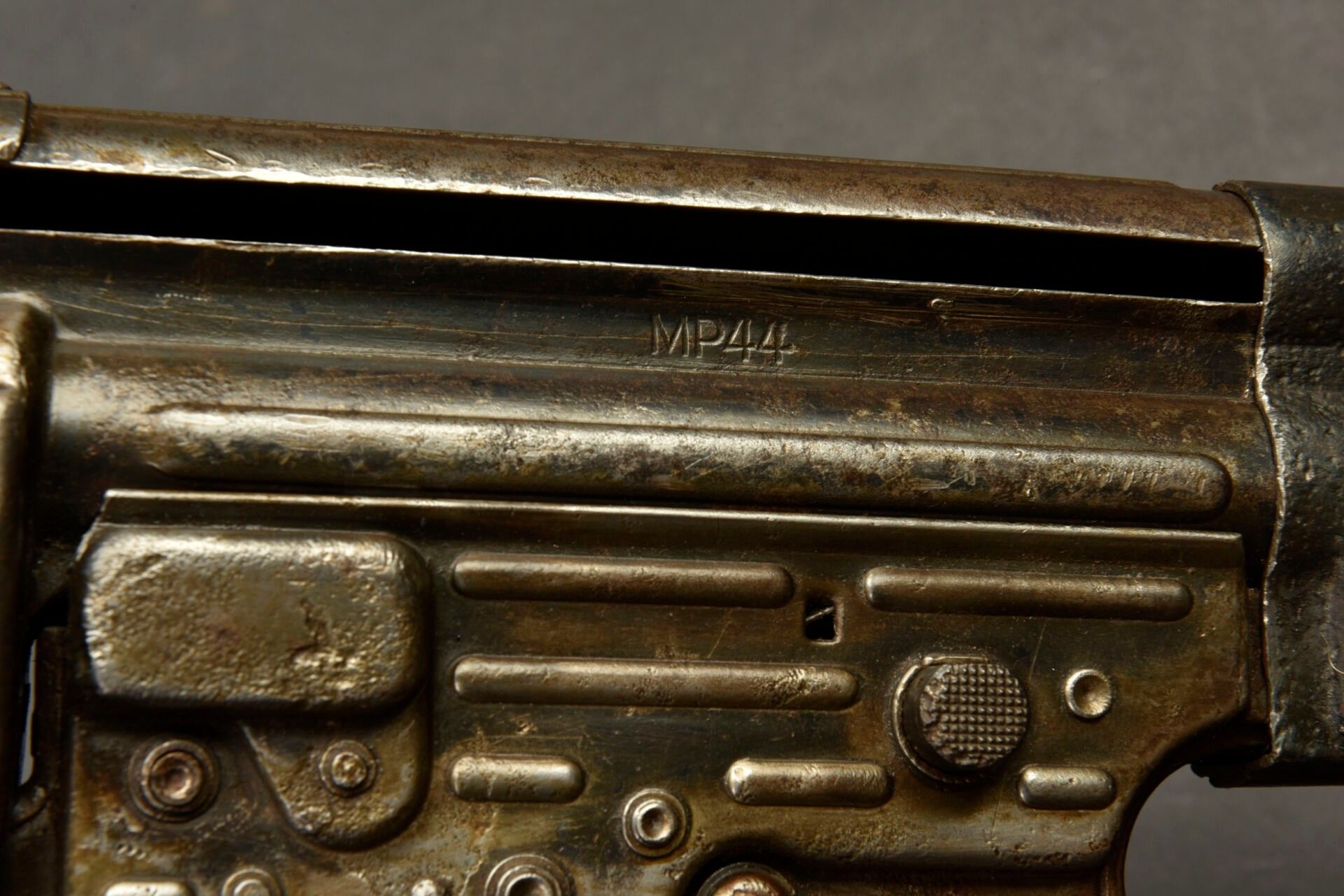 MP44 machine pistol. Heavily oxidised metal fittings. Brown bakelite grips. Wooden stock complete but cracked, probably a later model. FXO manufacture. Number 3863. Beautifully marked MP44. Magazine blocked by neutralisation, marked MP 44. Breech made mobile by the neutralization +. Nice leather strap. Some wear and patina. Condition II+. C9 category weapon. Firearms deactivated EU 2017. At the time of purchase, the purchaser must present a valid identity document (CNI or passport) and according to the case, either an original medical certificate of less than 1 month + account SIA-holder, or a copy of both sides of the hunting licence accompanied by validation for the current year or year n-1 and the SIA-holder's account, or the sports shooting licence for the current year (licence + licence certificate downloaded from EDEN-ITAC + the sports shooter's SIA-holder's account). If the billing address is different from that shown on the identity document, proof of address less than 1 month old must be produced. The transaction will not take place until FINIADA has been consulted. The formalities and consultation of this file will be invoiced at €50 per weapon purchased (€25 inc. VAT for a professional buyer).