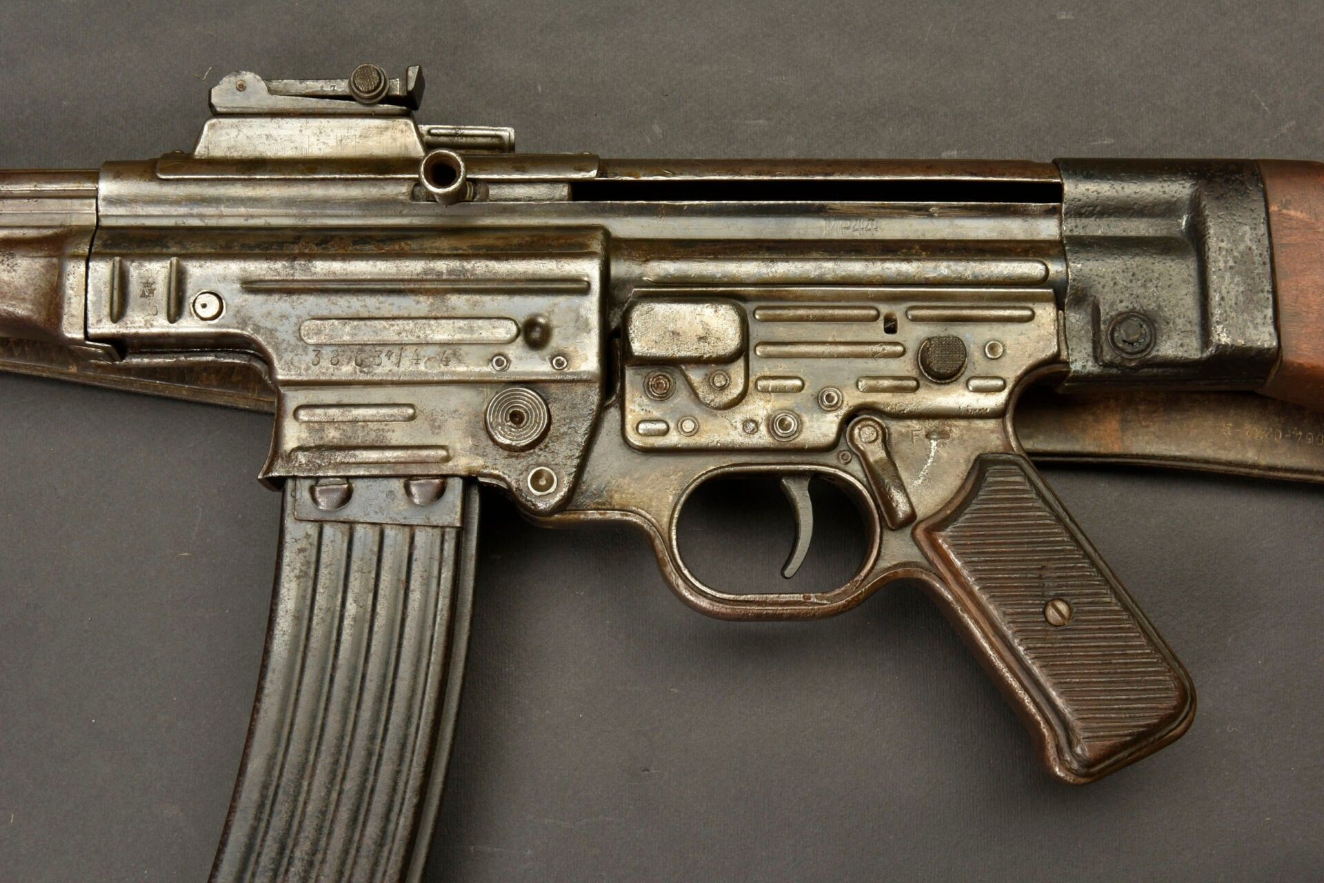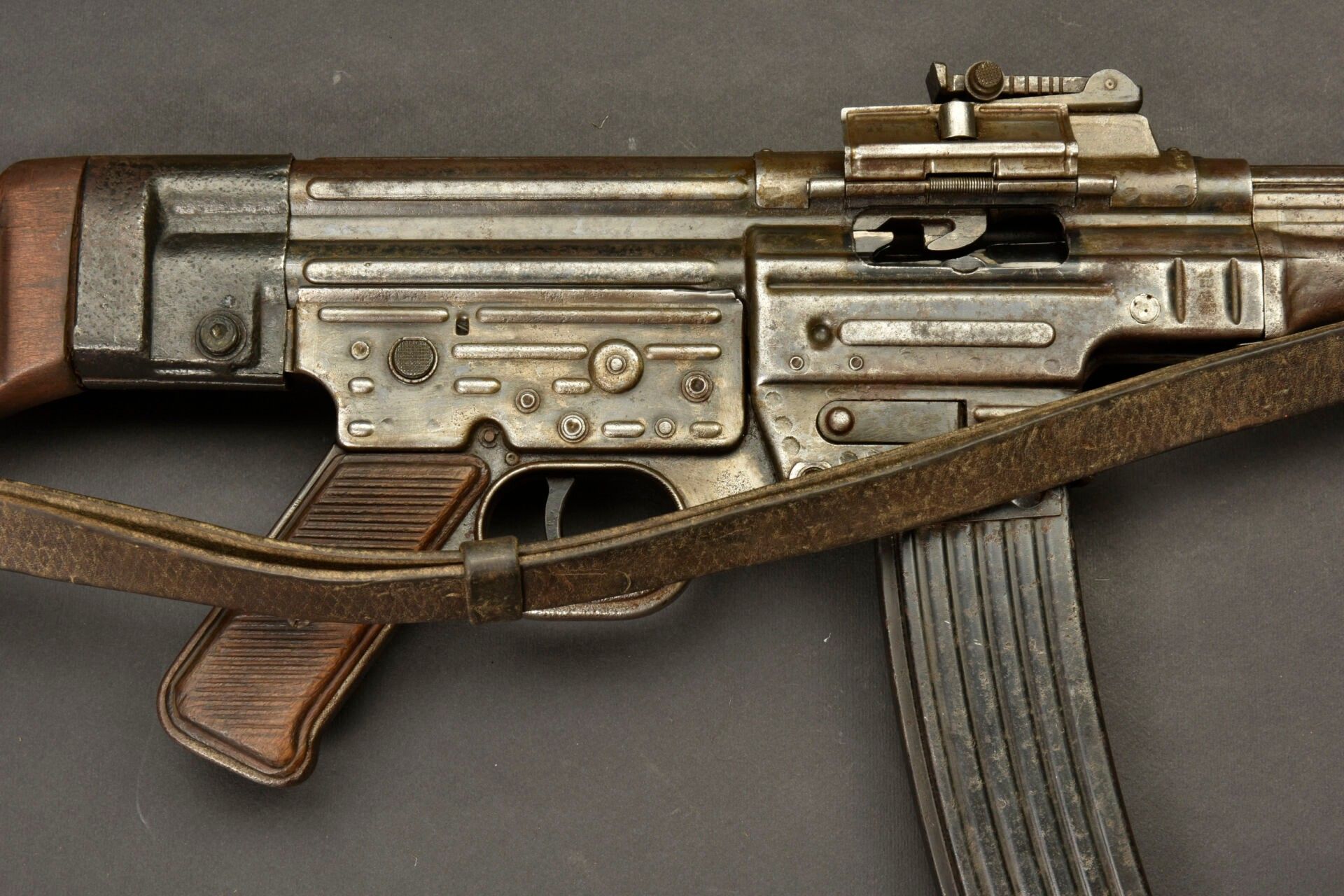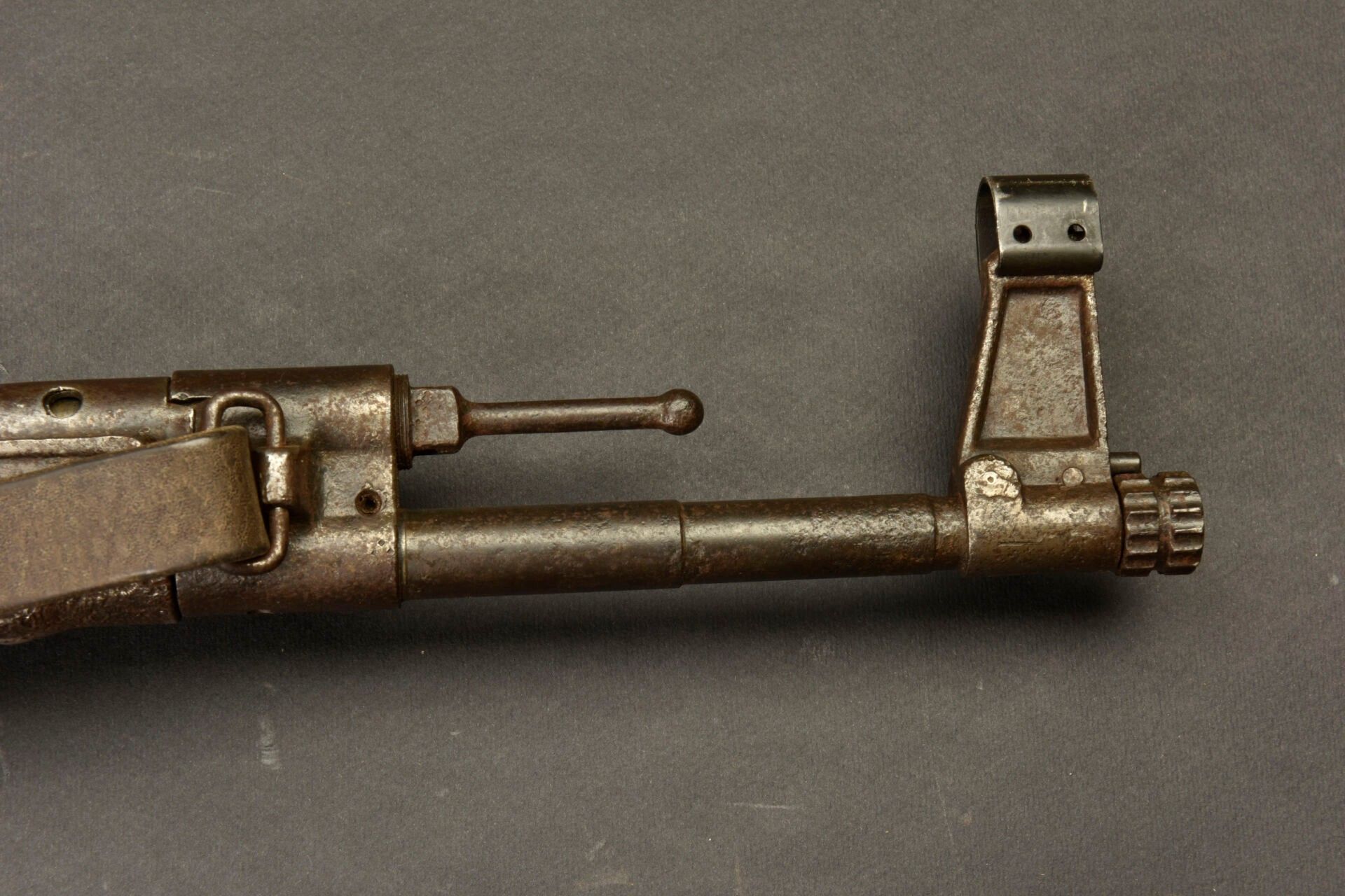 MP44 machine pistol. Heavily oxidised metal fittings. Brown bakelite grips. Wooden stock complete but cracked, probably a later model. FXO manufacture. Number 3863. Beautifully marked MP44. Magazine blocked by neutralisation, marked MP 44. Breech made mobile by the neutralization +. Nice leather strap. Some wear and patina. Condition II+. C9 category weapon. Firearms deactivated EU 2017. At the time of purchase, the purchaser must present a valid identity document (CNI or passport) and according to the case, either an original medical certificate of less than 1 month + account SIA-holder, or a copy of both sides of the hunting licence accompanied by validation for the current year or year n-1 and the SIA-holder's account, or the sports shooting licence for the current year (licence + licence certificate downloaded from EDEN-ITAC + the sports shooter's SIA-holder's account). If the billing address is different from that shown on the identity document, proof of address less than 1 month old must be produced. The transaction will not take place until FINIADA has been consulted. The formalities and consultation of this file will be invoiced at €50 per weapon purchased (€25 inc. VAT for a professional buyer).