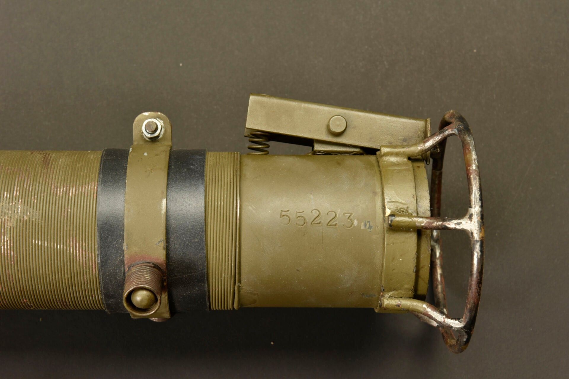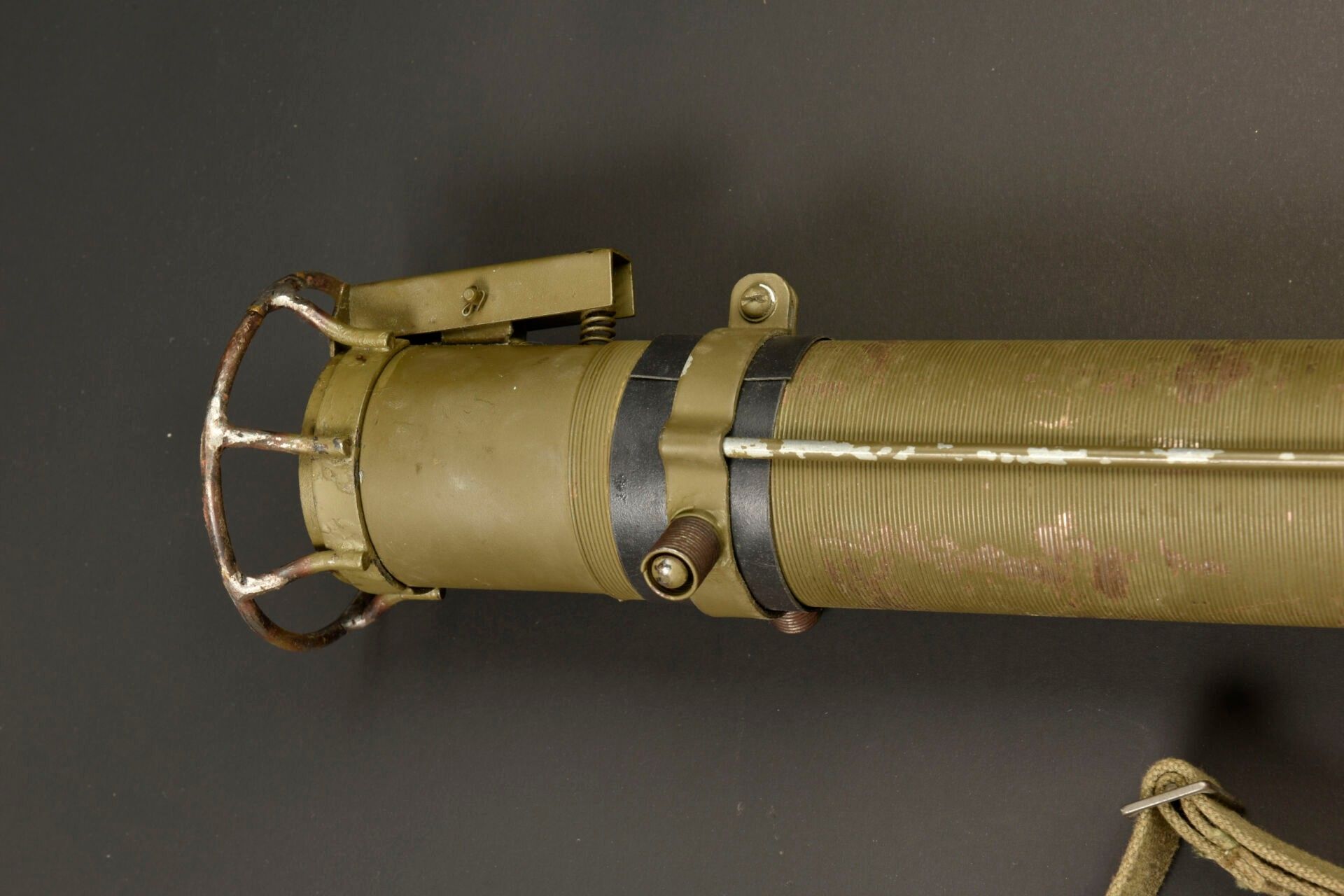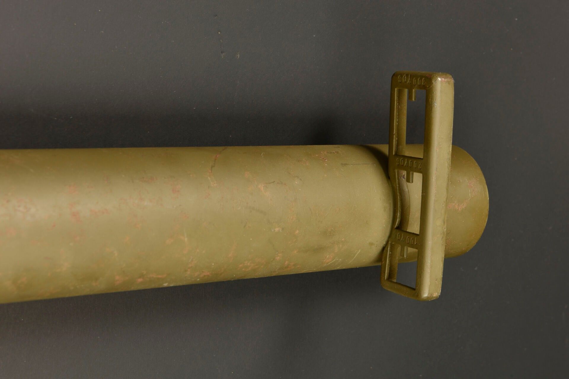 Reproduction of a US M1A1 bazooka. Fine metal workmanship. Wooden handle and shoulder pad. Canvas shoulder strap. Number 3268 in white paint on wooden shoulder pad. Number 55223 engraved on the weapon. 90% khaki paint. Some wear and patina. Condition II+. Not classified.