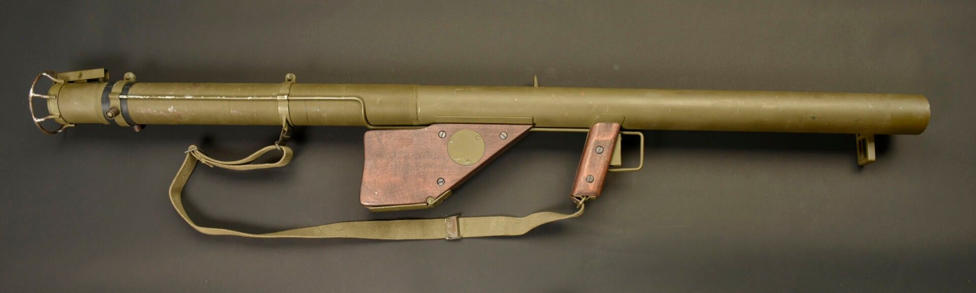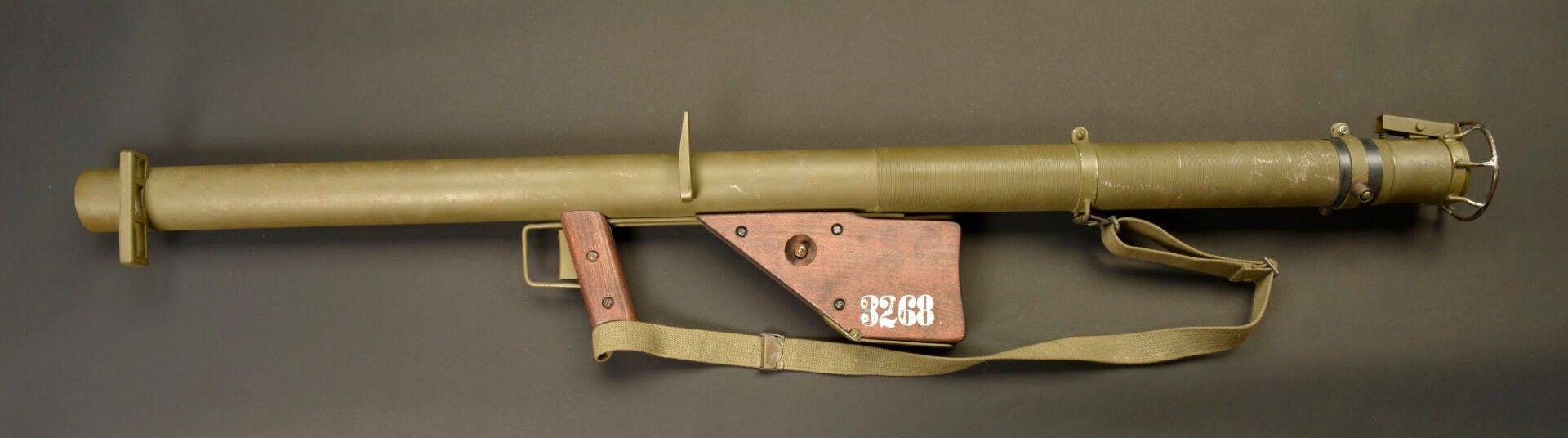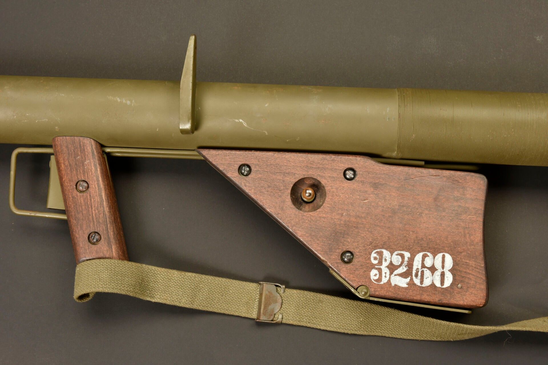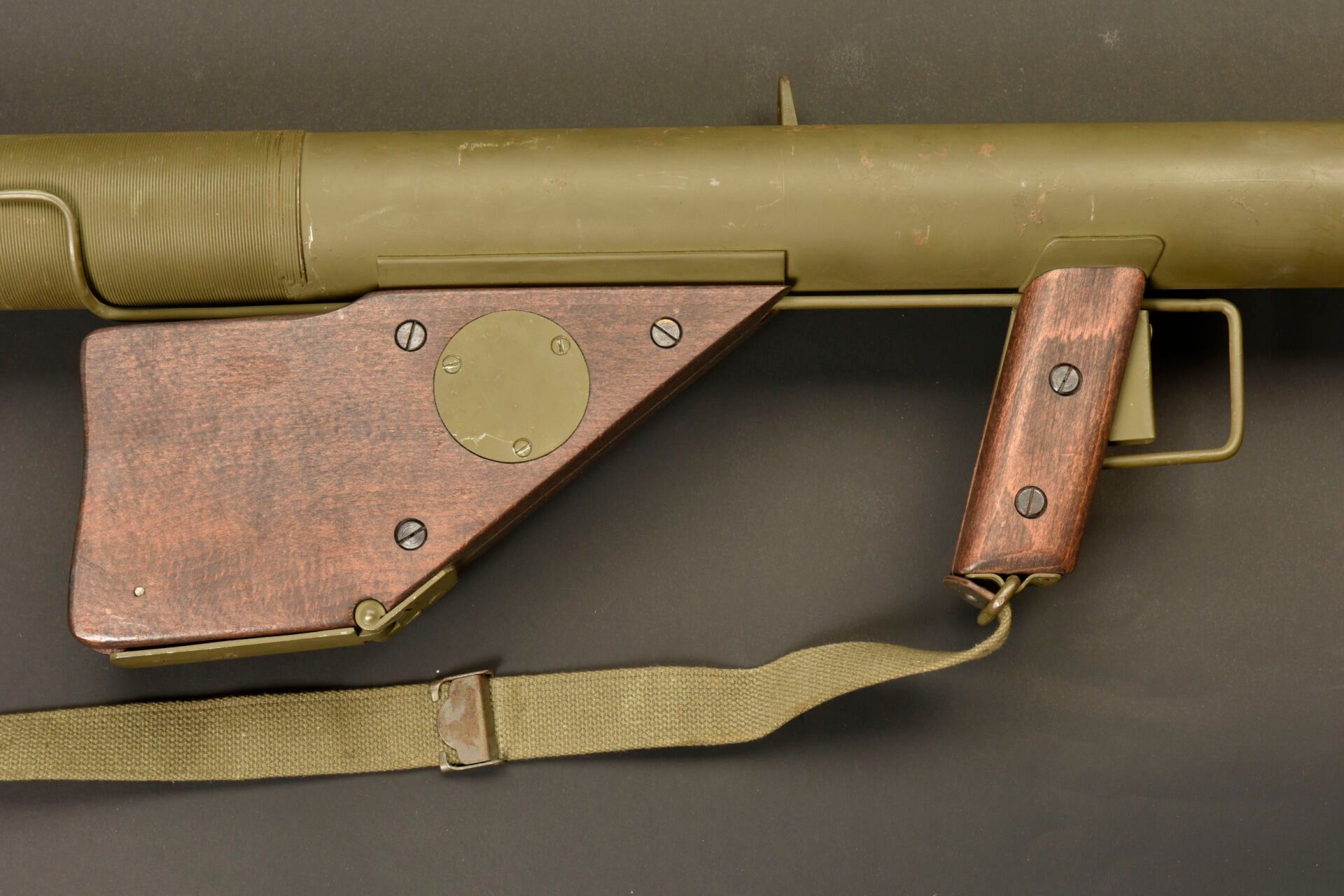 Reproduction of a US M1A1 bazooka. Fine metal workmanship. Wooden handle and shoulder pad. Canvas shoulder strap. Number 3268 in white paint on wooden shoulder pad. Number 55223 engraved on the weapon. 90% khaki paint. Some wear and patina. Condition II+. Not classified.