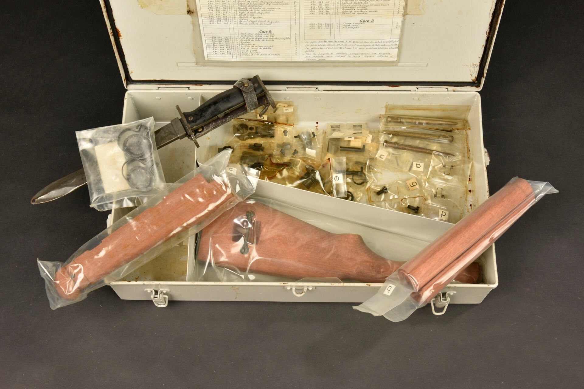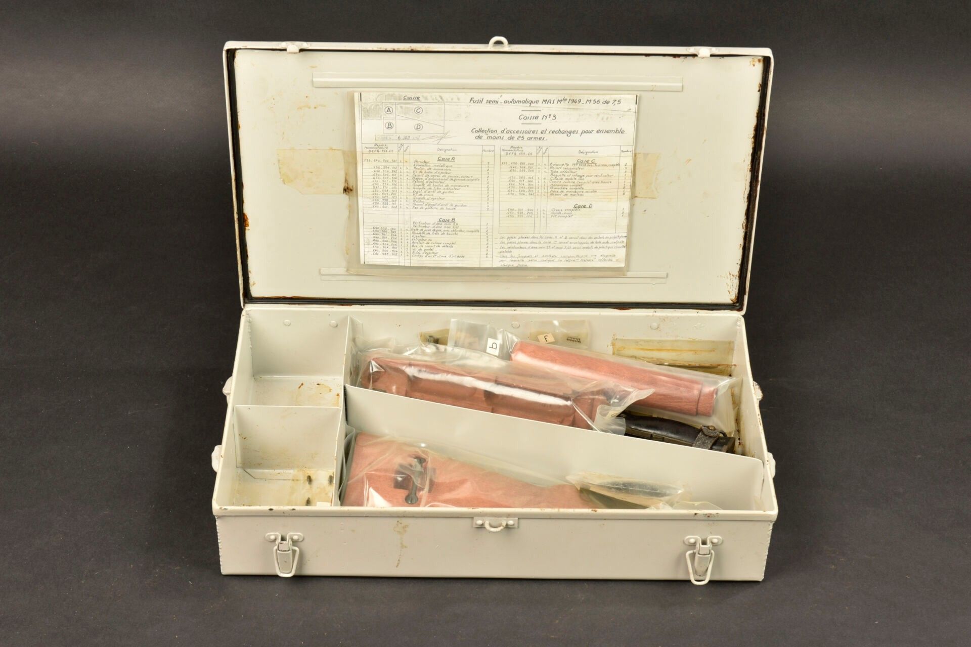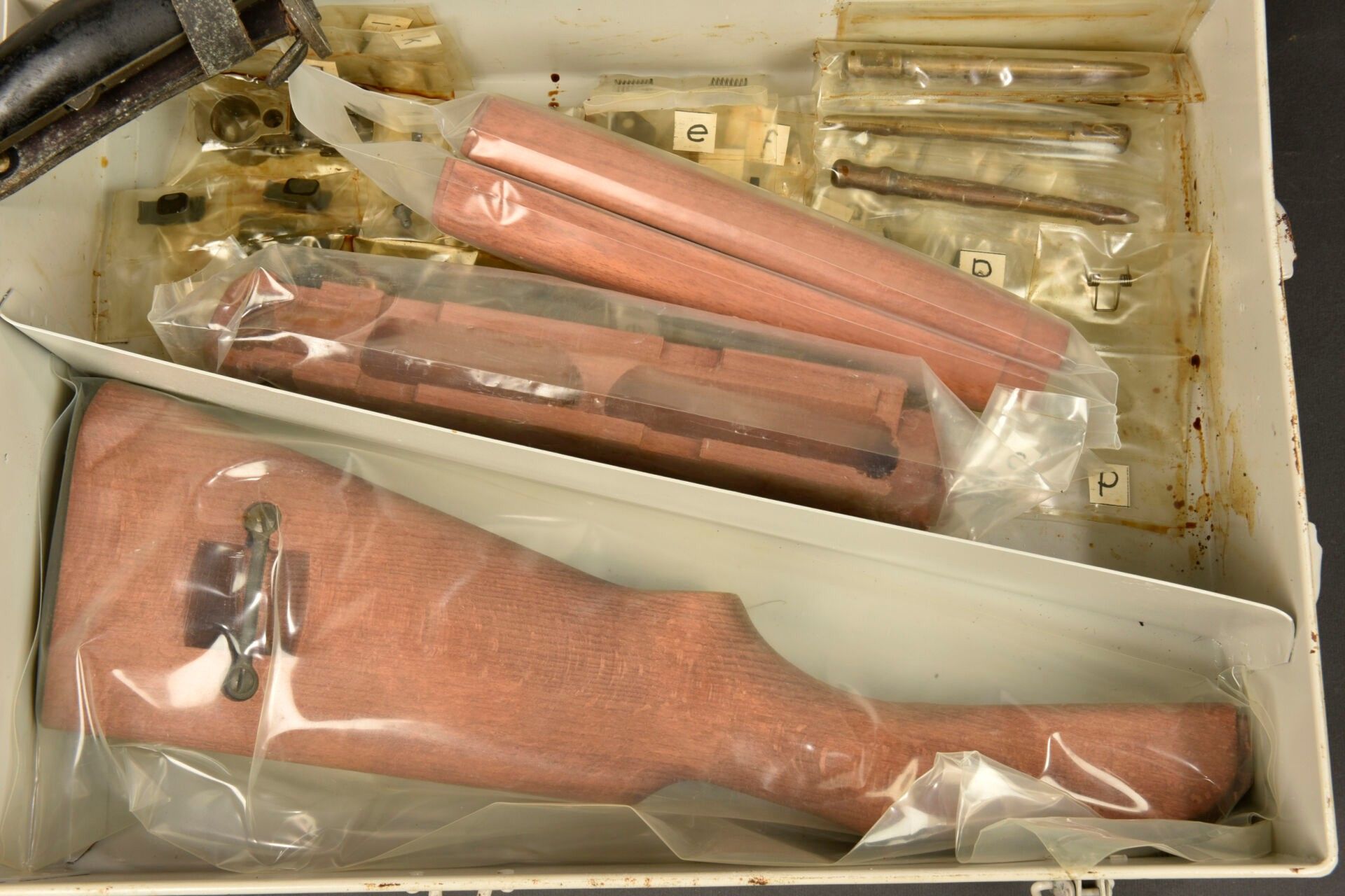 Accessory box for MAS 49/56. Case number 3 in original grey paint containing one spare stock in mint condition, one sling loop, two handguards and one barrel, five bare extractors, extractor pin, various springs, 5 firing pins and one mint condition 47/56 bayonet dated 1965. Condition I-