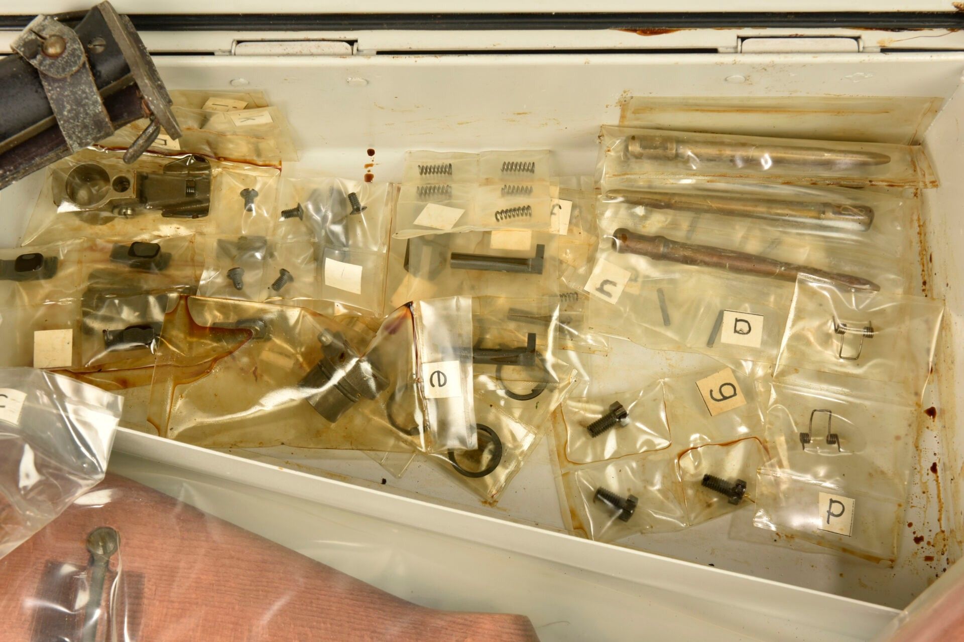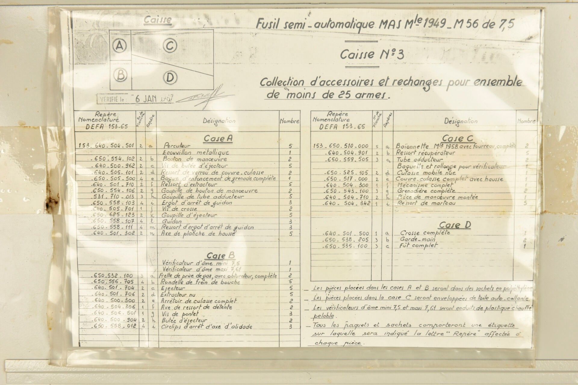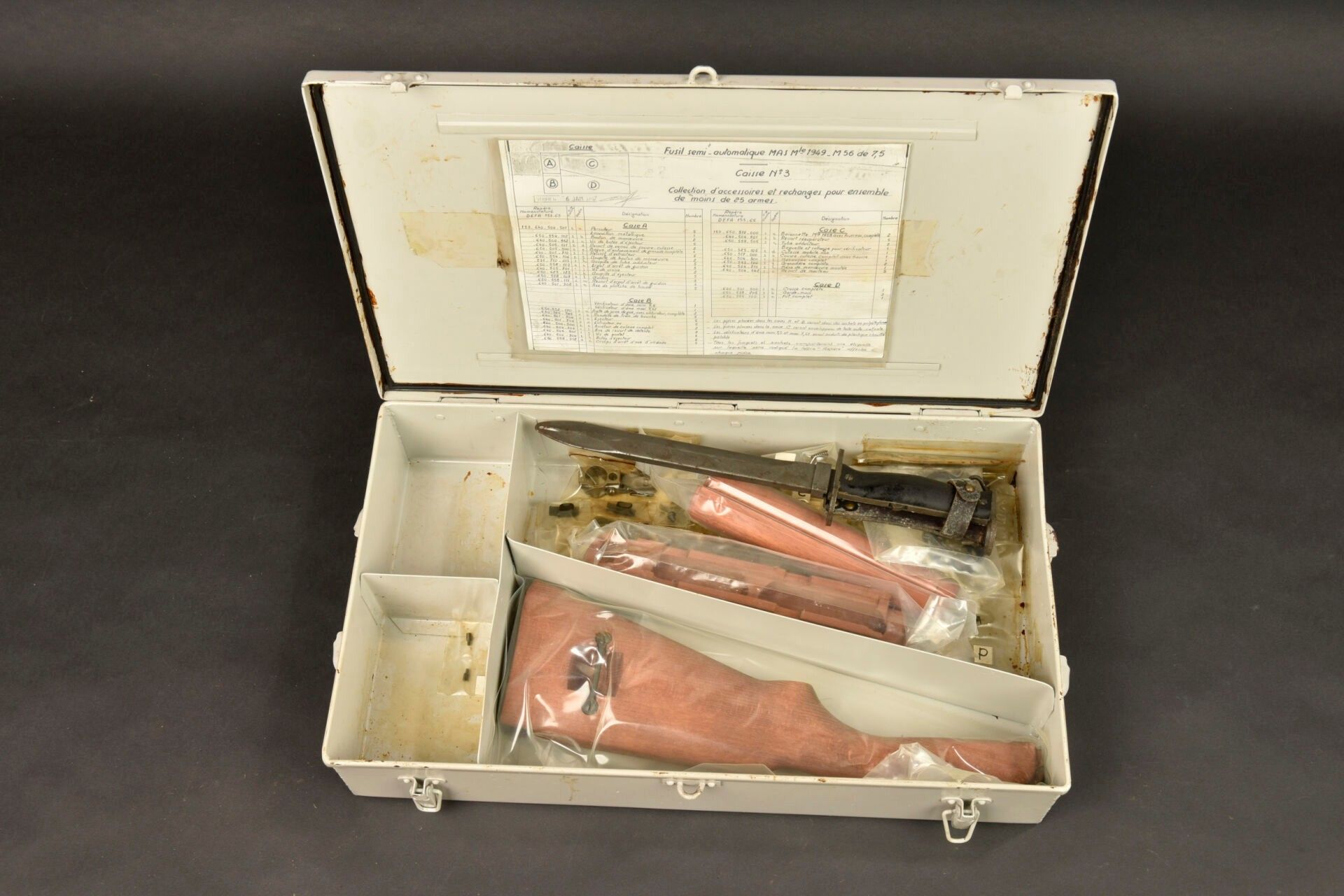 Accessory box for MAS 49/56. Case number 3 in original grey paint containing one spare stock in mint condition, one sling loop, two handguards and one barrel, five bare extractors, extractor pin, various springs, 5 firing pins and one mint condition 47/56 bayonet dated 1965. Condition I-