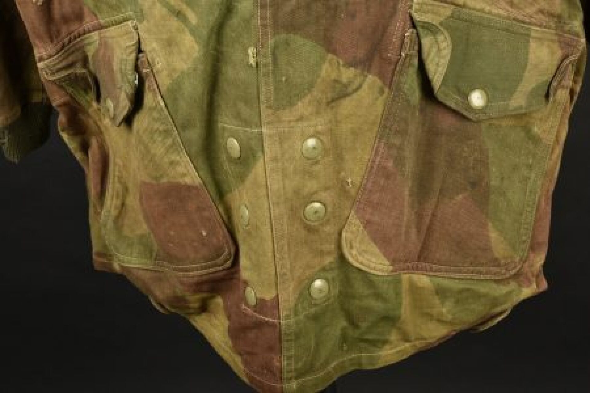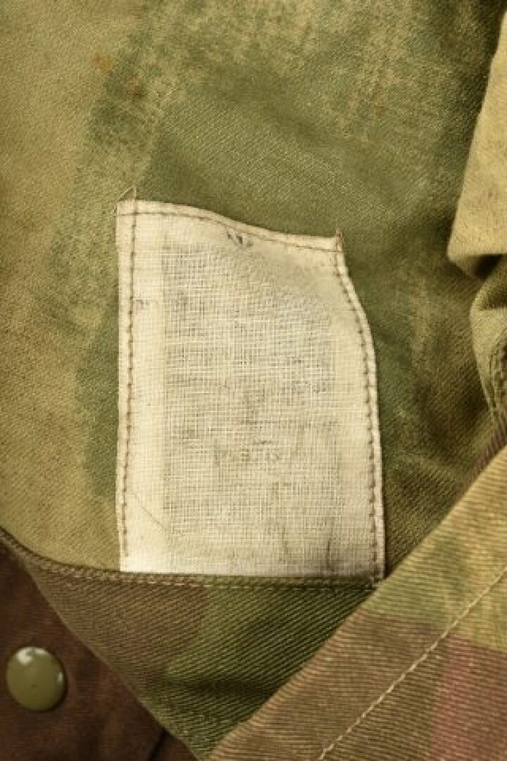 Denison Smok. Camouflage fabric. All buttons are present. Snaps are functional. Collar lined with thick brown cloth. Zipper incomplete, marked Swift. Beaver tail present. Label present but illegible. Felt at bottom of sleeves heavily moth-eaten. Post-war model. Some wear and patina, as well as stains and tears. Condition II+. 2+